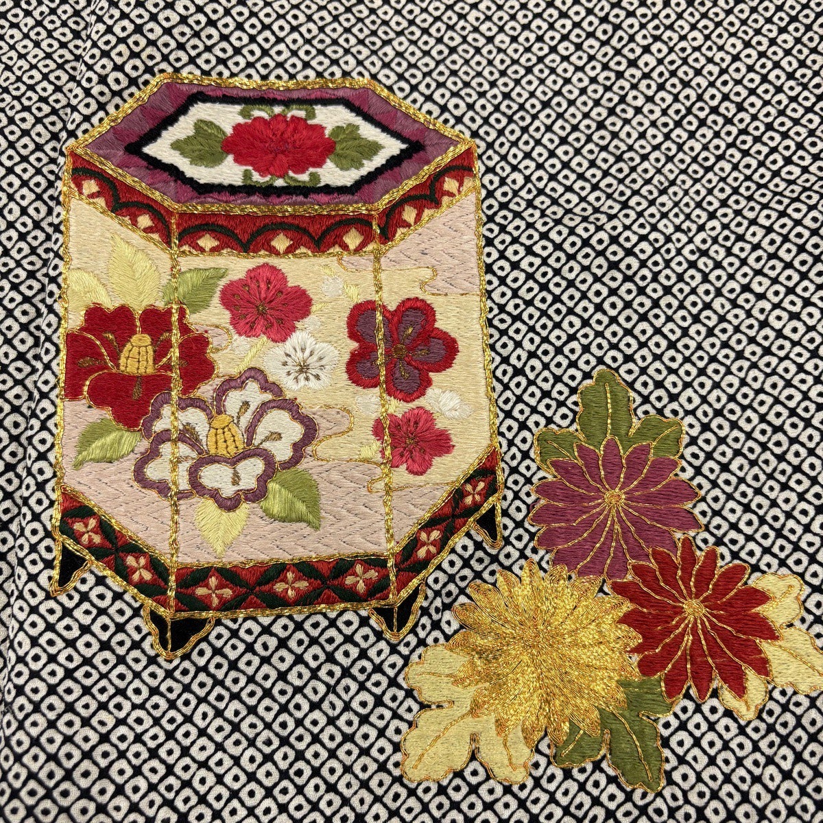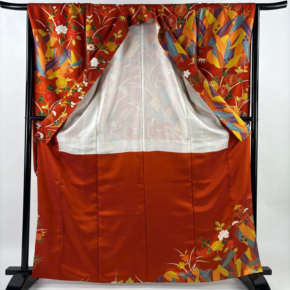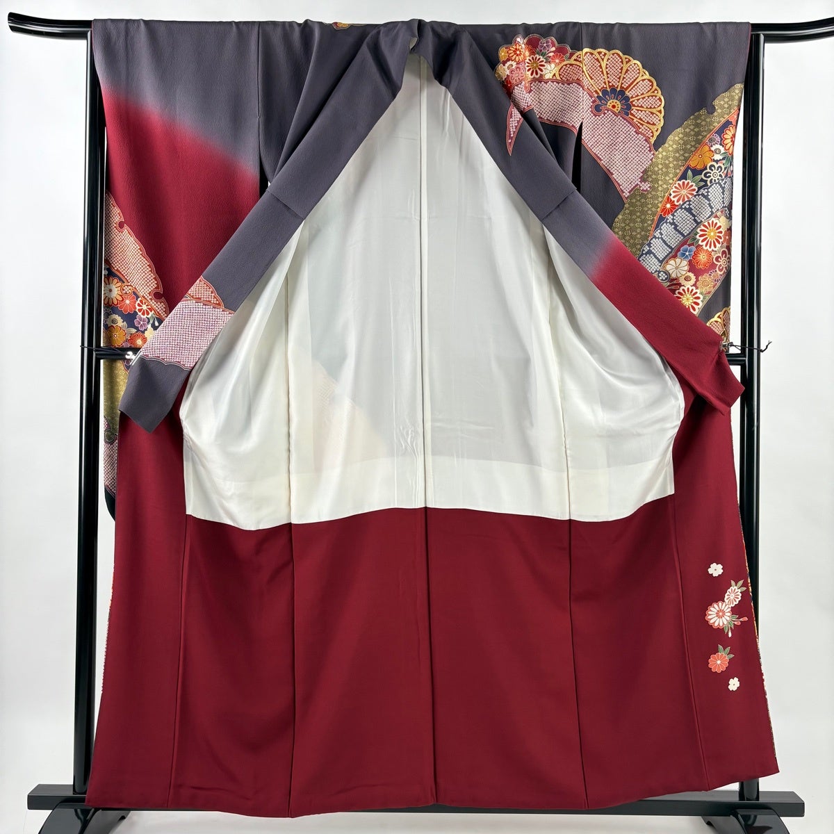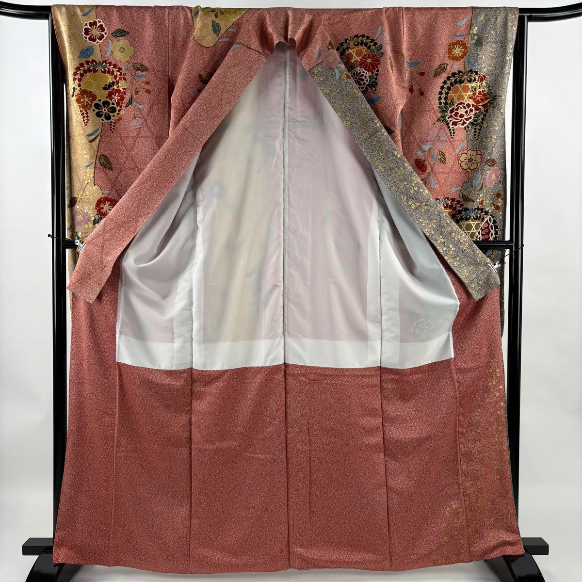 振袖 身丈161.5cm 裄丈66cm M 袷 貝桶 草花 金糸 刺繍 黒 正絹 秀品