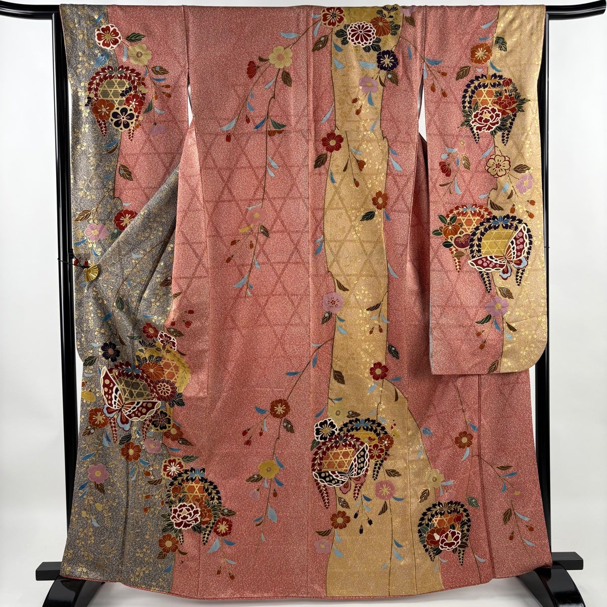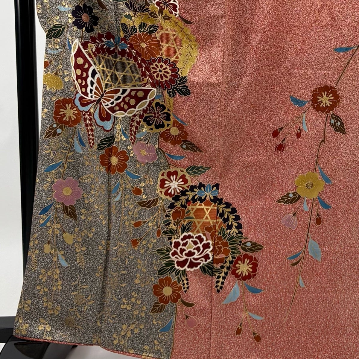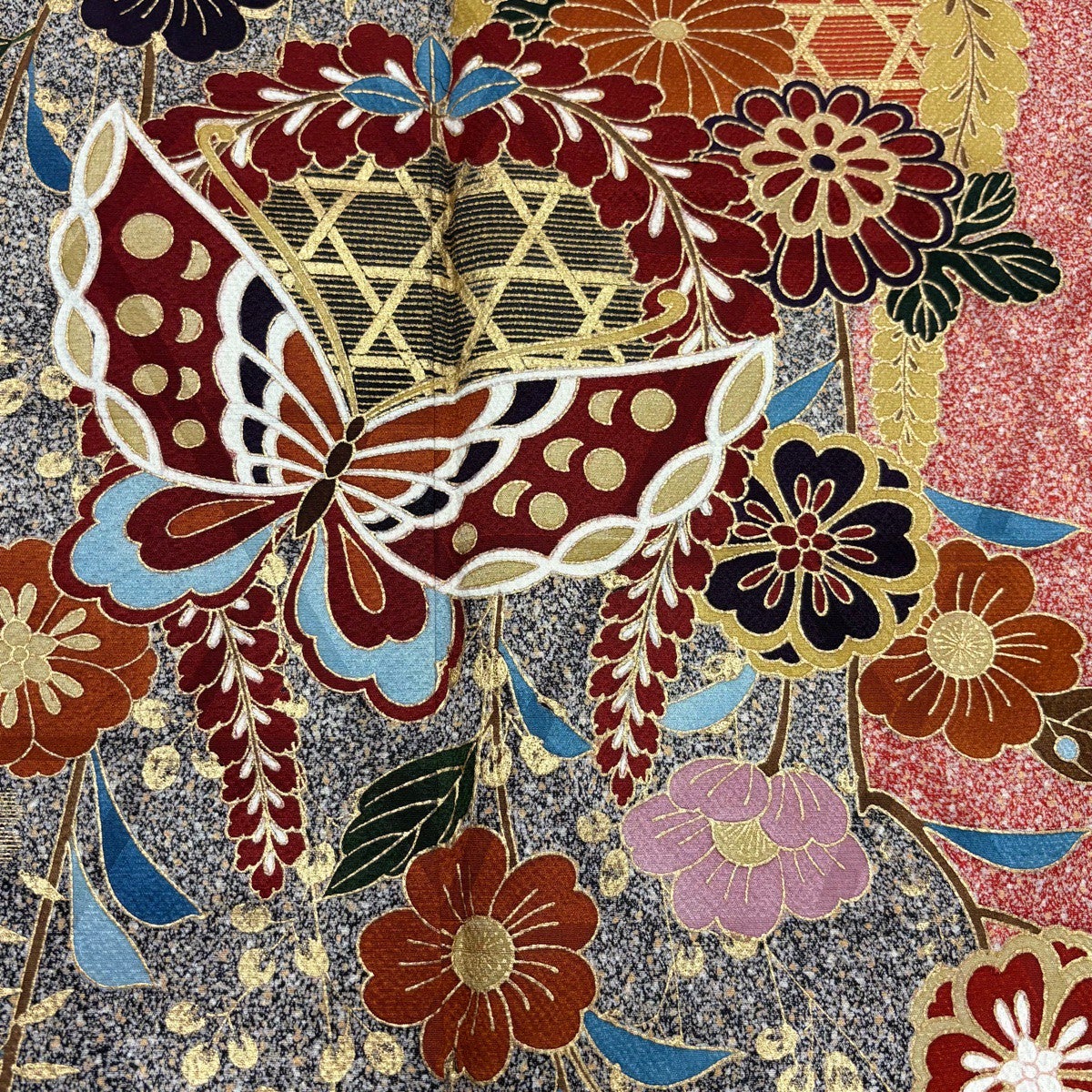 振袖 身丈164.5cm 裄丈65cm M 袷 蝶 桜 金彩 染め分け 朱色 正絹 秀品