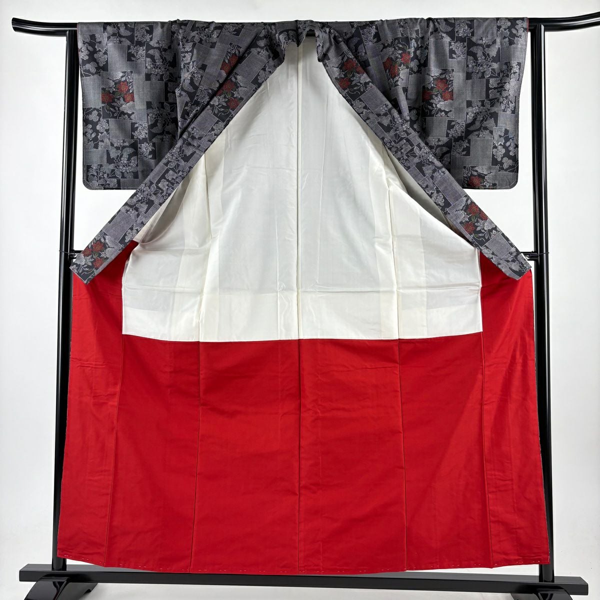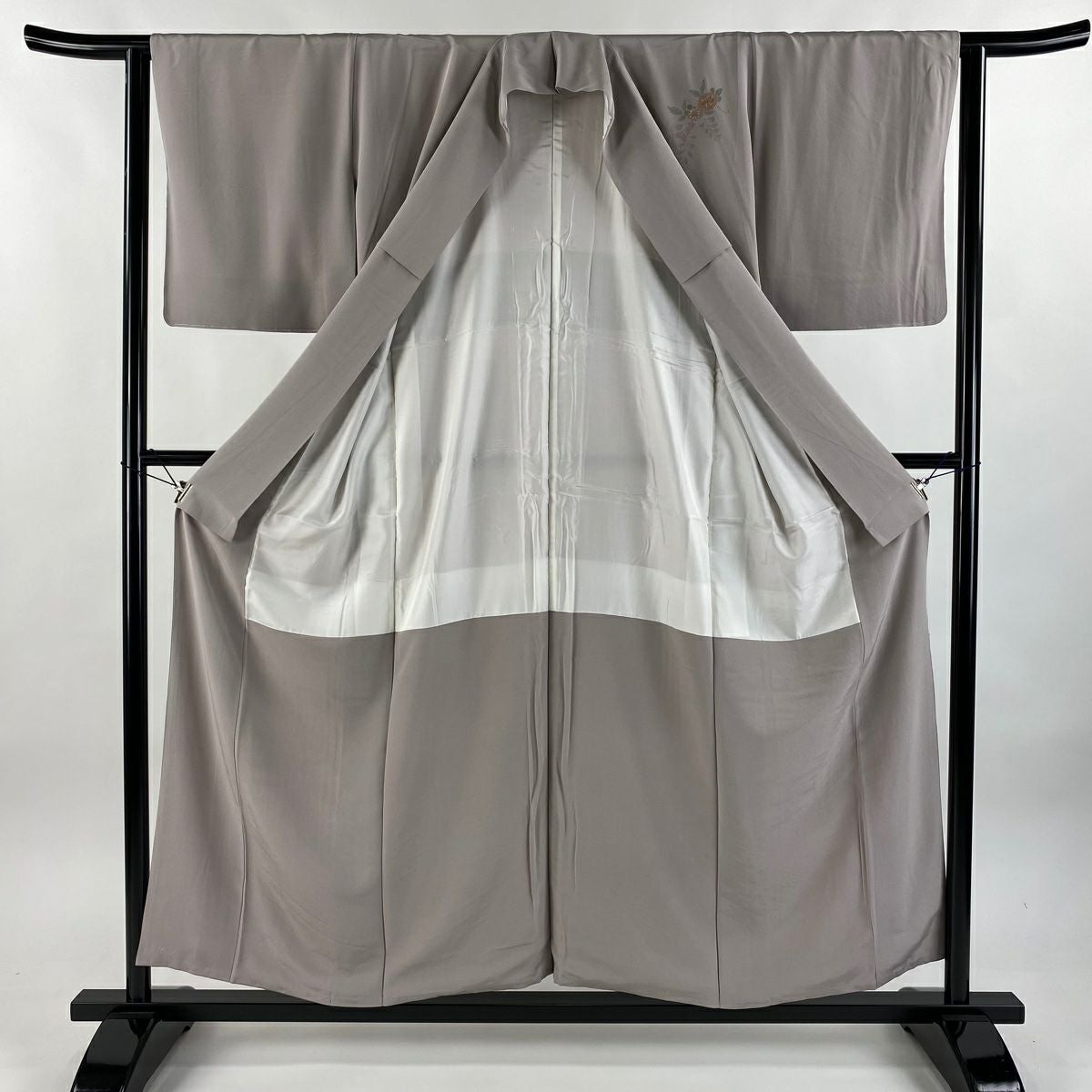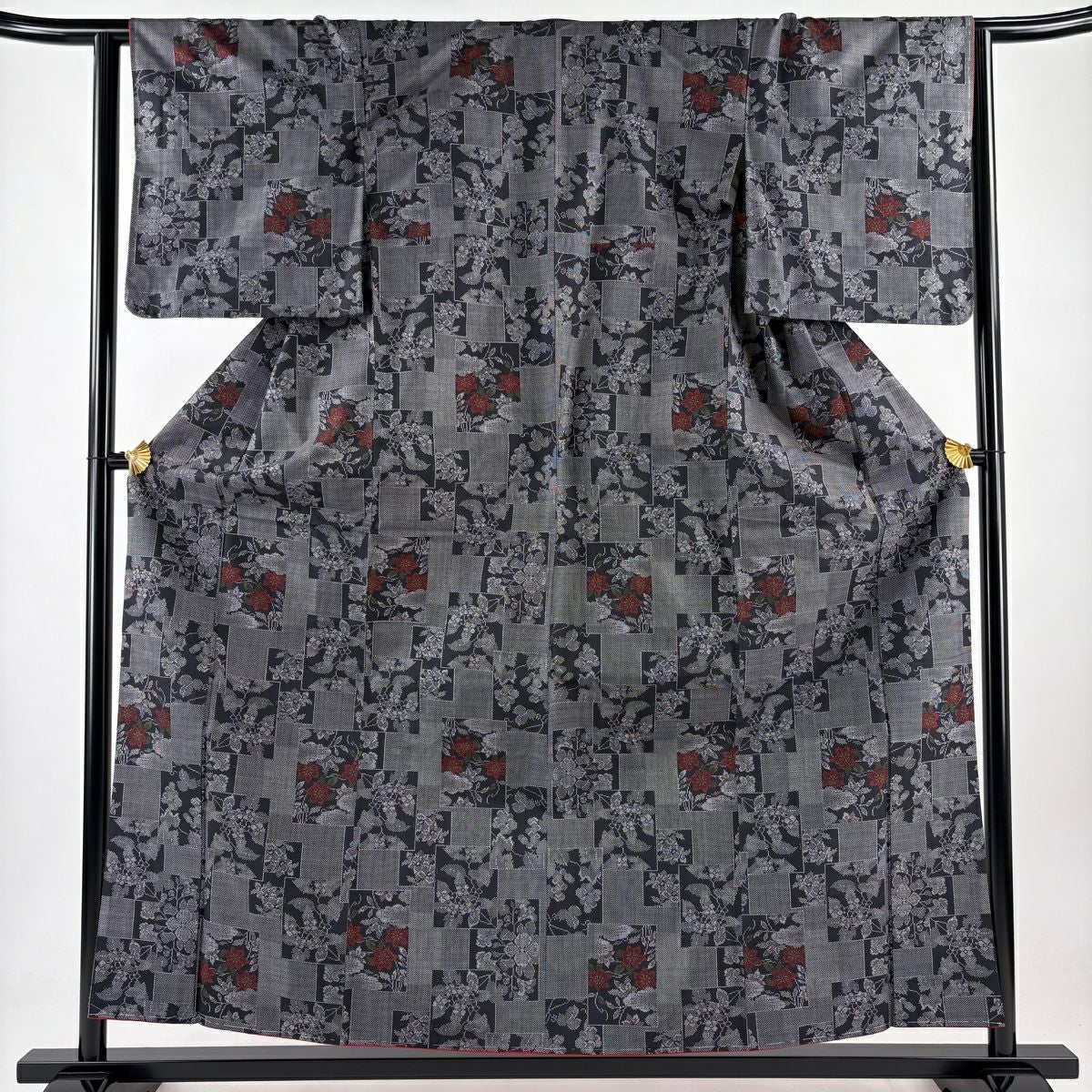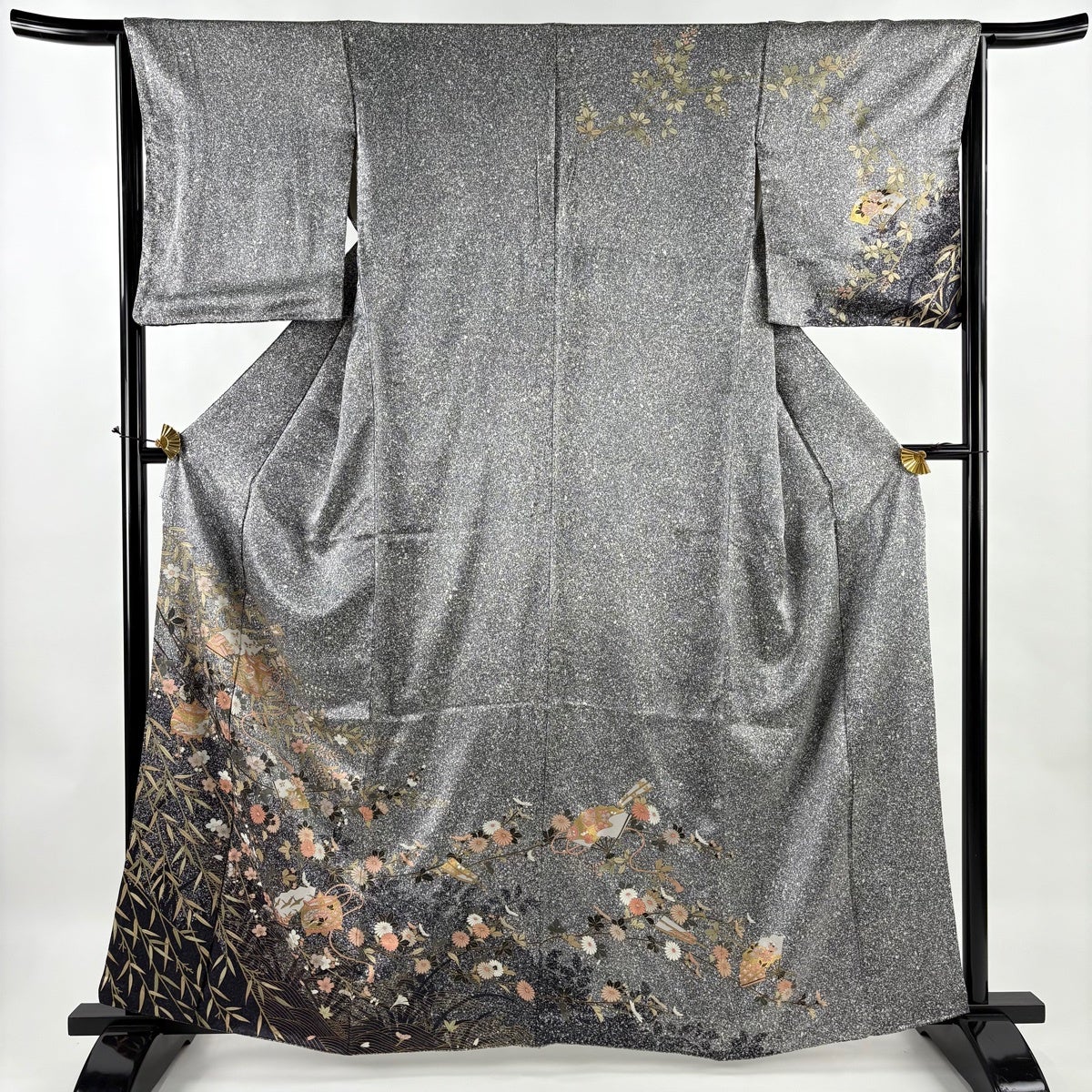 訪問着 身丈162cm 裄丈64.5cm M 袷 草花 糸巻き 金彩 黒灰 正絹 秀品
