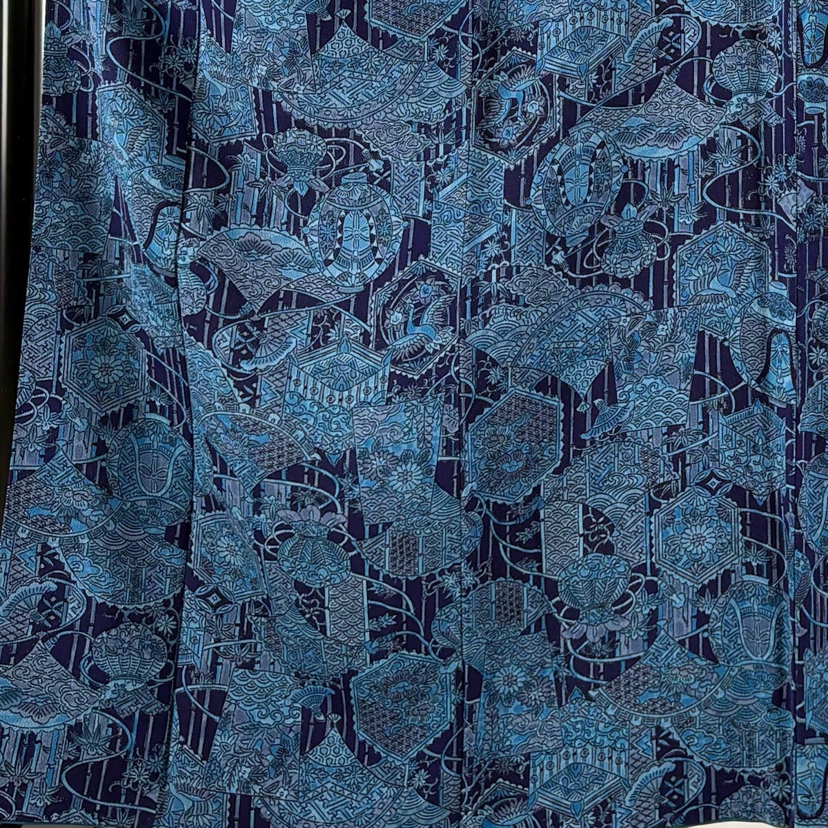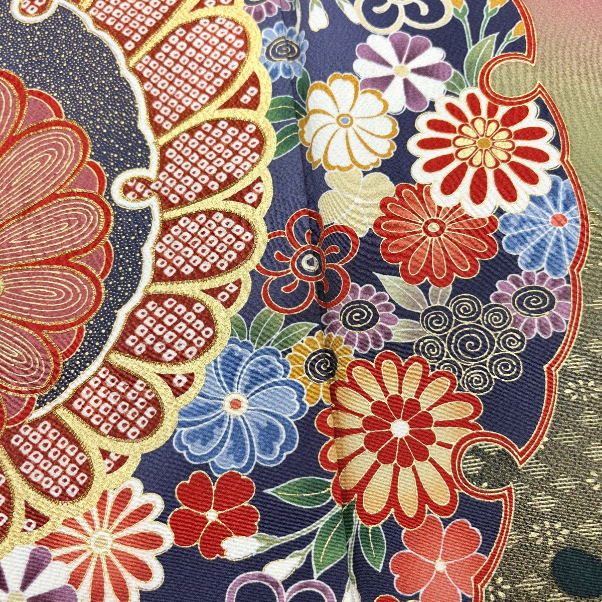 【美品】 小紋 身丈163cm 裄丈65cm M 袷 扇 草花 縮緬 紺色 正絹 秀品