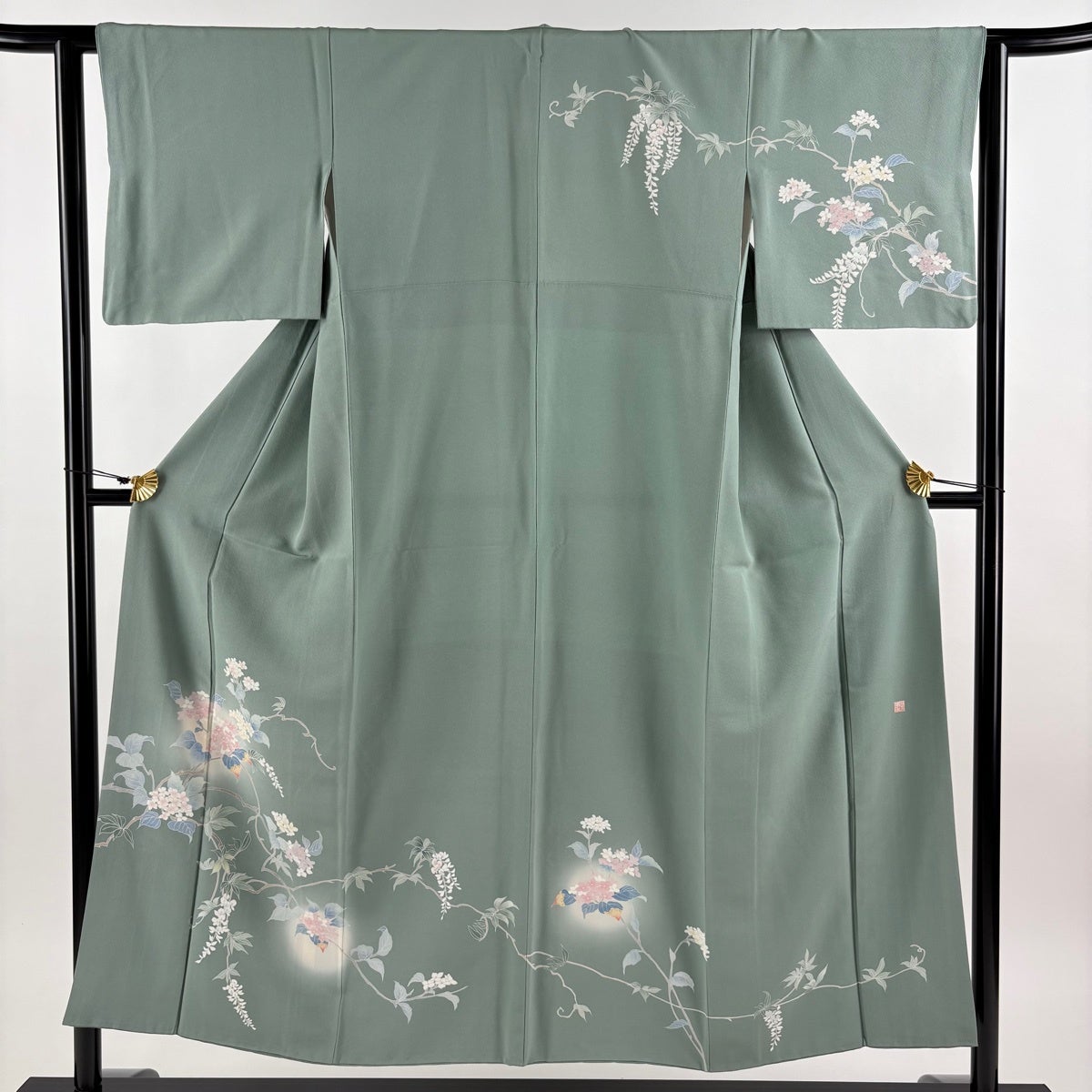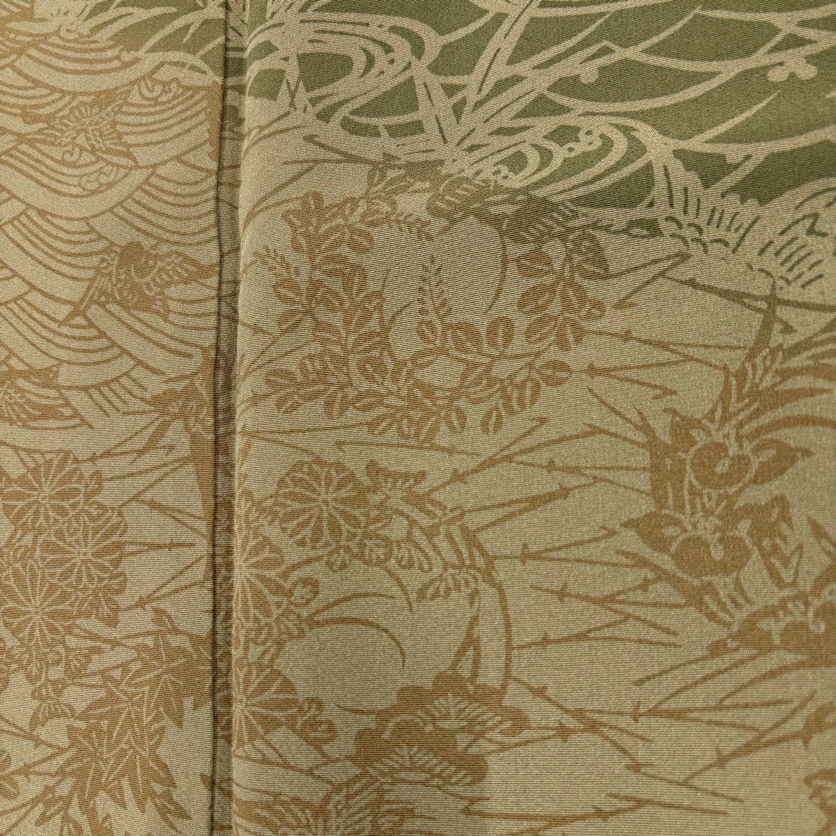 付下げ 身丈161cm 裄丈67.5cm L 袷 落款あり 花鳥 波 鶯色 正絹 秀品