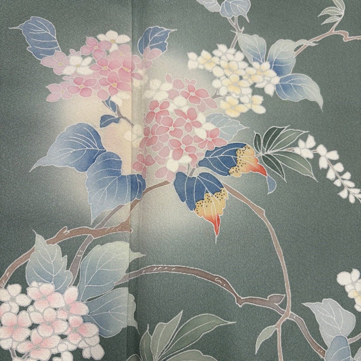 訪問着 身丈151cm 裄丈62cm S 袷 落款あり 枝花 ぼかし 灰緑 正絹 秀品