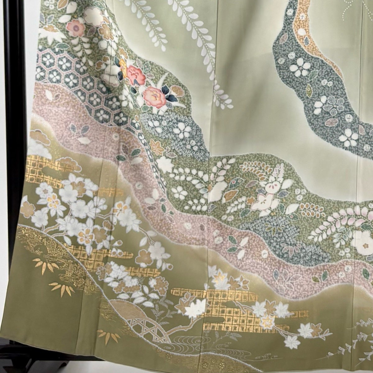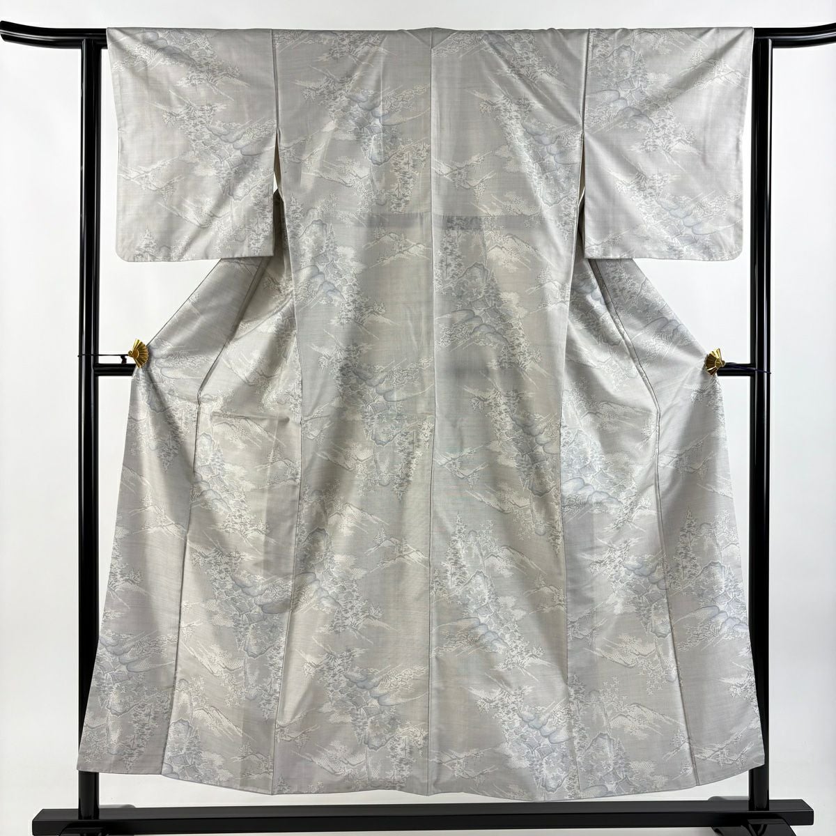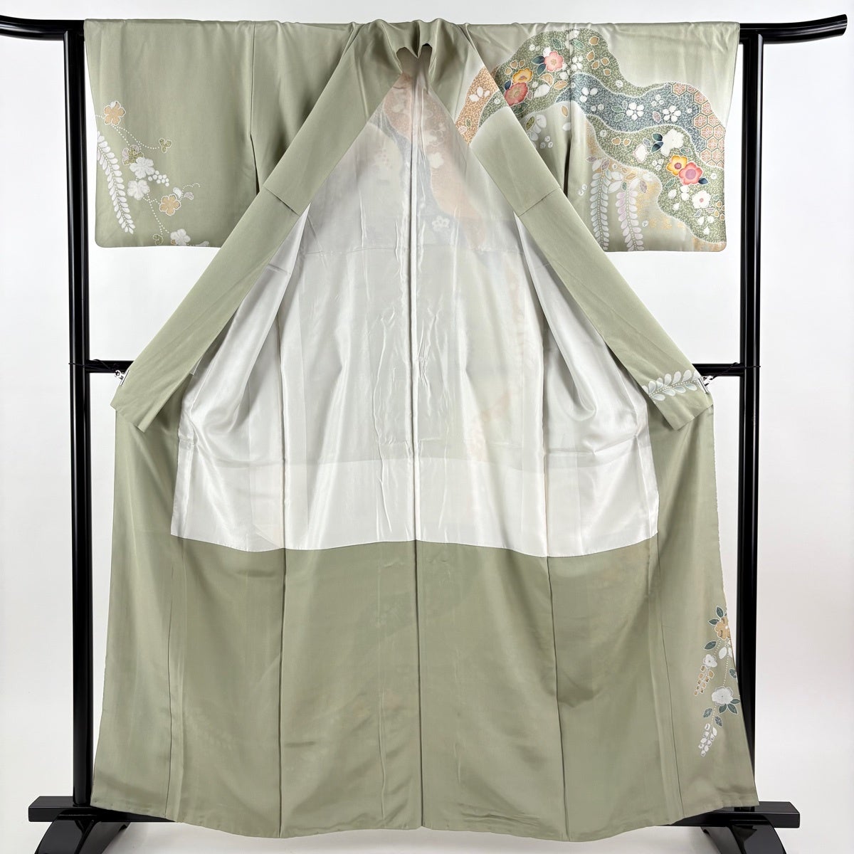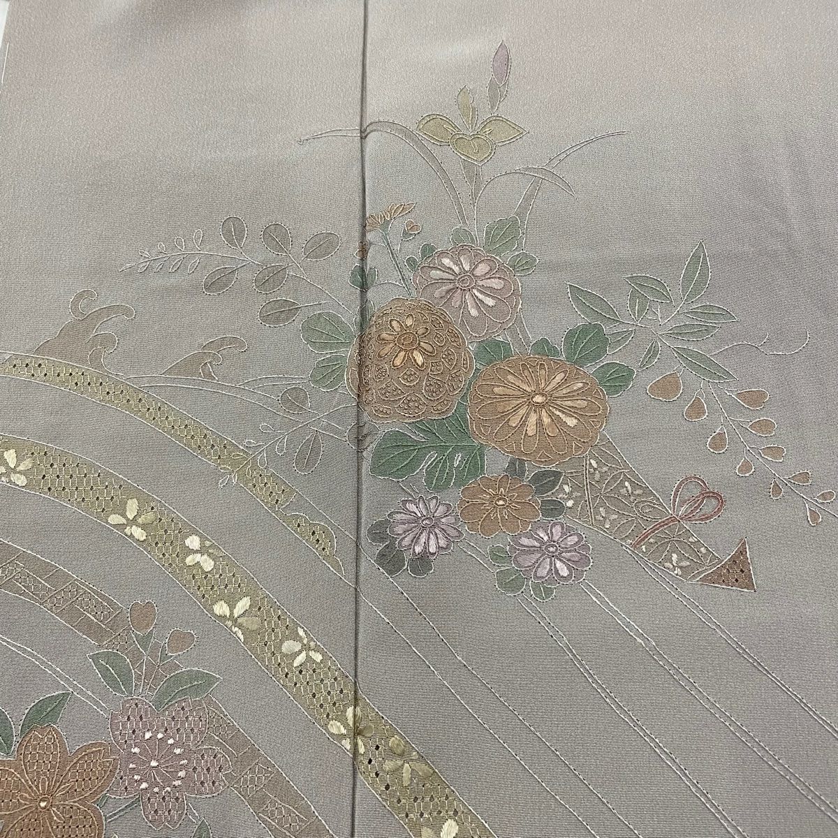 訪問着 身丈161cm 裄丈63cm S 袷 草花 霞 金彩 ぼかし 灰緑 正絹 秀品