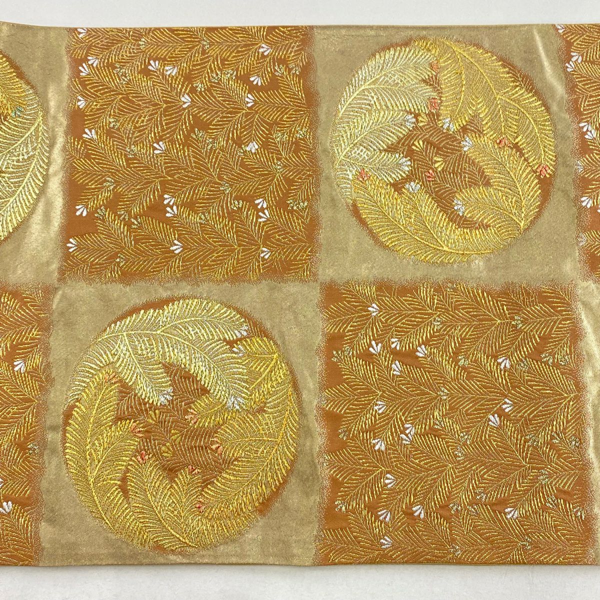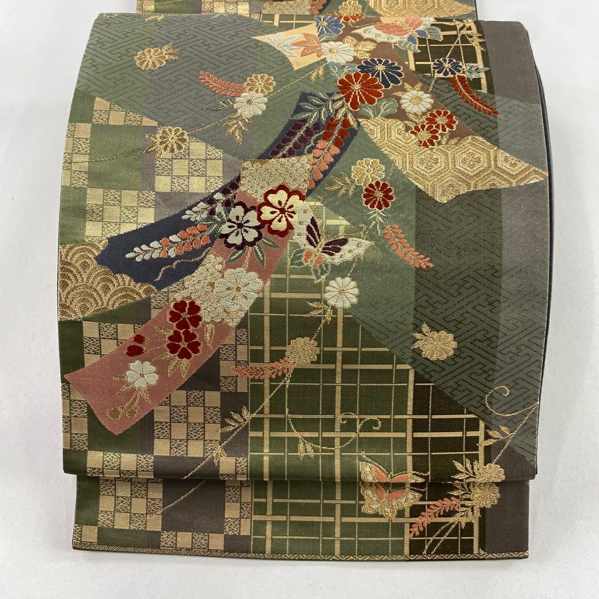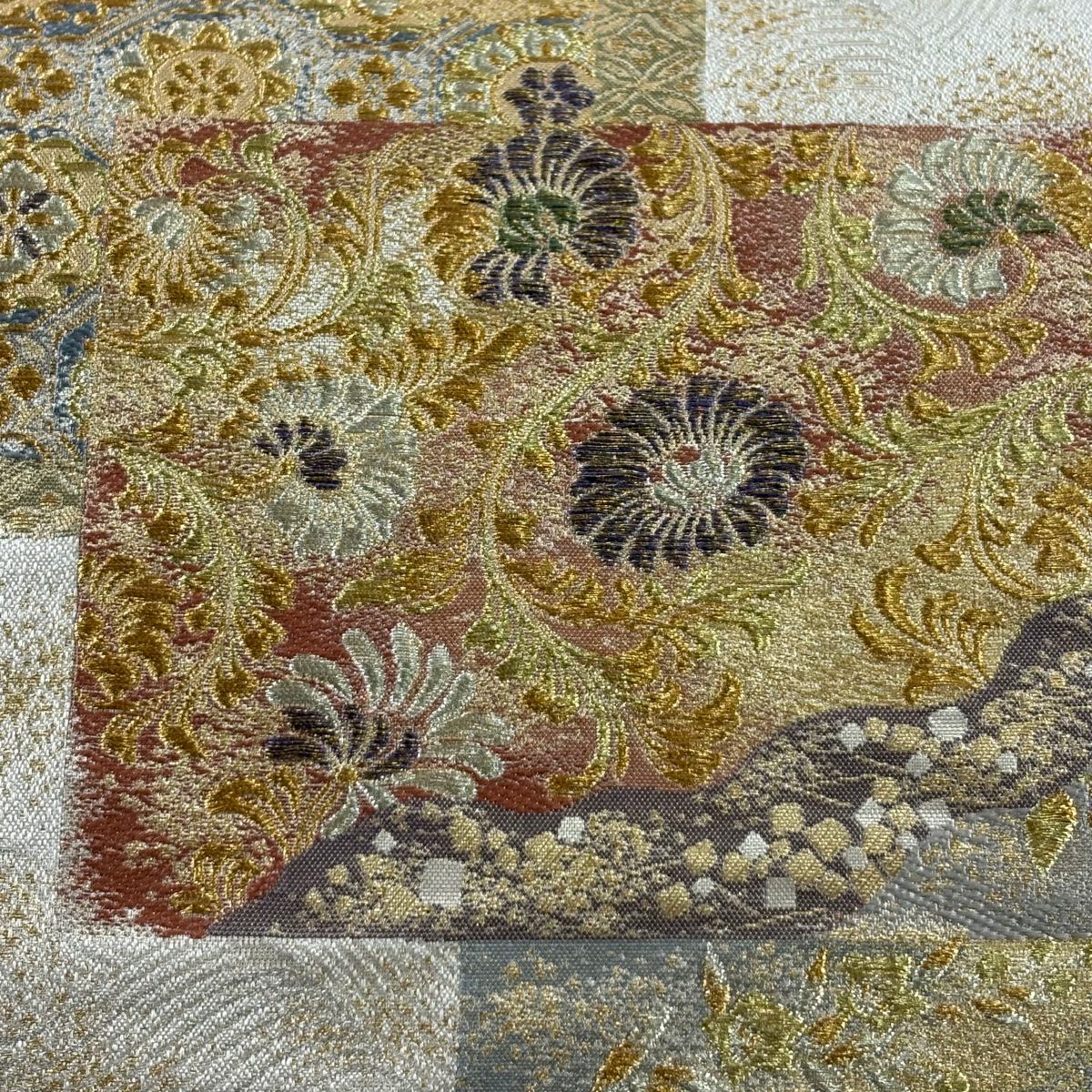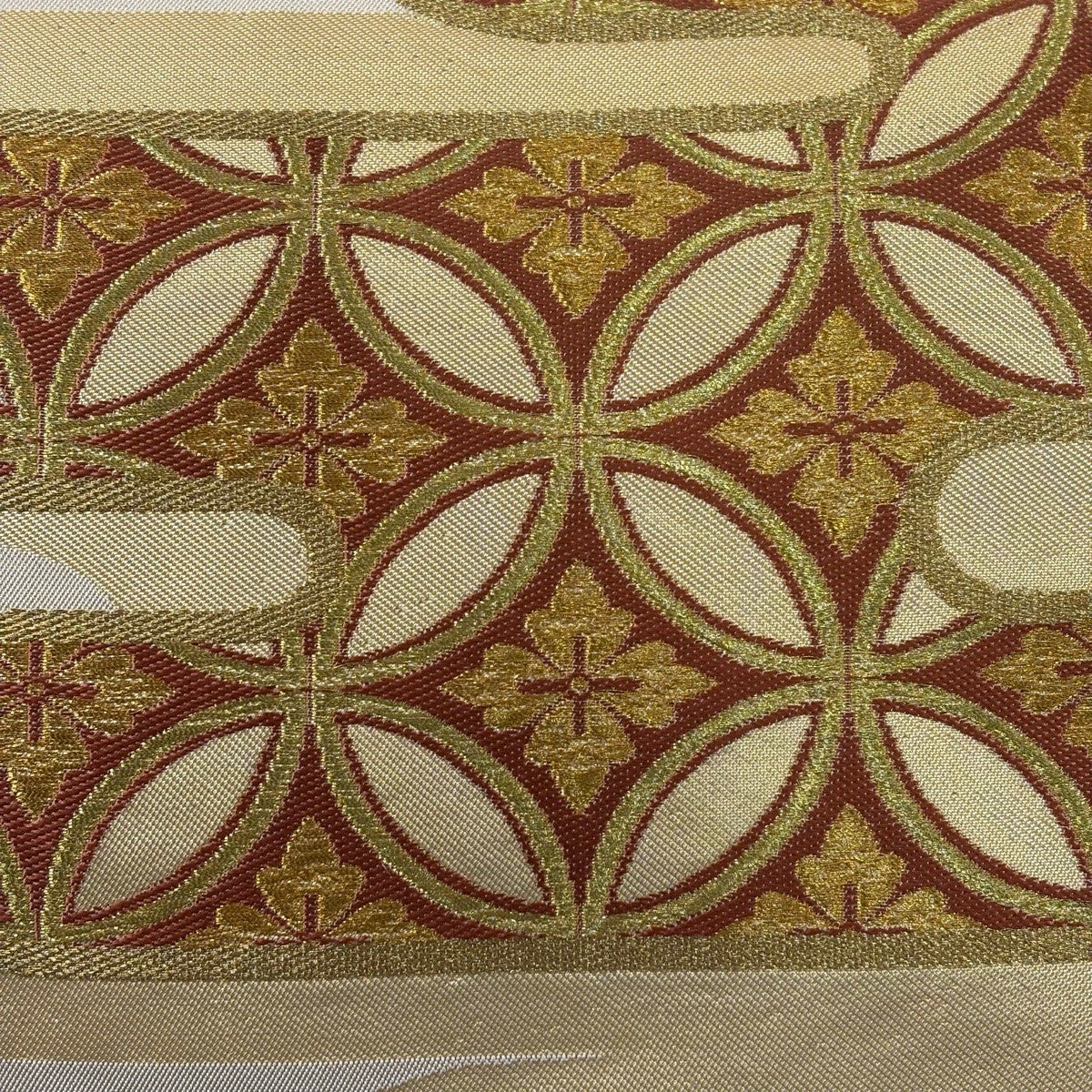 【美品】 袋帯 秀品 落款あり 蒼舟幸子 幾何学 金通し 金銀彩 赤茶 お太鼓柄 正絹