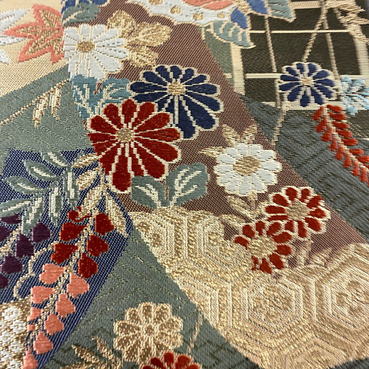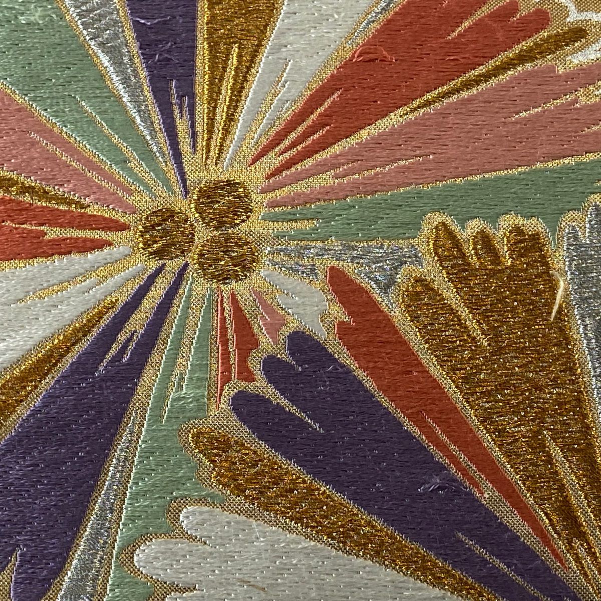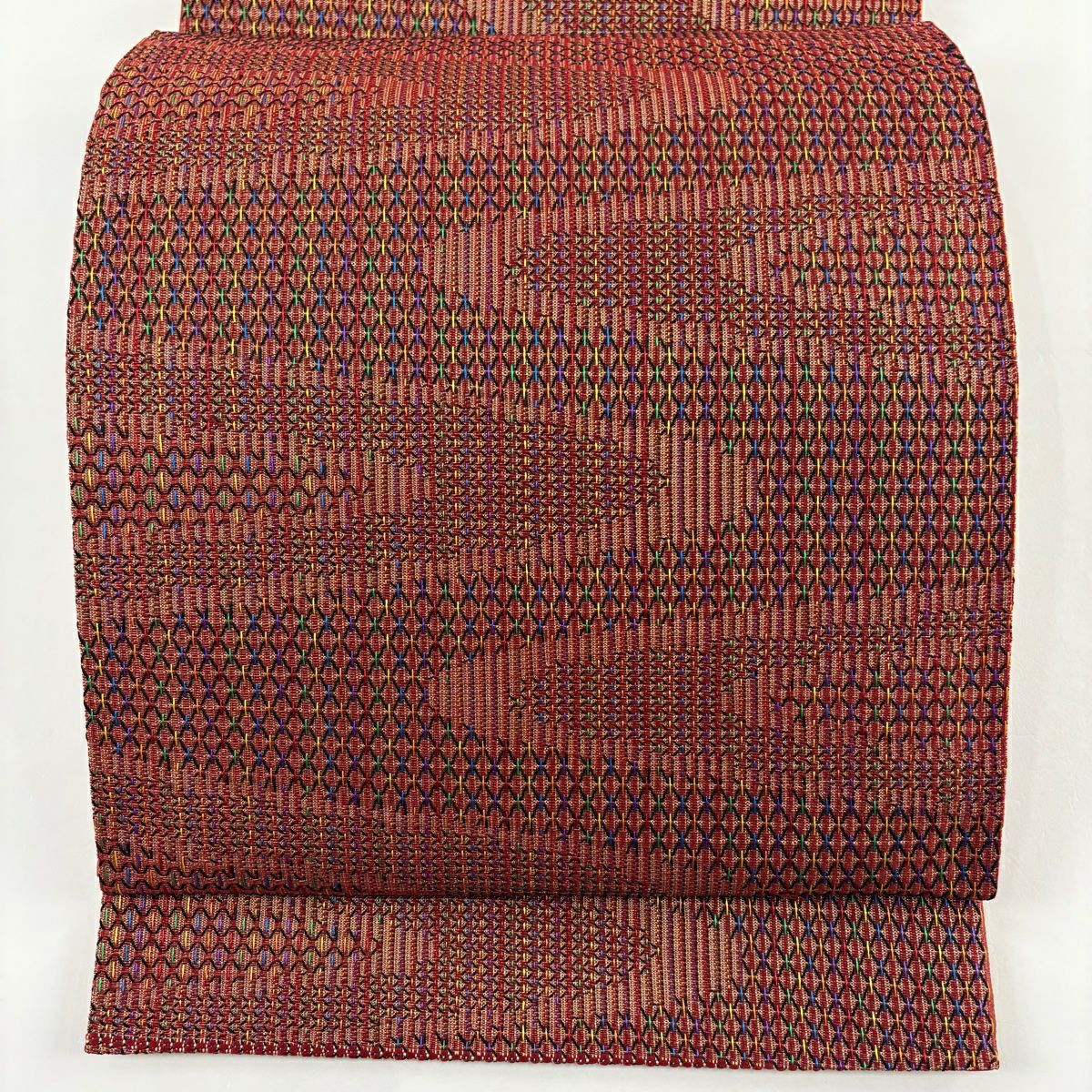 【美品】 袋帯 秀品 落款あり 蒼舟幸子 幾何学 金通し 金銀彩 赤茶 お太鼓柄 正絹