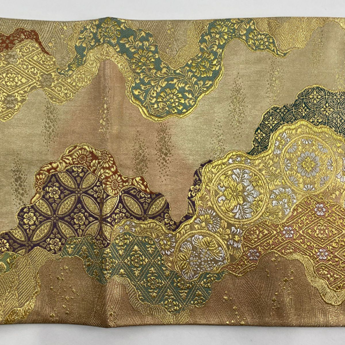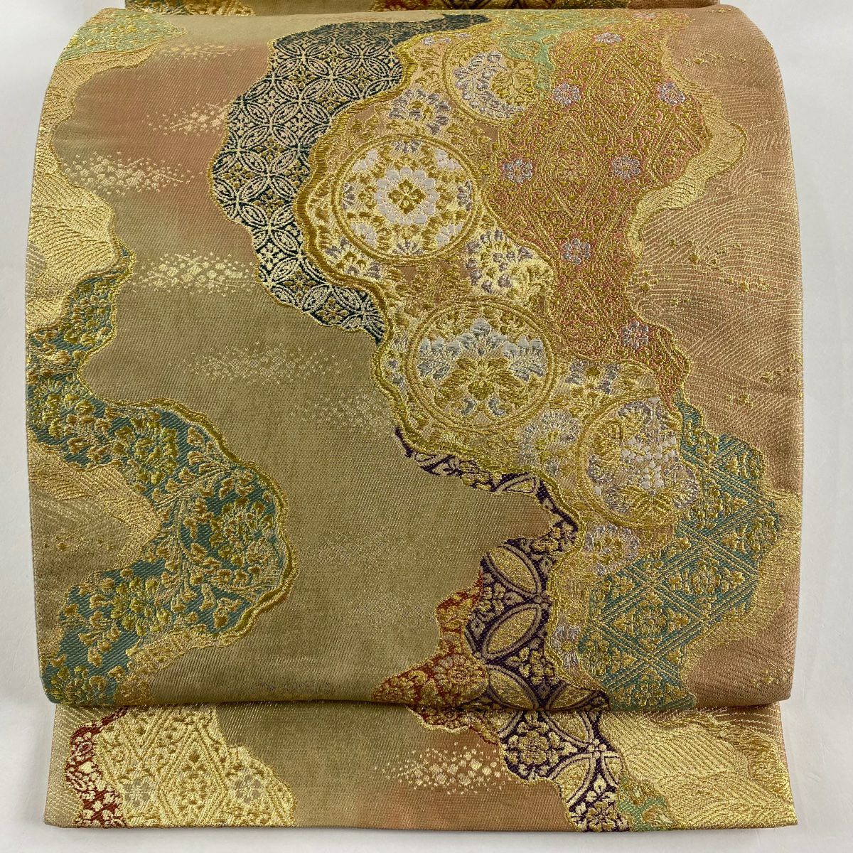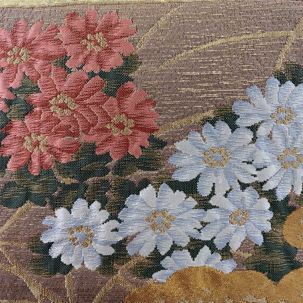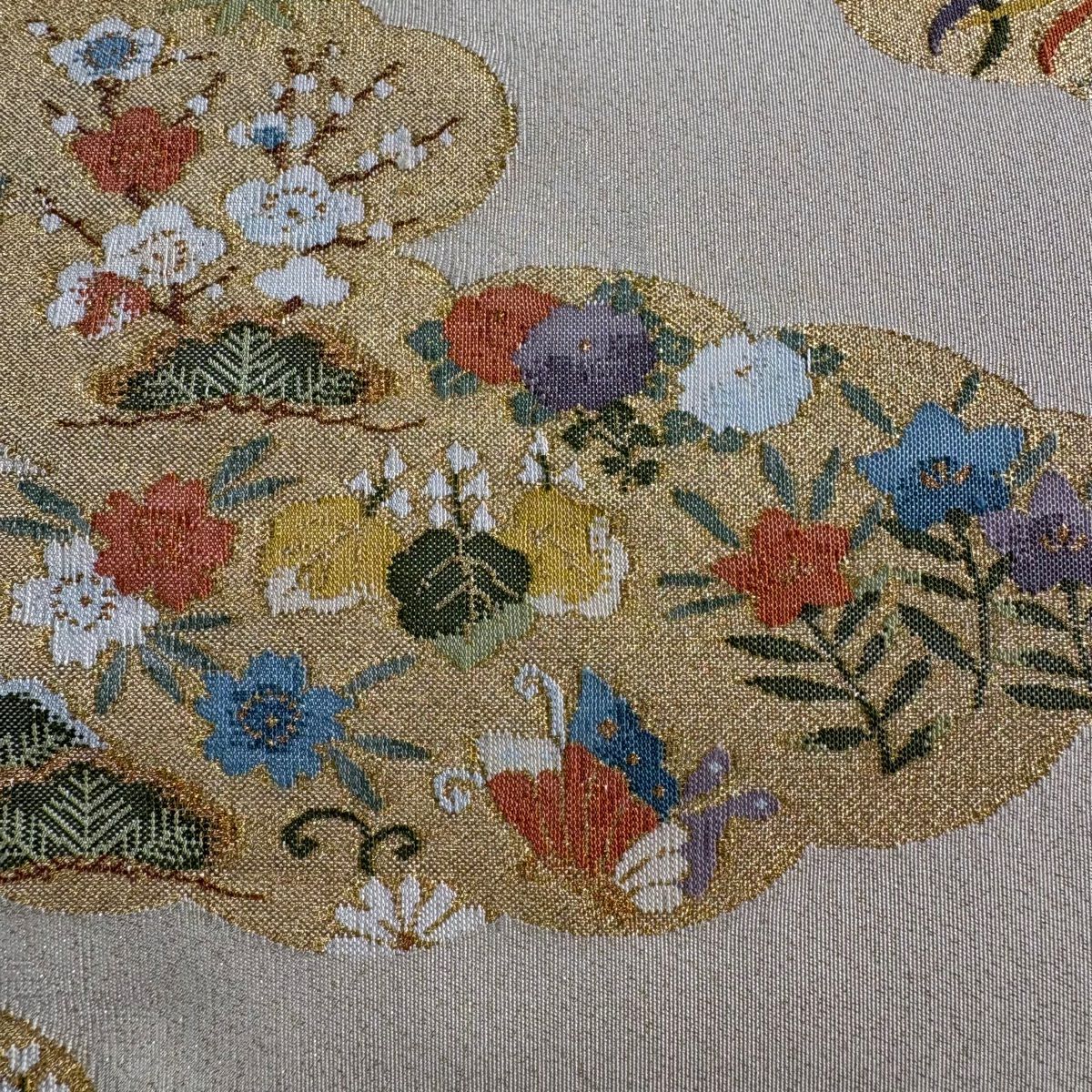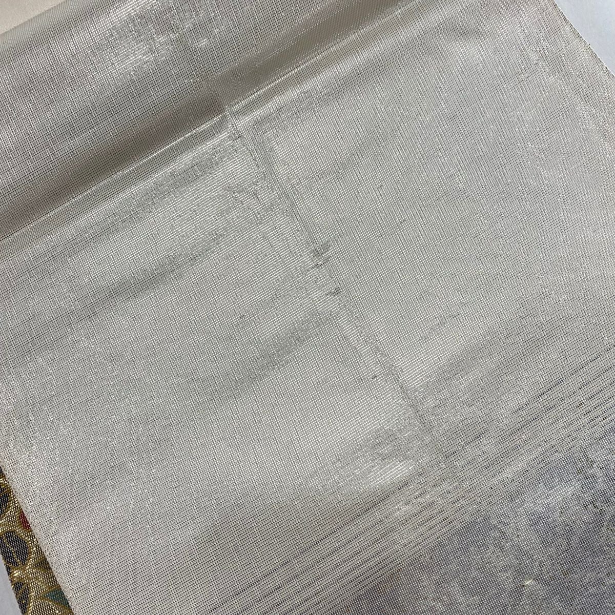 袋帯 秀品 川島織物 落款あり ヱ霞 七宝華文 金銀糸 箔 ベージュ 六通 正絹