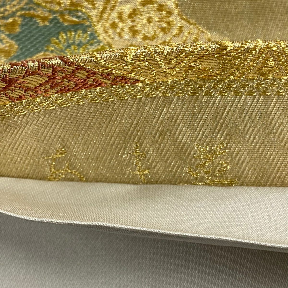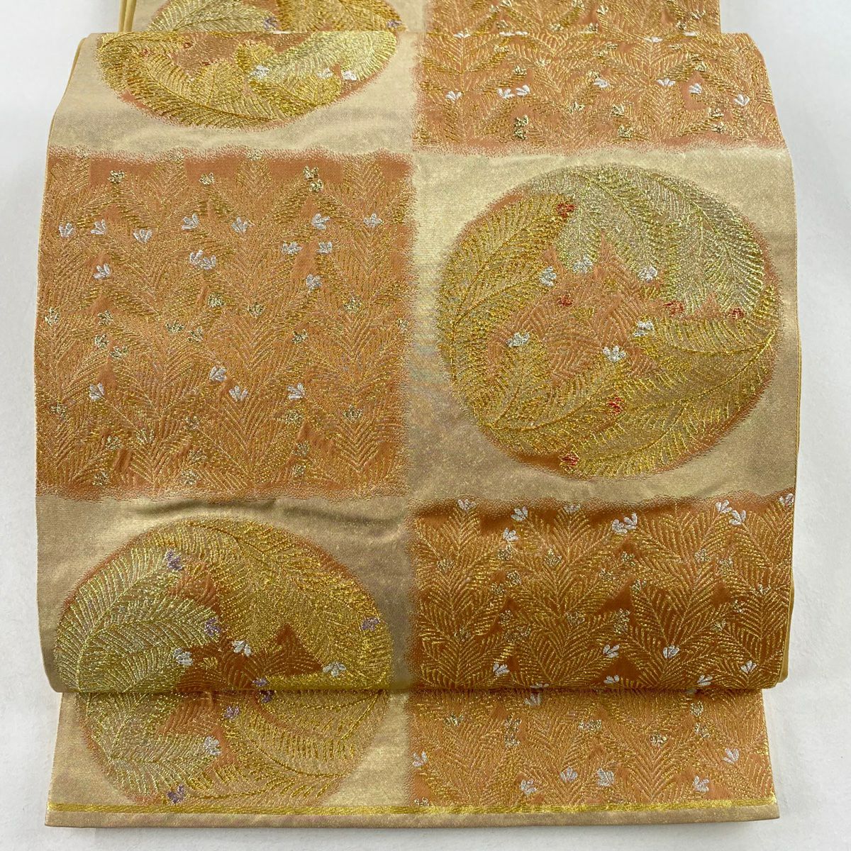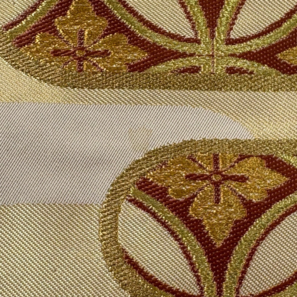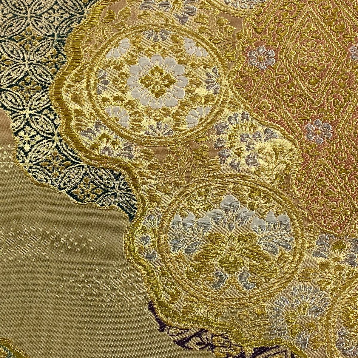 袋帯 秀品 川島織物 落款あり ヱ霞 七宝華文 金銀糸 箔 ベージュ 六通 正絹