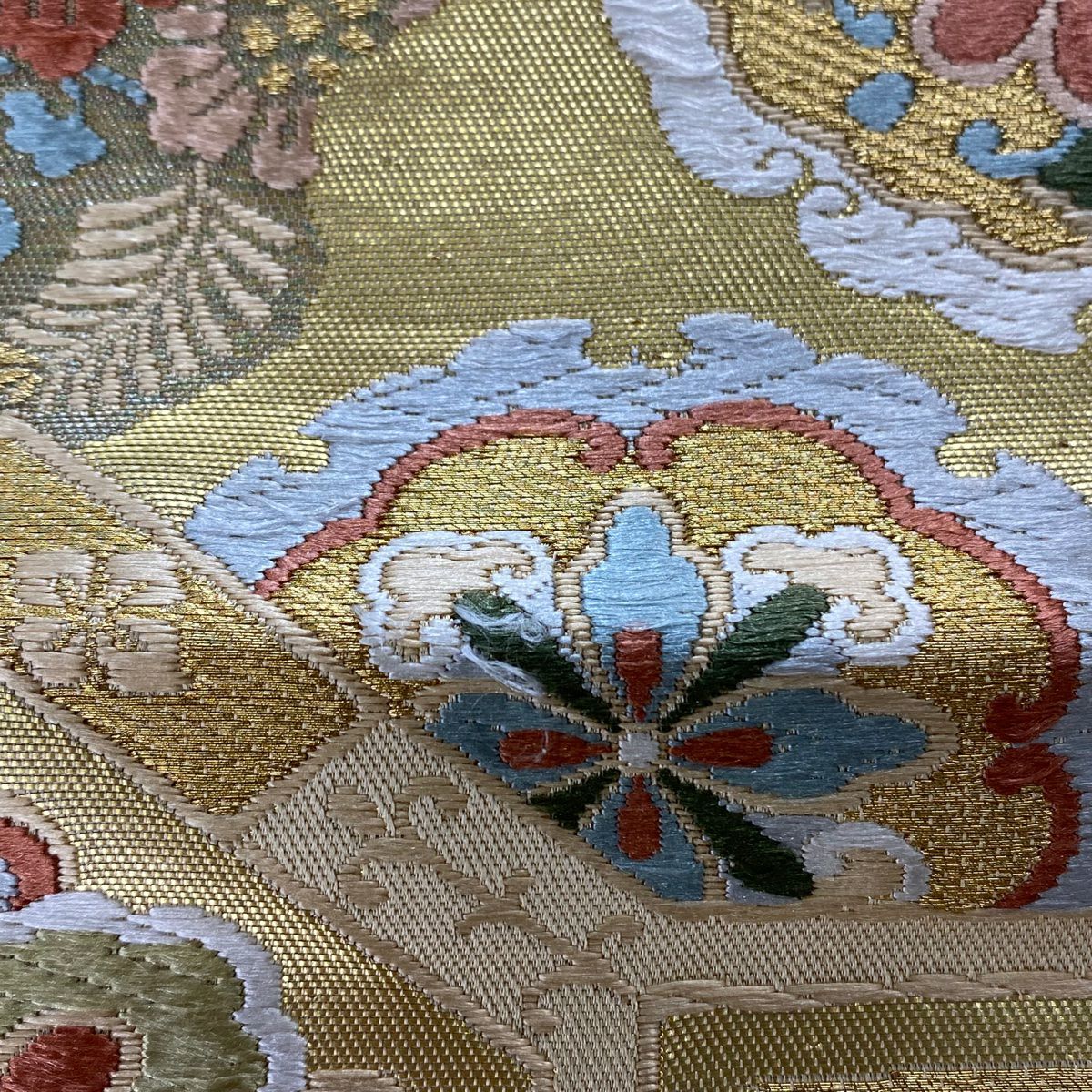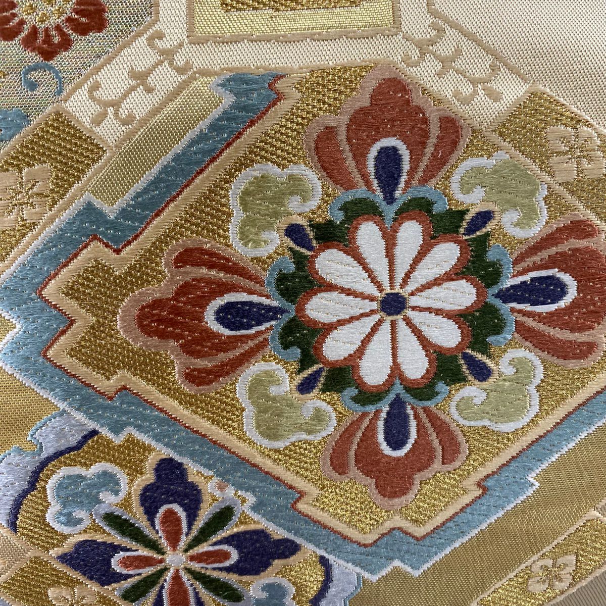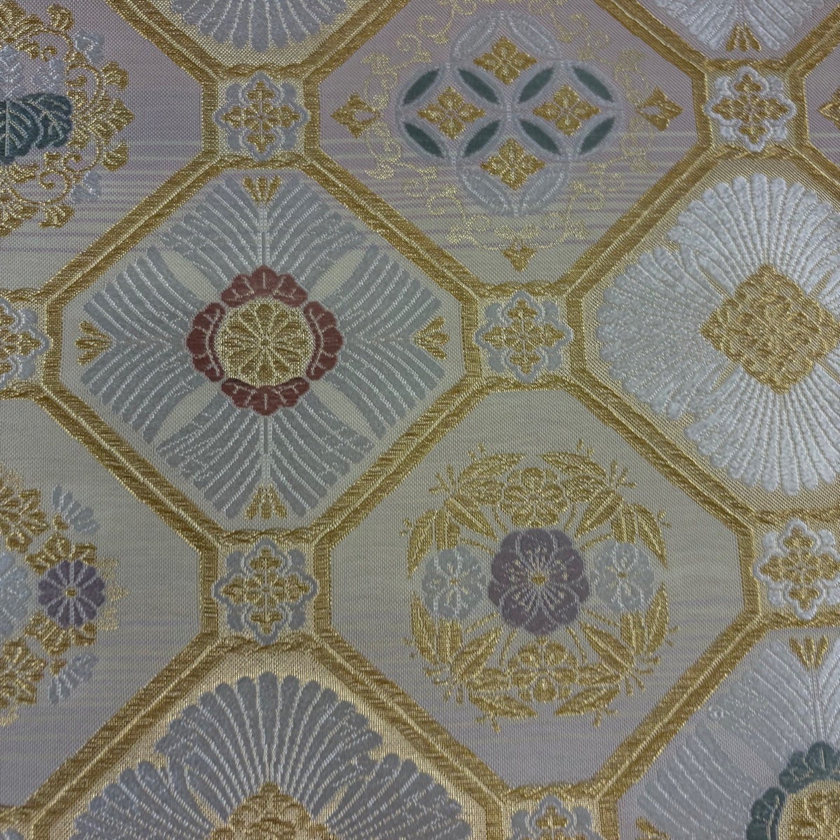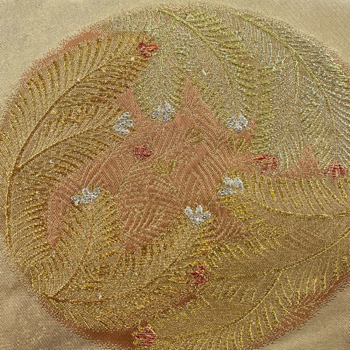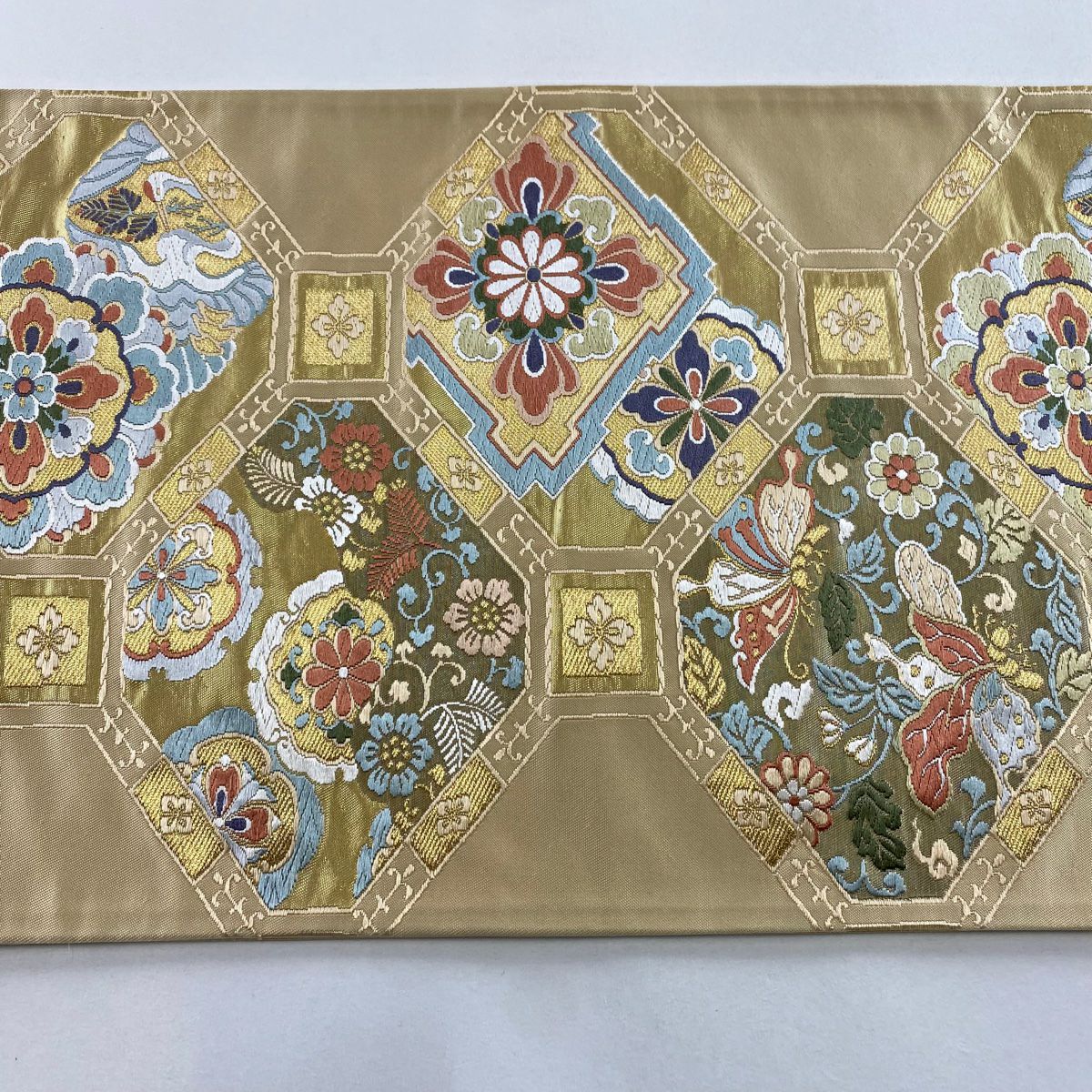 袋帯 秀品 川島織物 落款あり ヱ霞 七宝華文 金銀糸 箔 ベージュ 六通 正絹