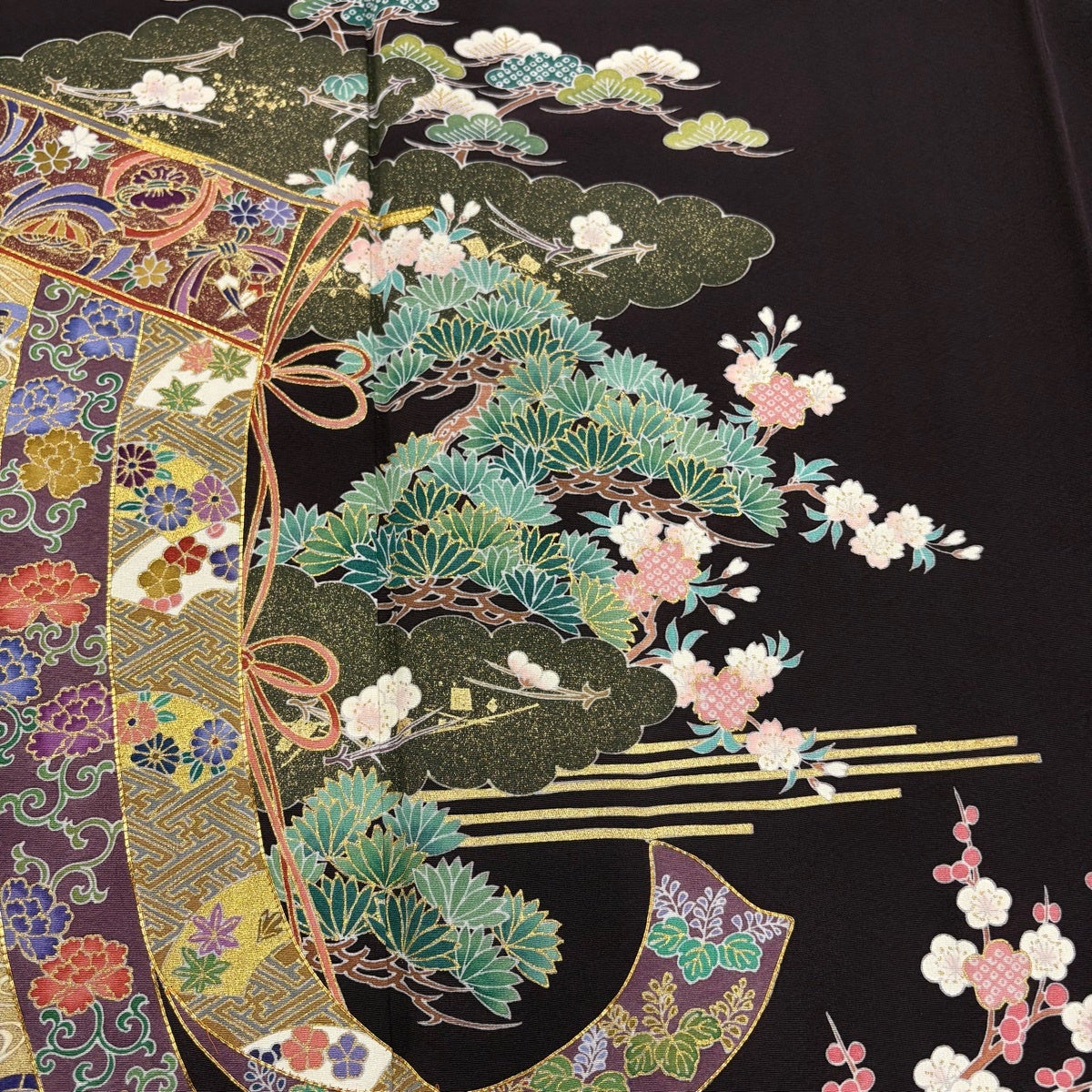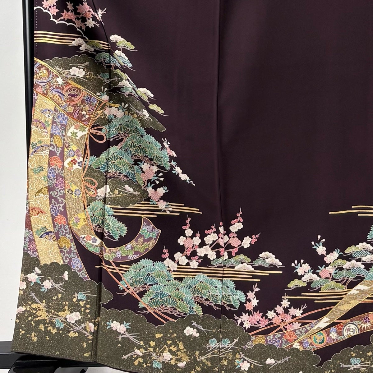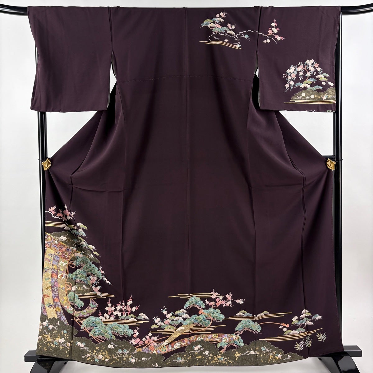 訪問着 身丈165cm 裄丈68.5cm L 袷 几帳 松梅 金糸 金彩 濃紫 正絹 秀品