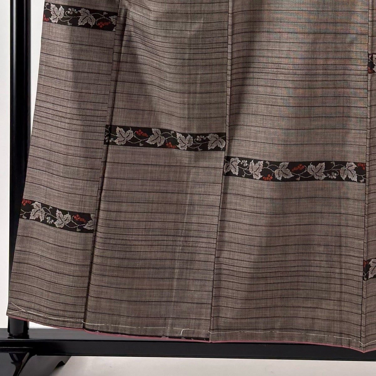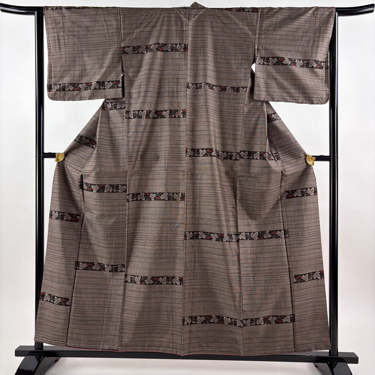 【美品】 紬 身丈158.5cm 裄丈64cm M 袷 葡萄 横縞 焦茶色 正絹 秀品