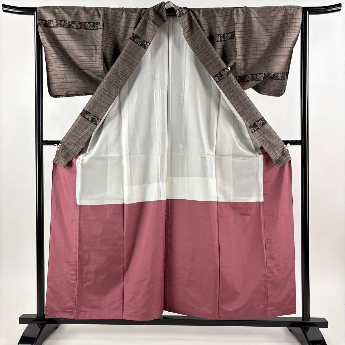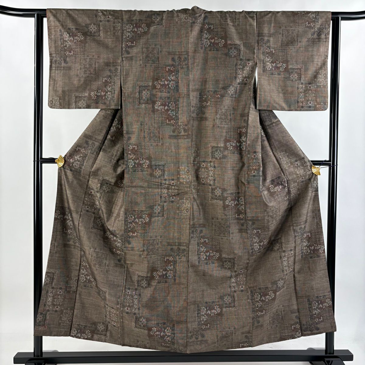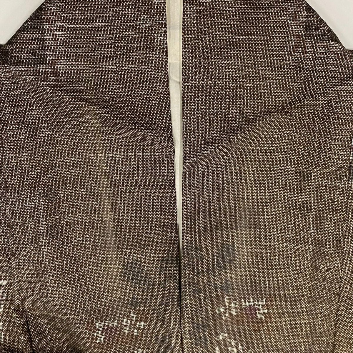 【美品】 紬 身丈152cm 裄丈61.5cm S 袷 縦縞 草花 焦茶色 正絹 秀品