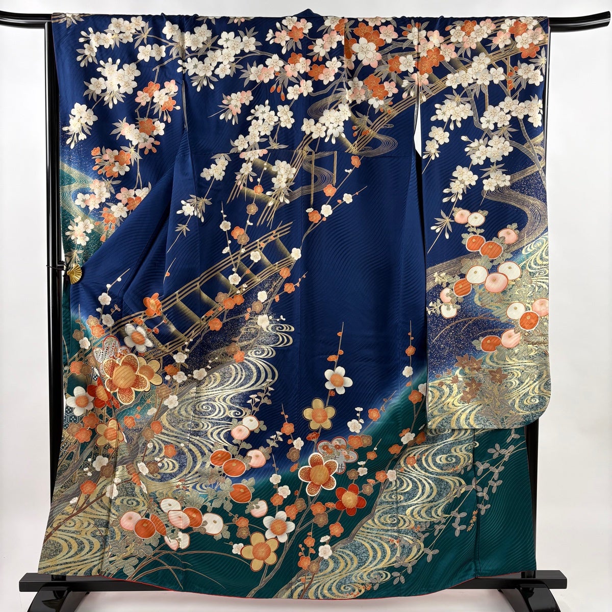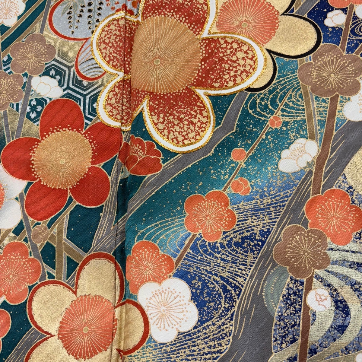 振袖 身丈161cm 裄丈68.5cm L 袷 枝梅 観世水 金糸 金彩 青 正絹 秀品