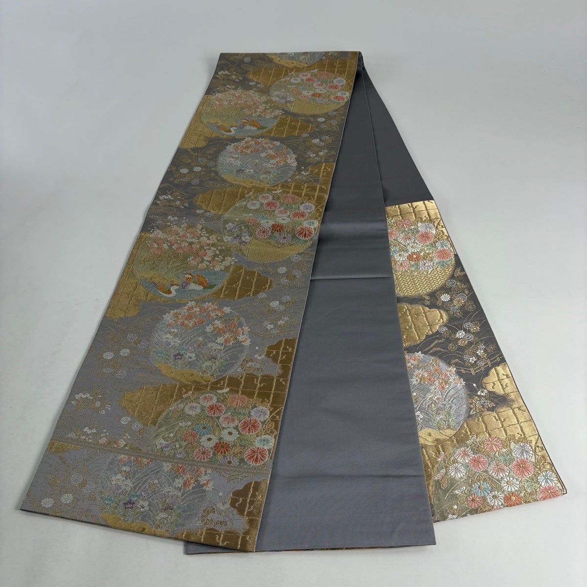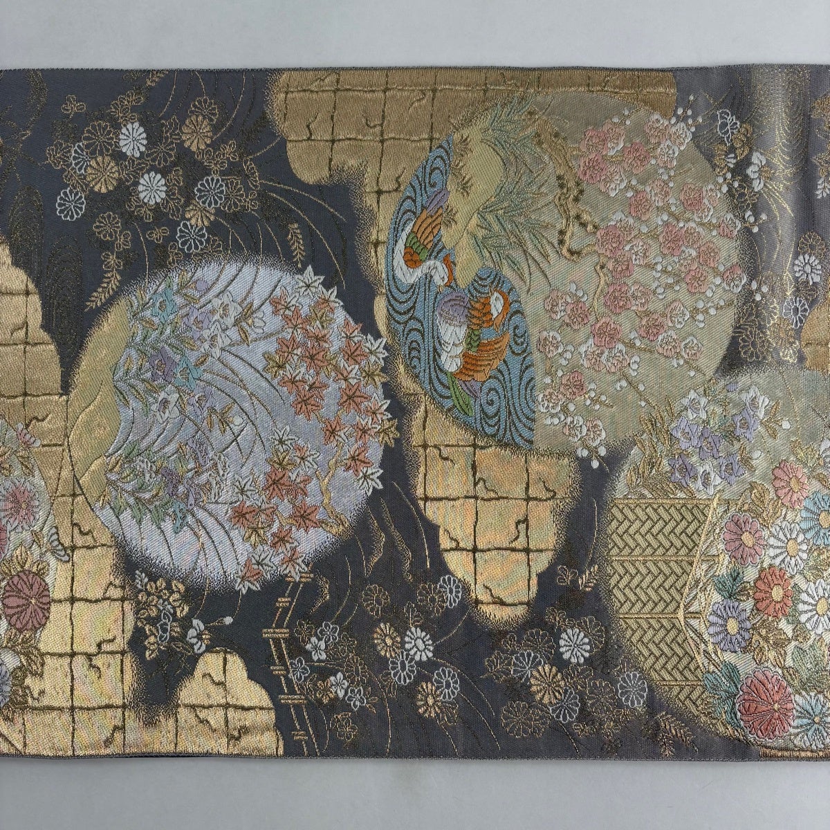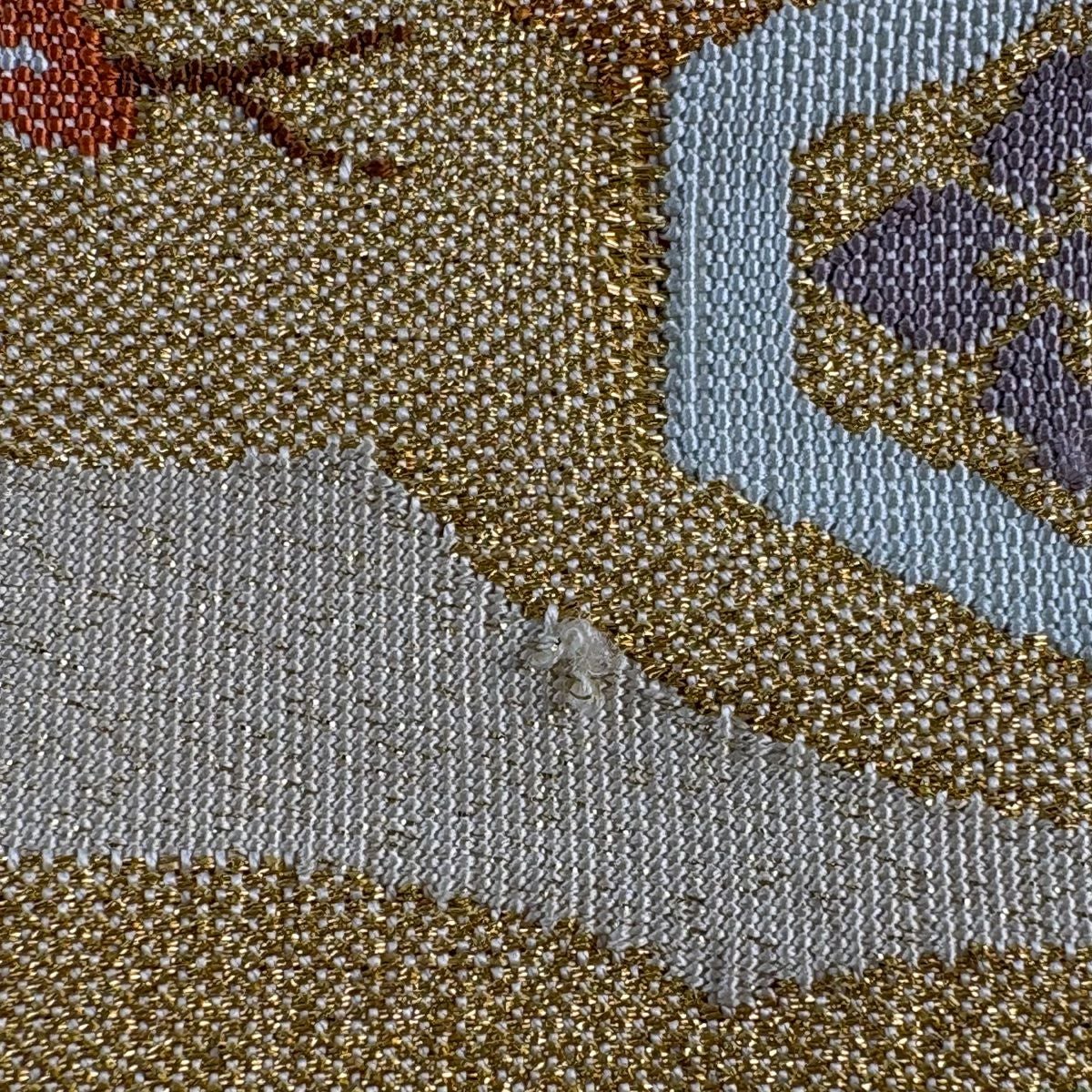 【美品】 袋帯 秀品 服部織物 落款あり 花鳥 格子 唐織 金銀糸 灰紫 六通 正絹