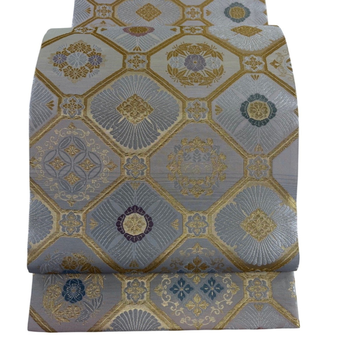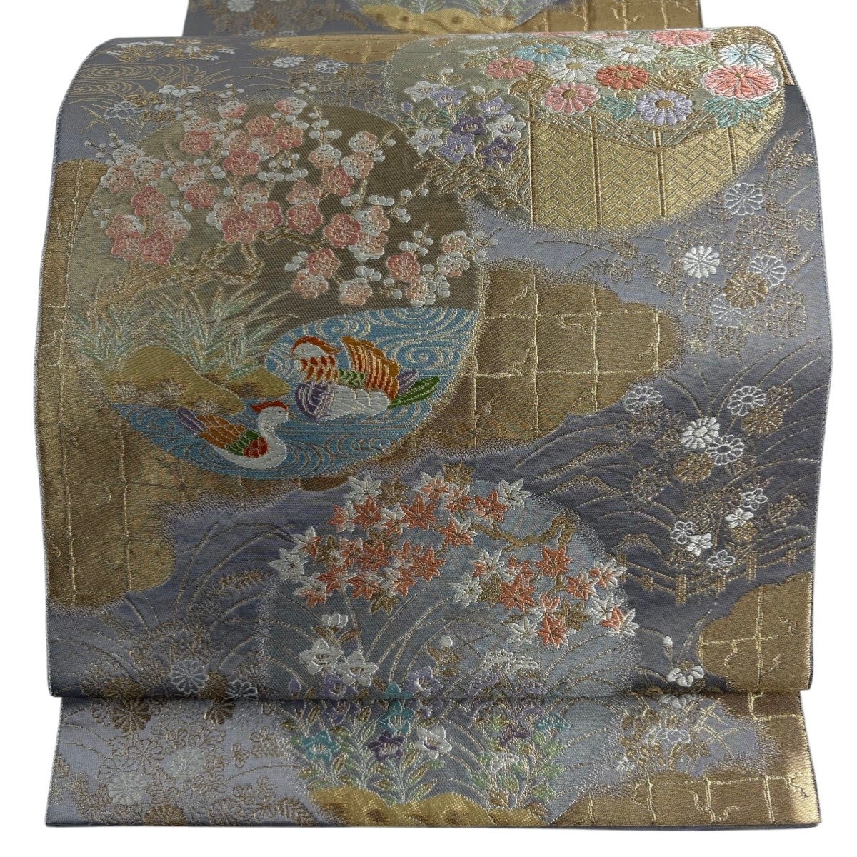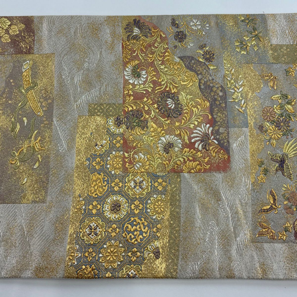 【美品】 袋帯 秀品 服部織物 落款あり 花鳥 格子 唐織 金銀糸 灰紫 六通 正絹