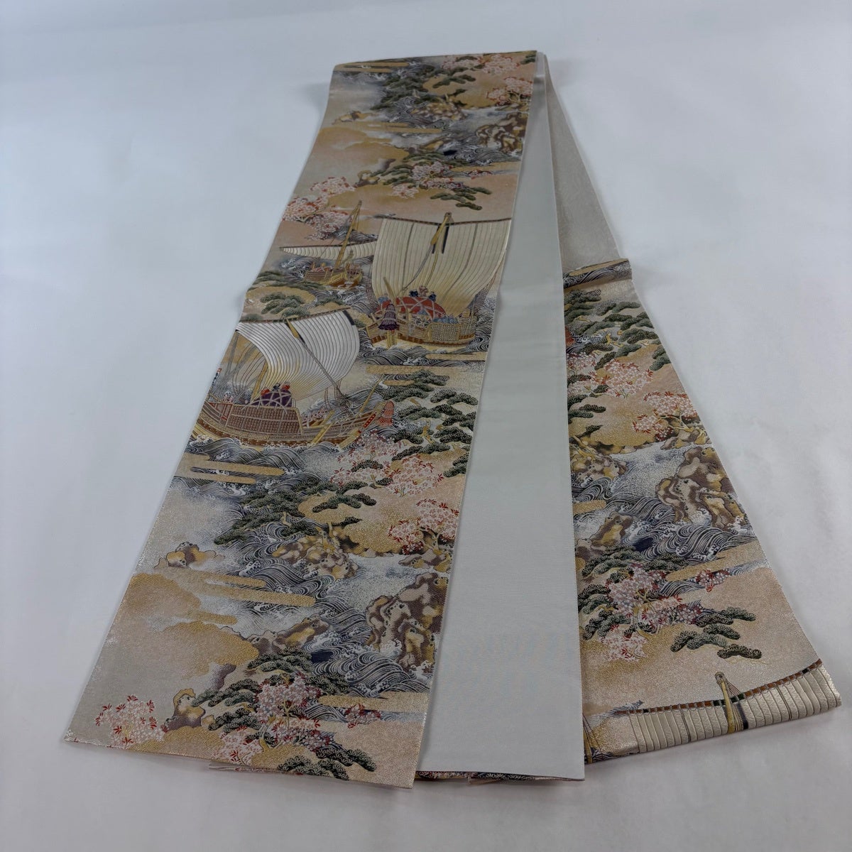 【美品】 袋帯 秀品 落款あり 北村隆 船 人物 金糸 箔 ベージュ 六通 正絹