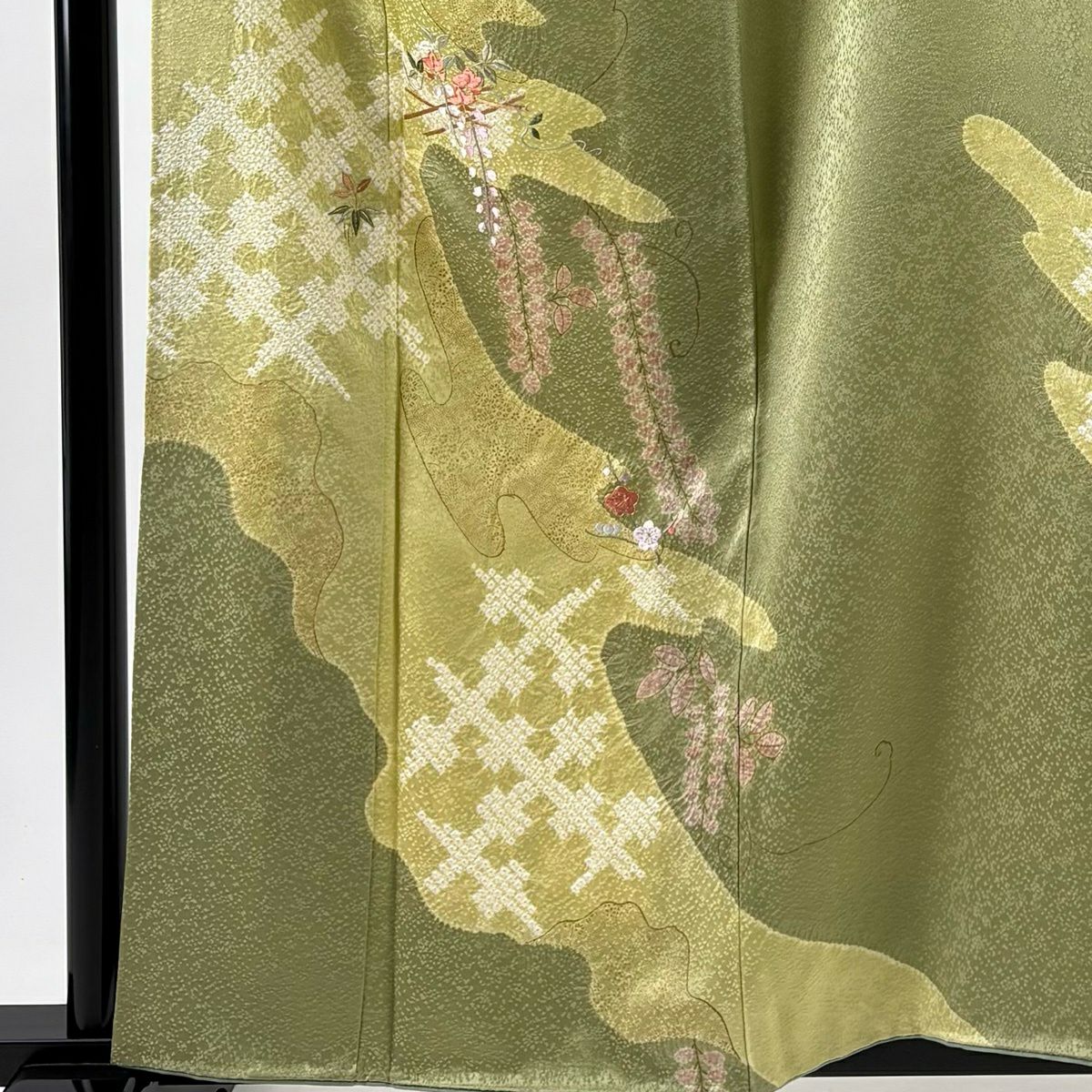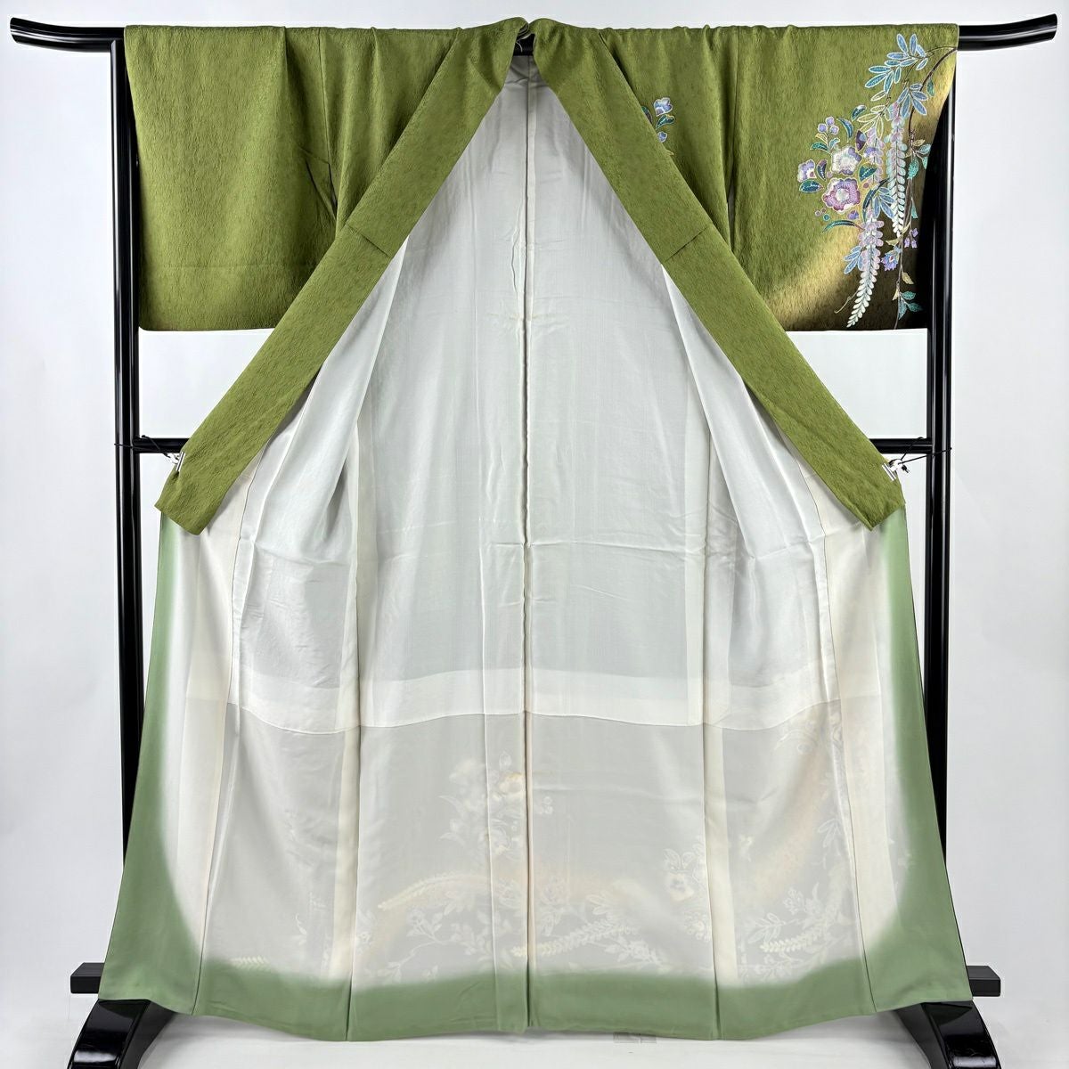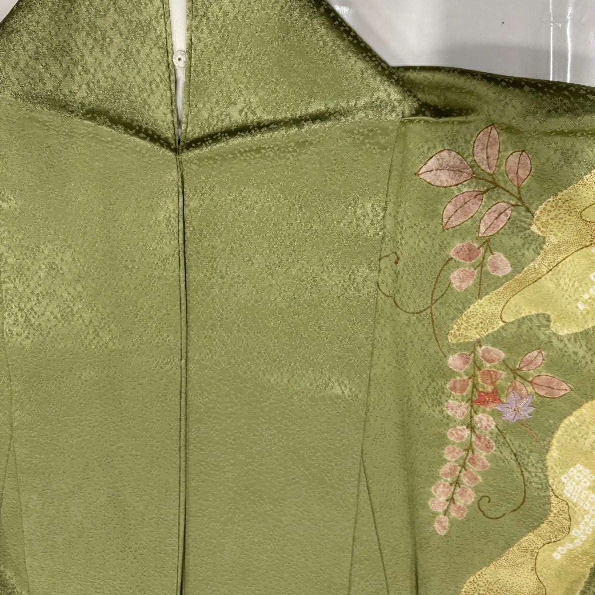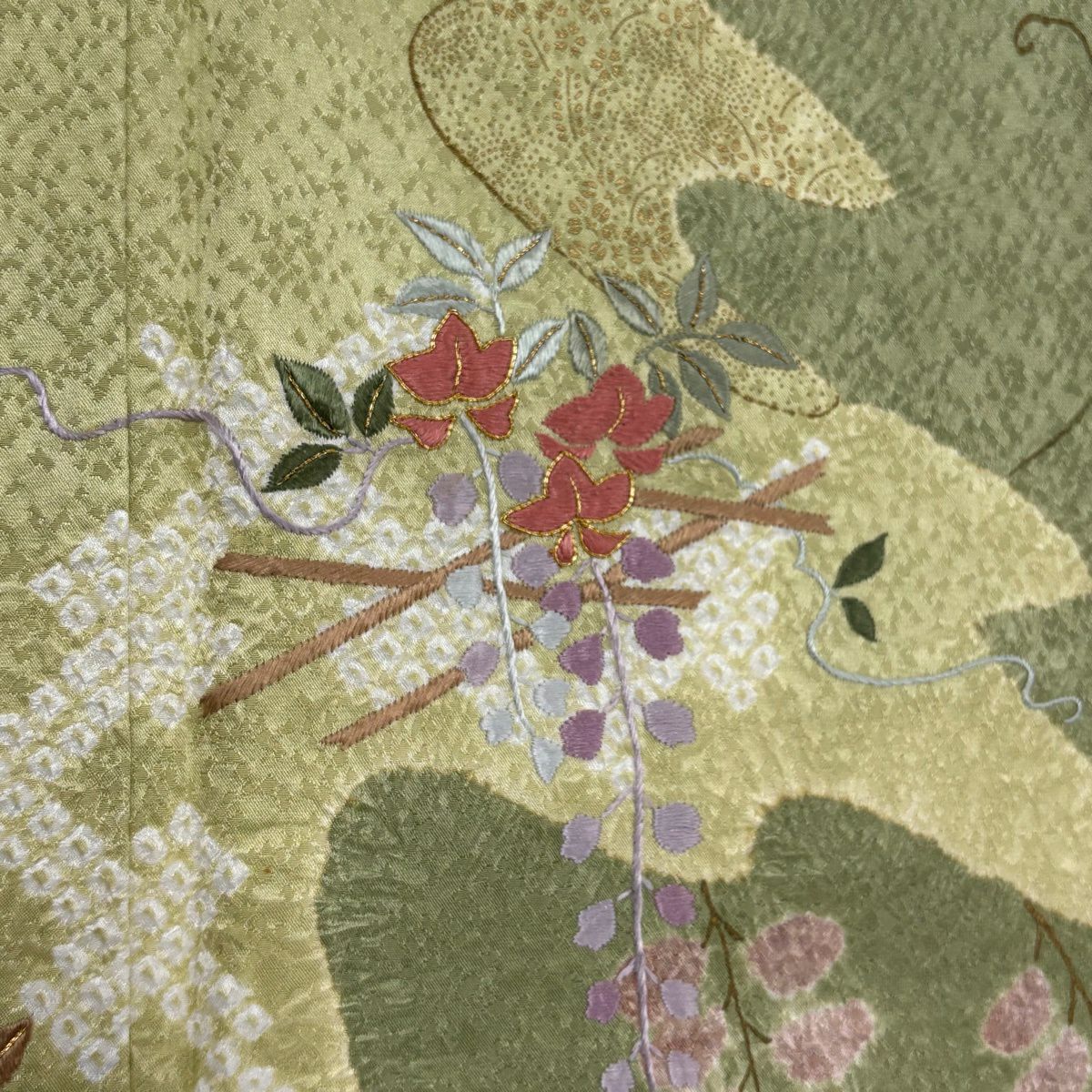 付下げ 身丈160cm 裄丈66cm M 袷 藤 梅 刺繍 絞り よもぎ色 正絹 秀品