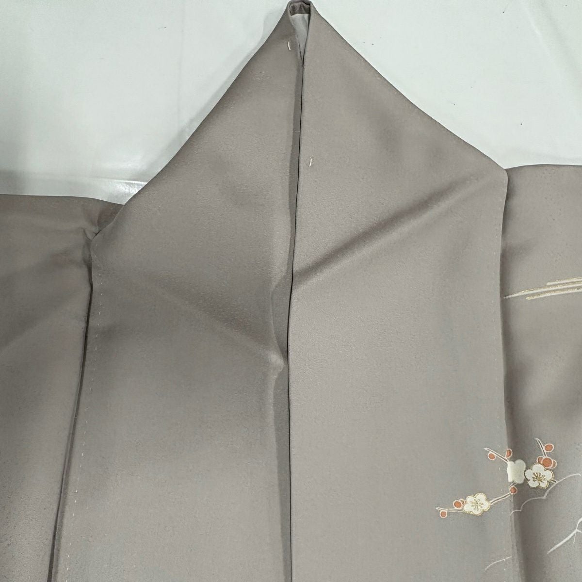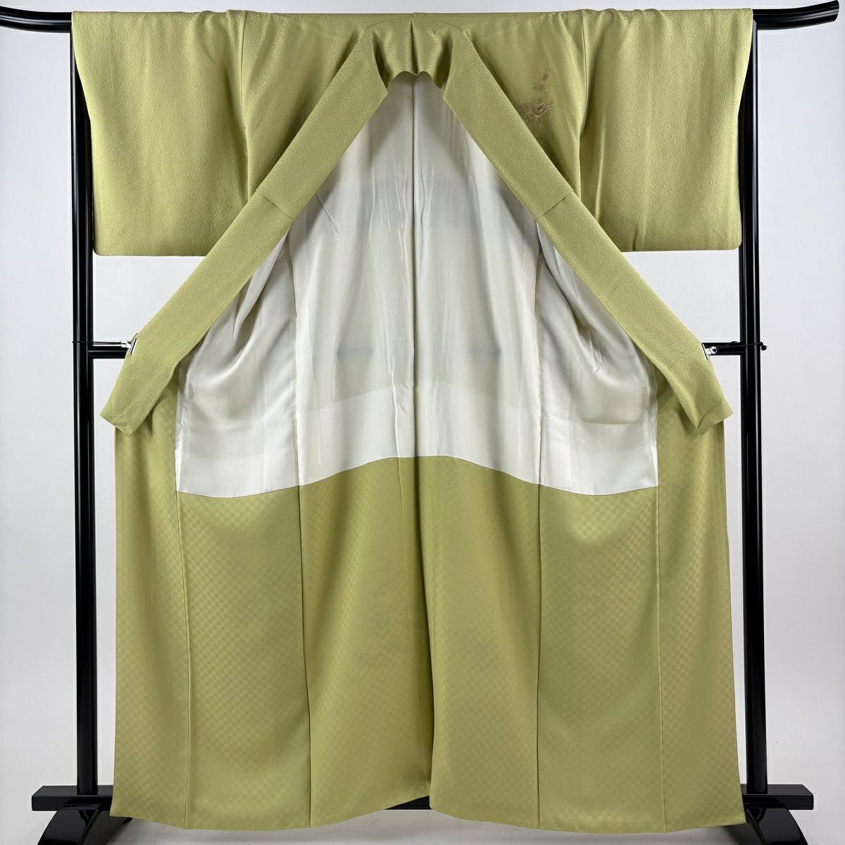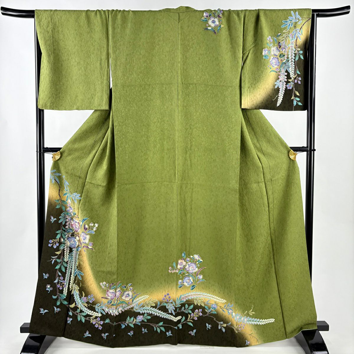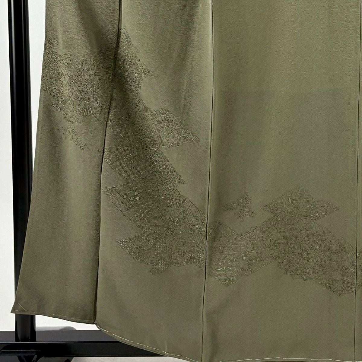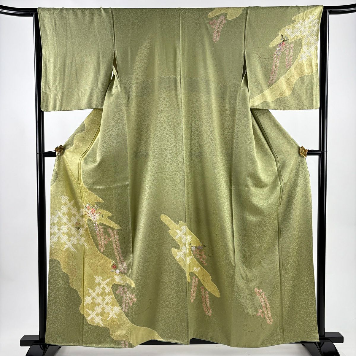 付下げ 身丈160cm 裄丈66cm M 袷 藤 梅 刺繍 絞り よもぎ色 正絹 秀品
