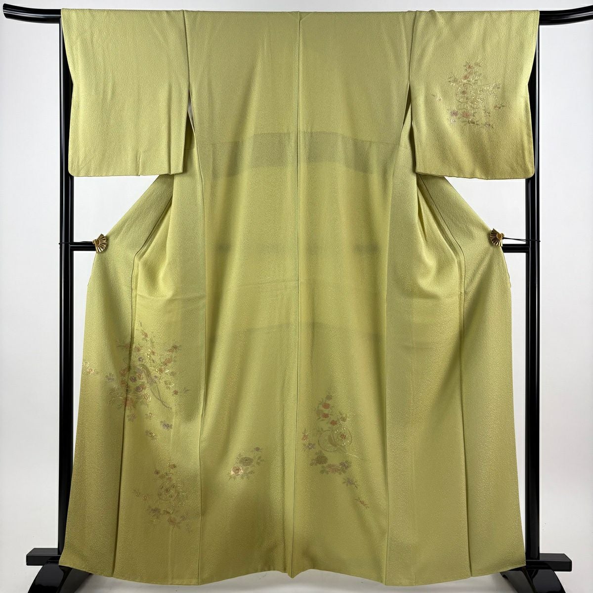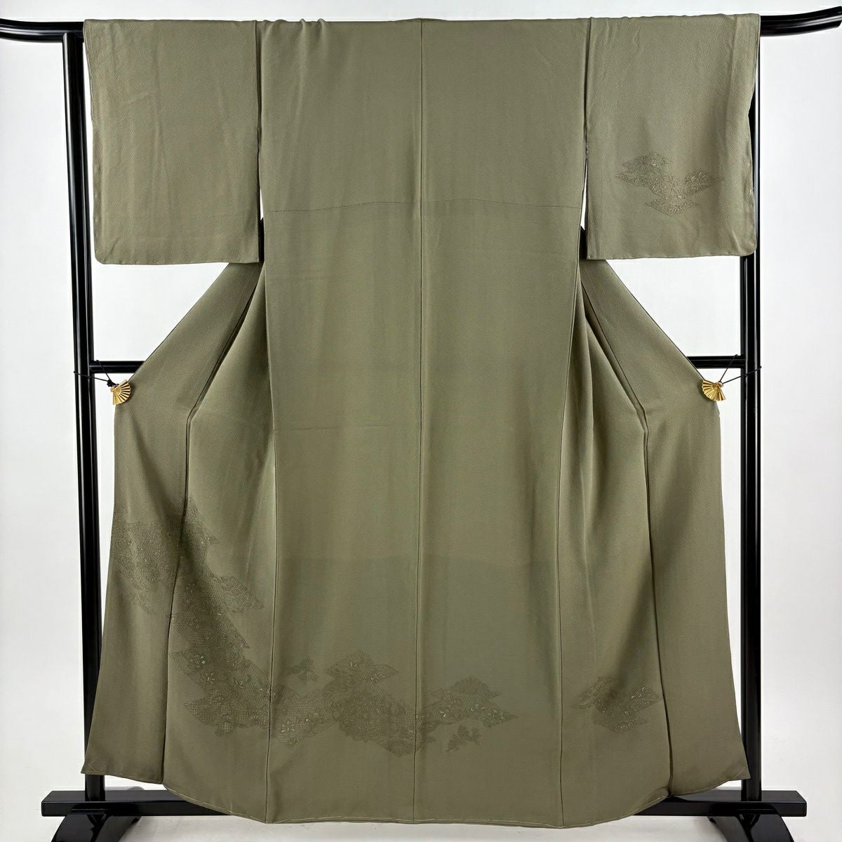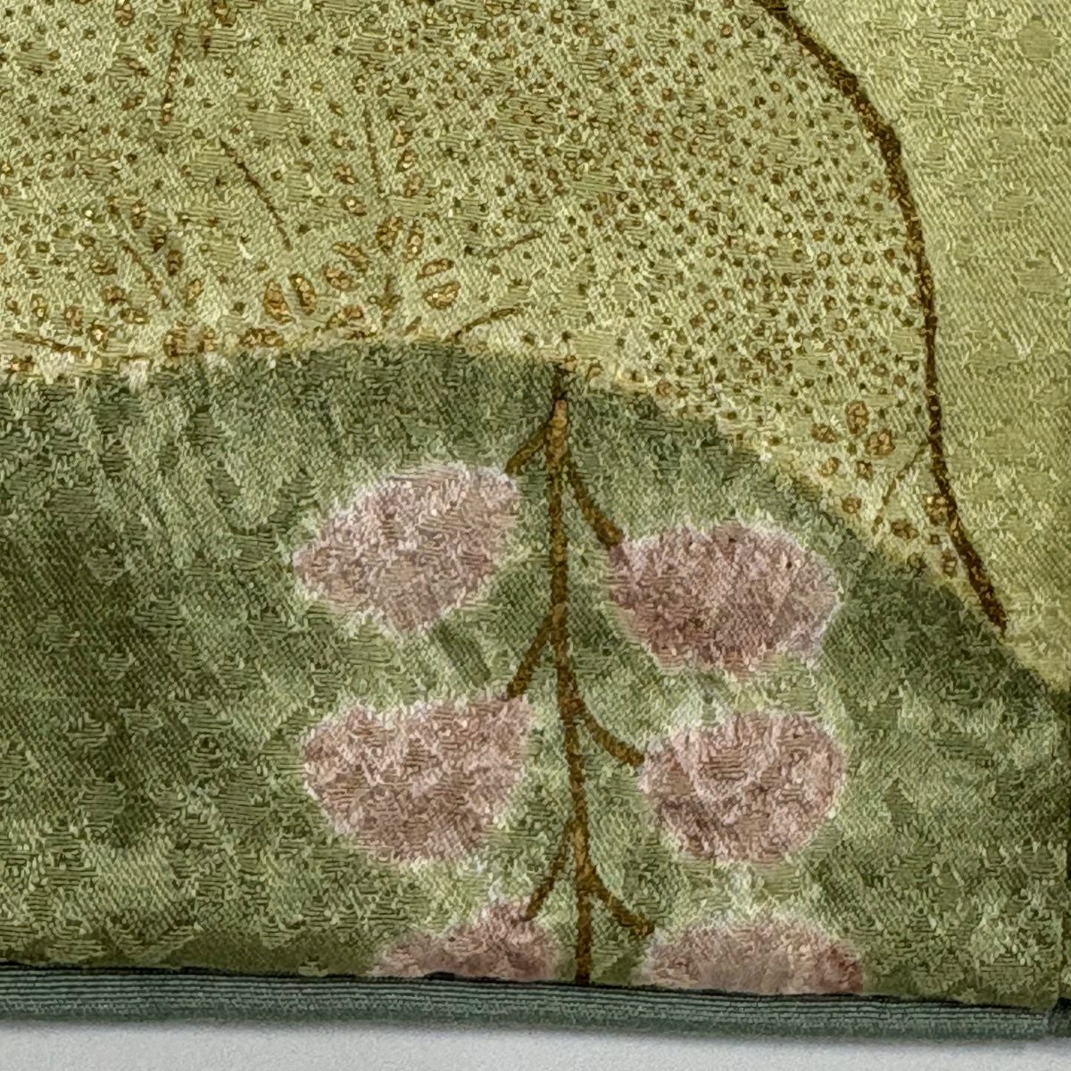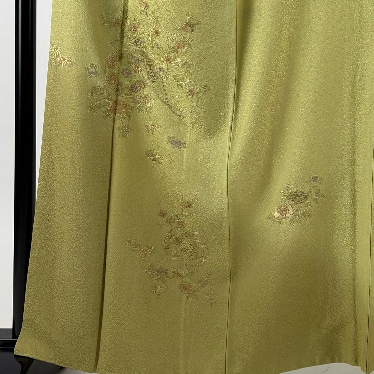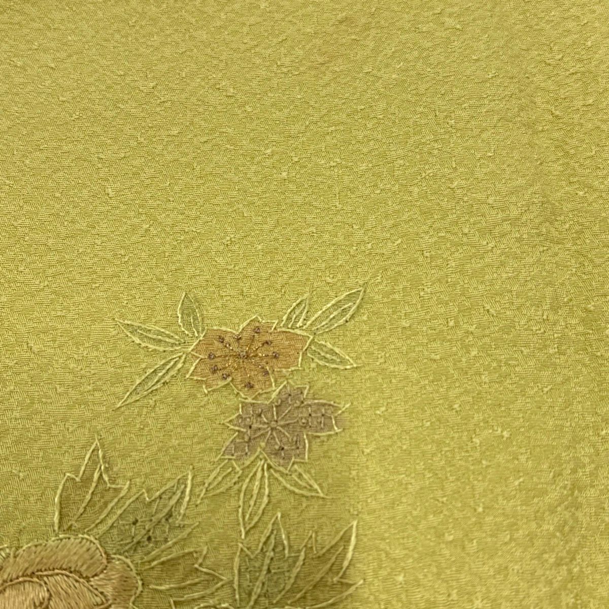 付下げ 身丈163cm 裄丈66cm M 袷 鼓 草花 金糸 刺繍 抹茶色 正絹 秀品