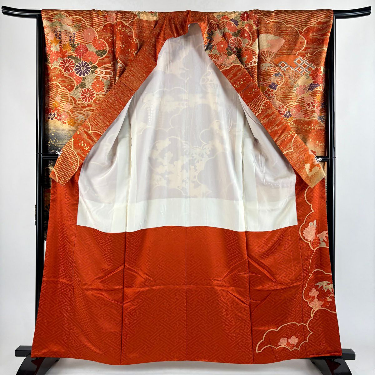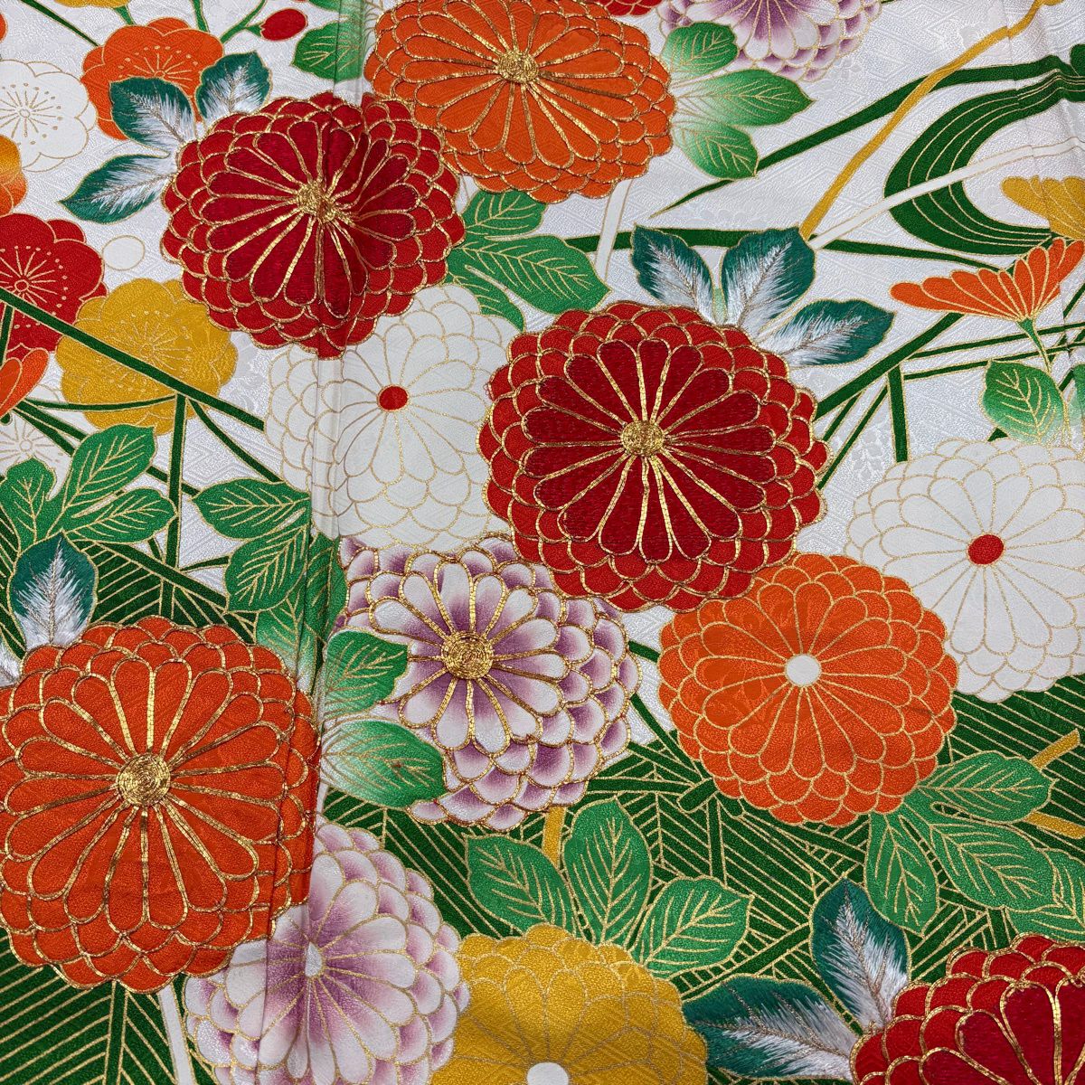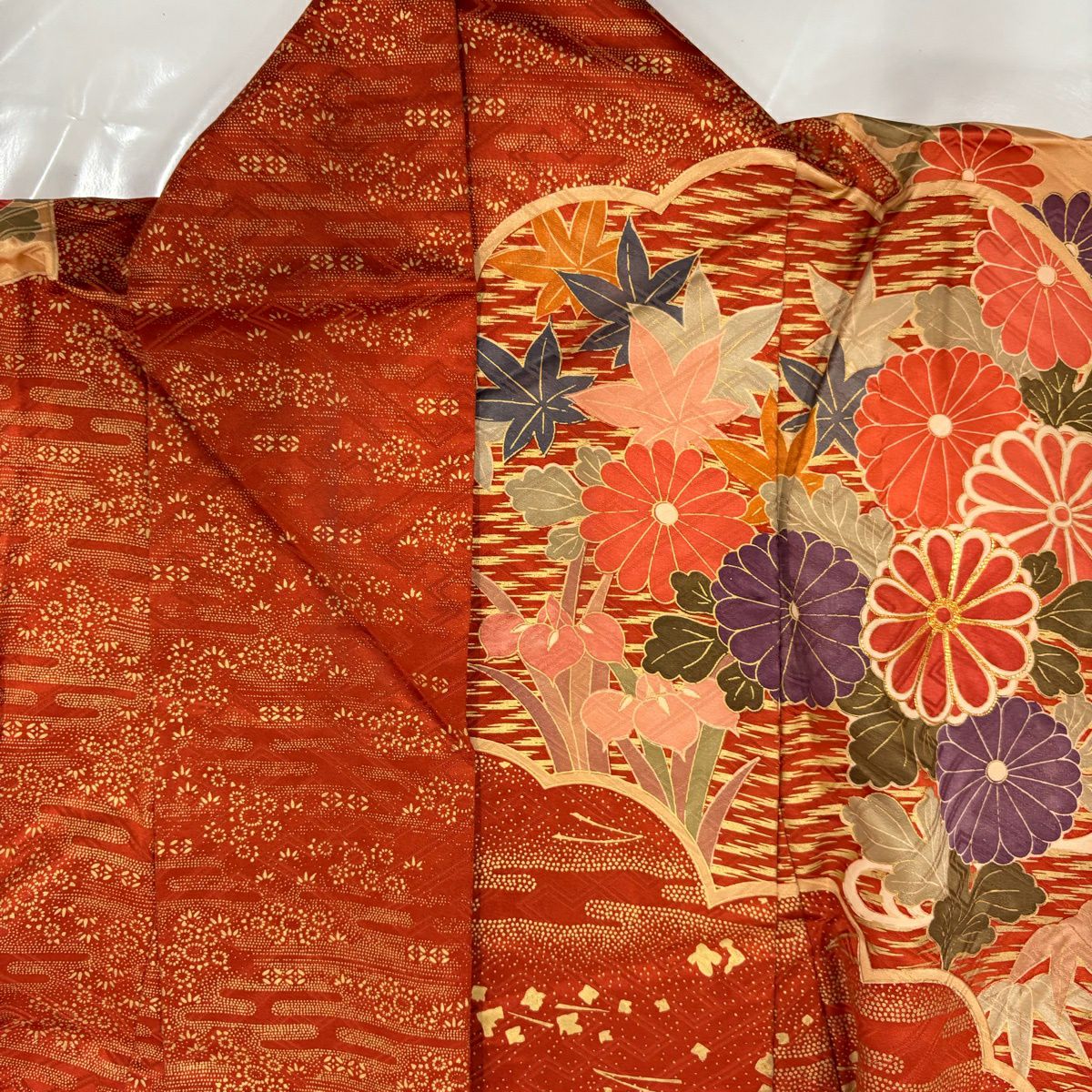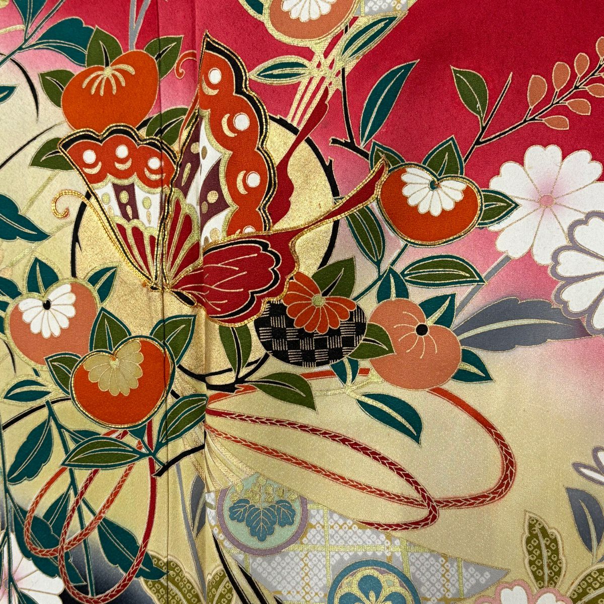 振袖 身丈161.5cm 裄丈66.5cm M 袷 菊 松竹梅 金糸 金彩 朱色 正絹 秀品
