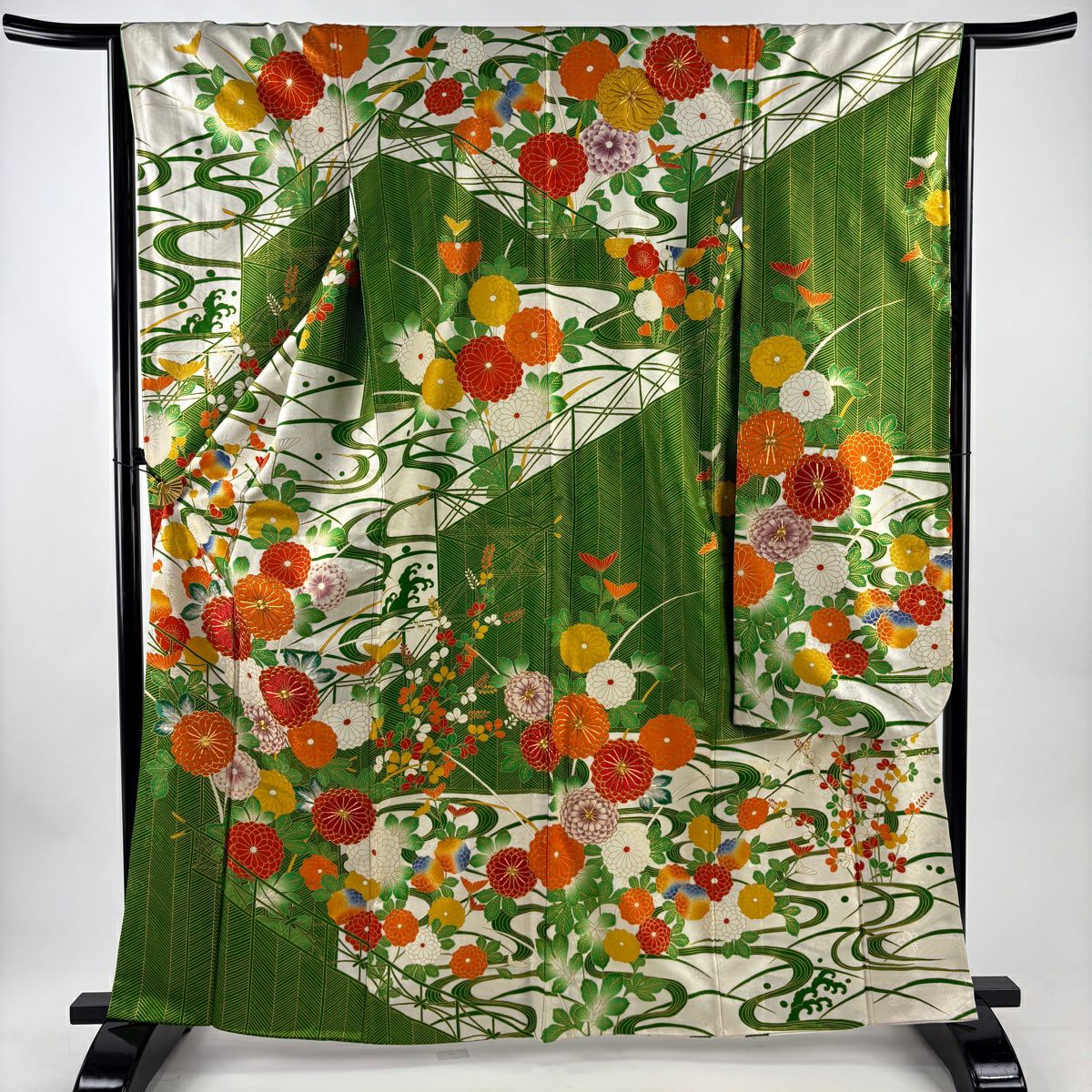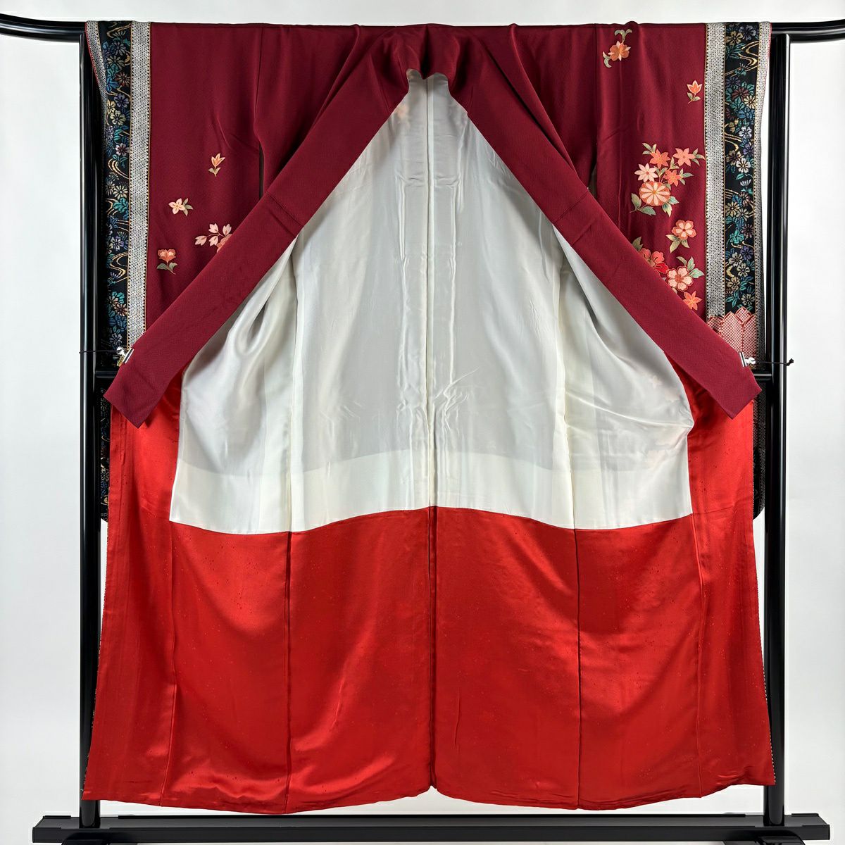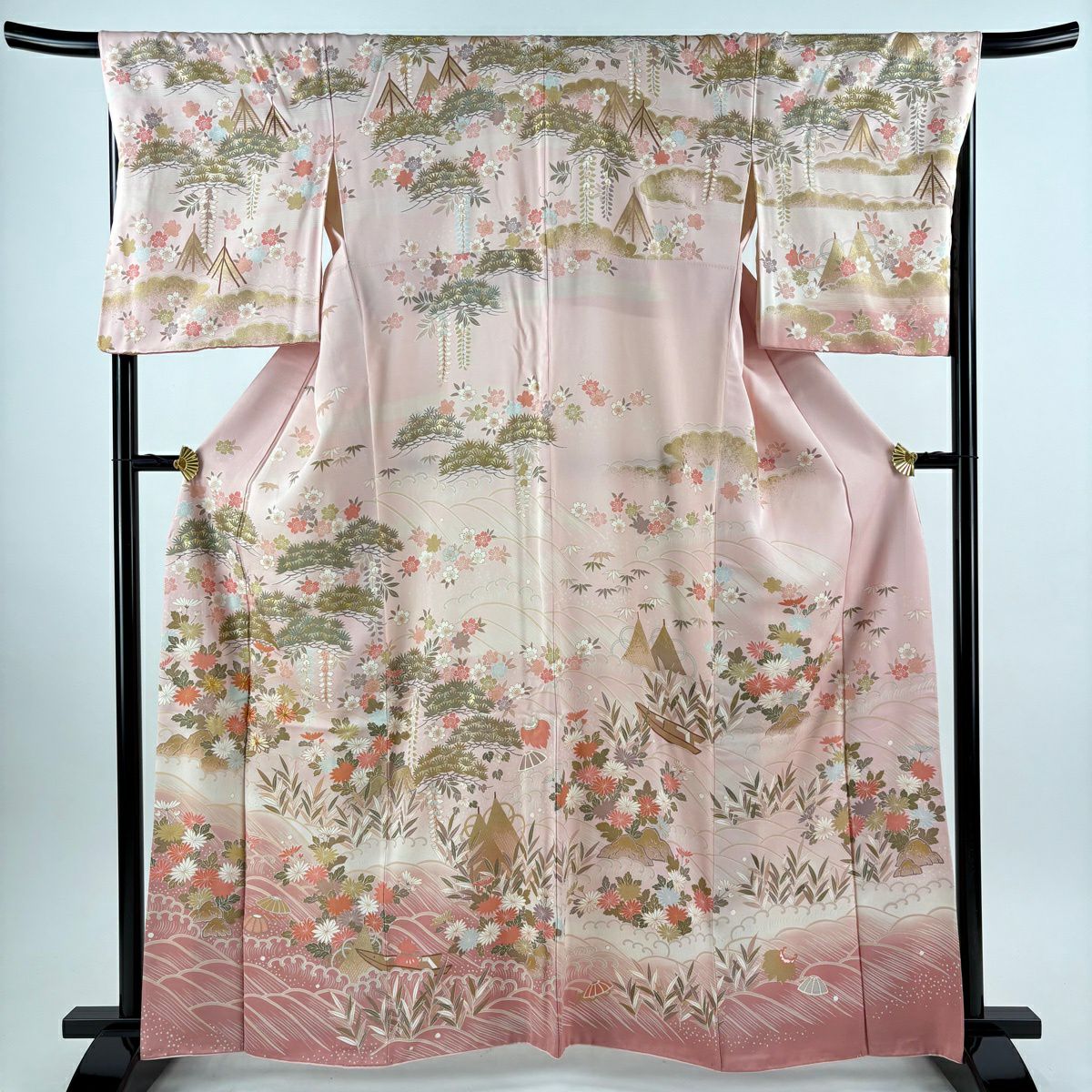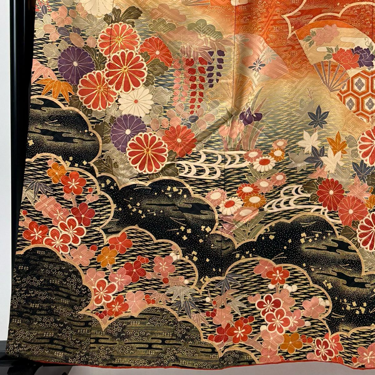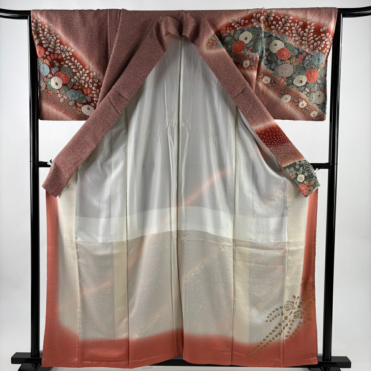 振袖 身丈161.5cm 裄丈66.5cm M 袷 菊 松竹梅 金糸 金彩 朱色 正絹 秀品
