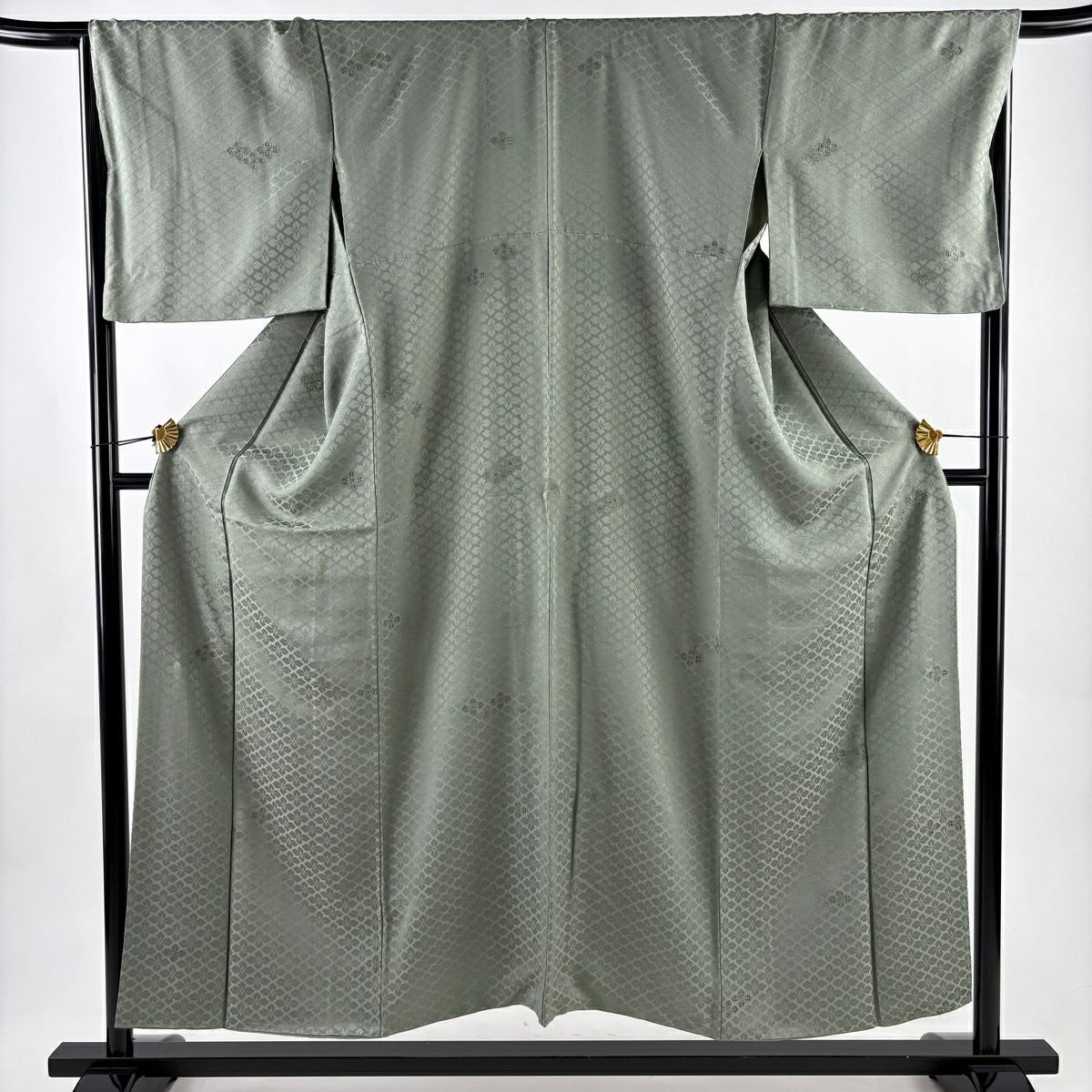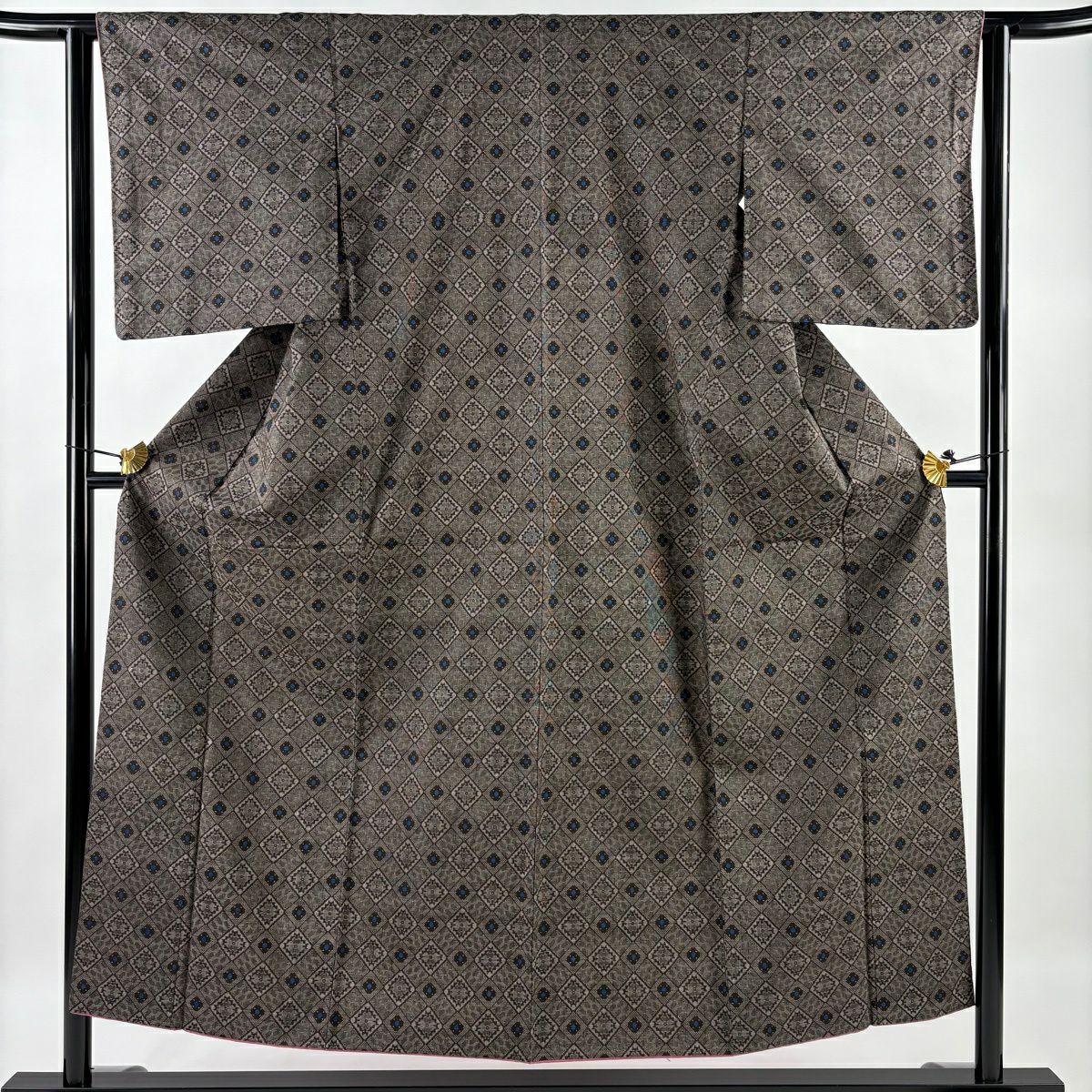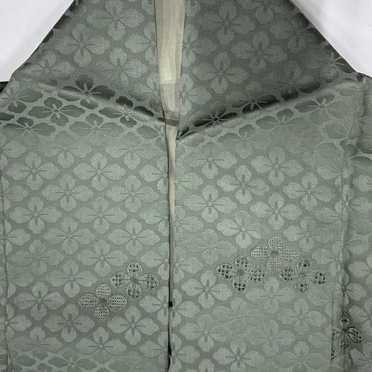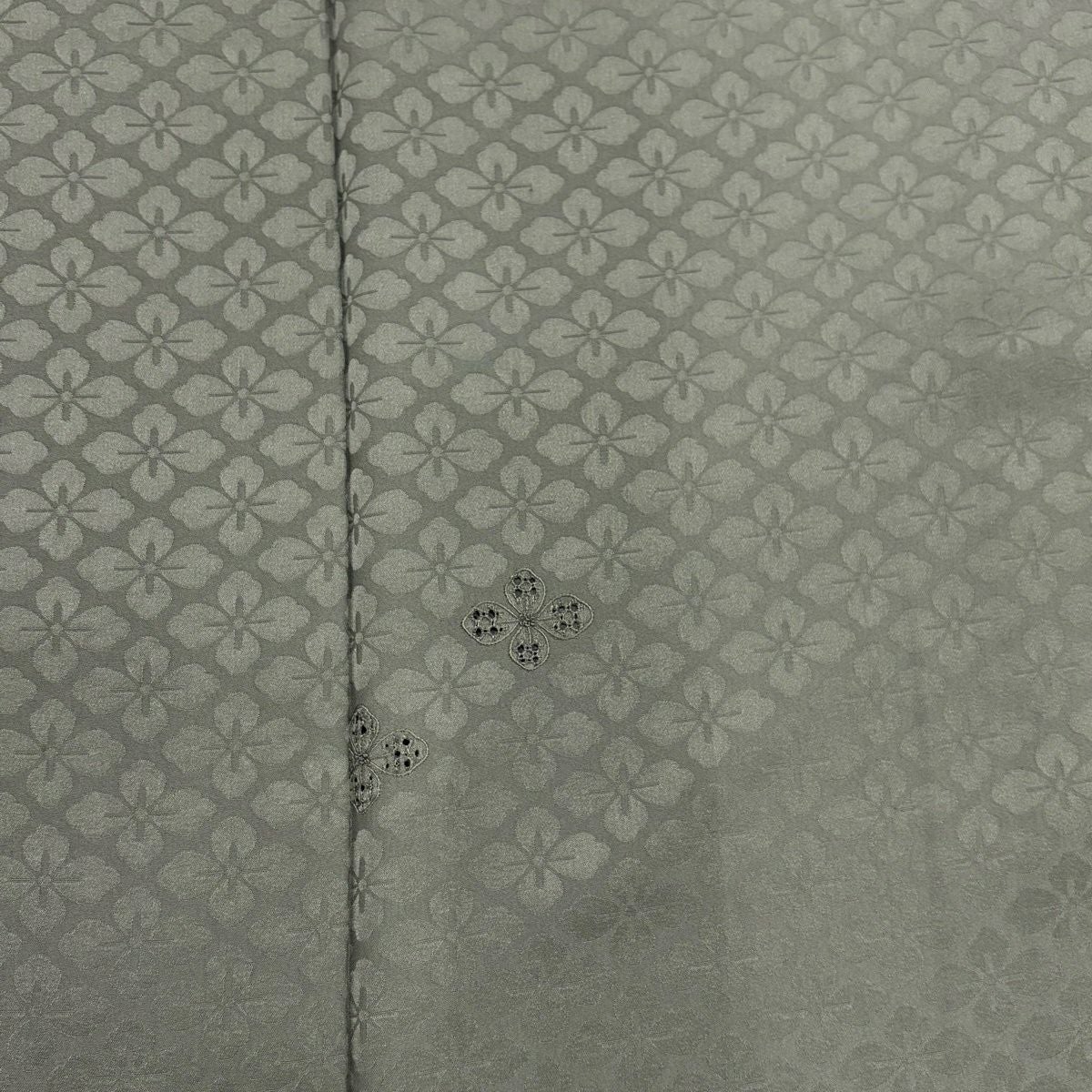 小紋 身丈152cm 裄丈67cm M 袷 やまと 花菱 地紋 刺繍 灰緑 正絹 秀品