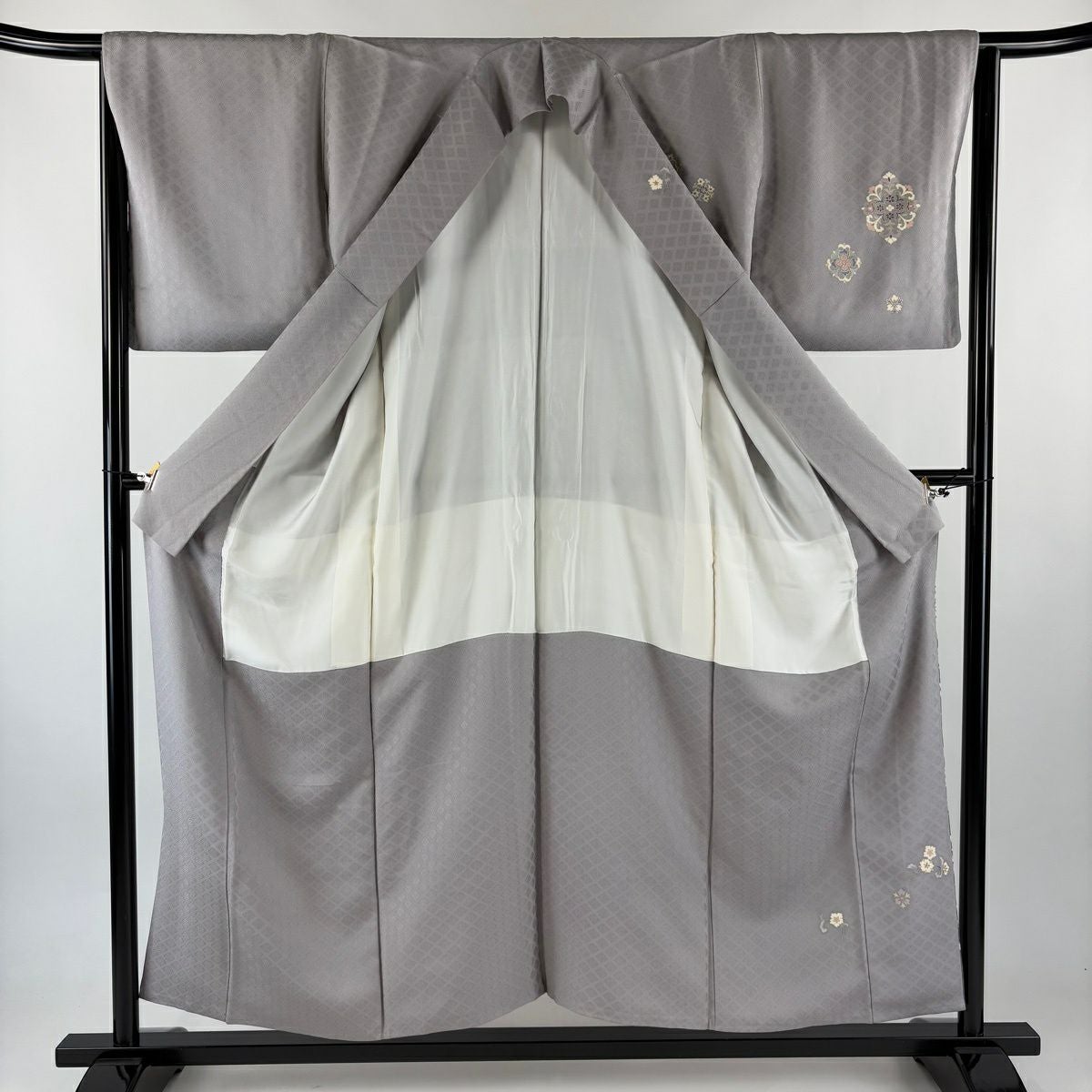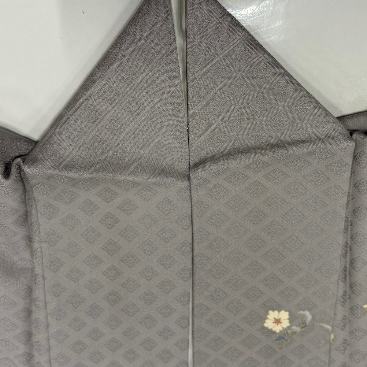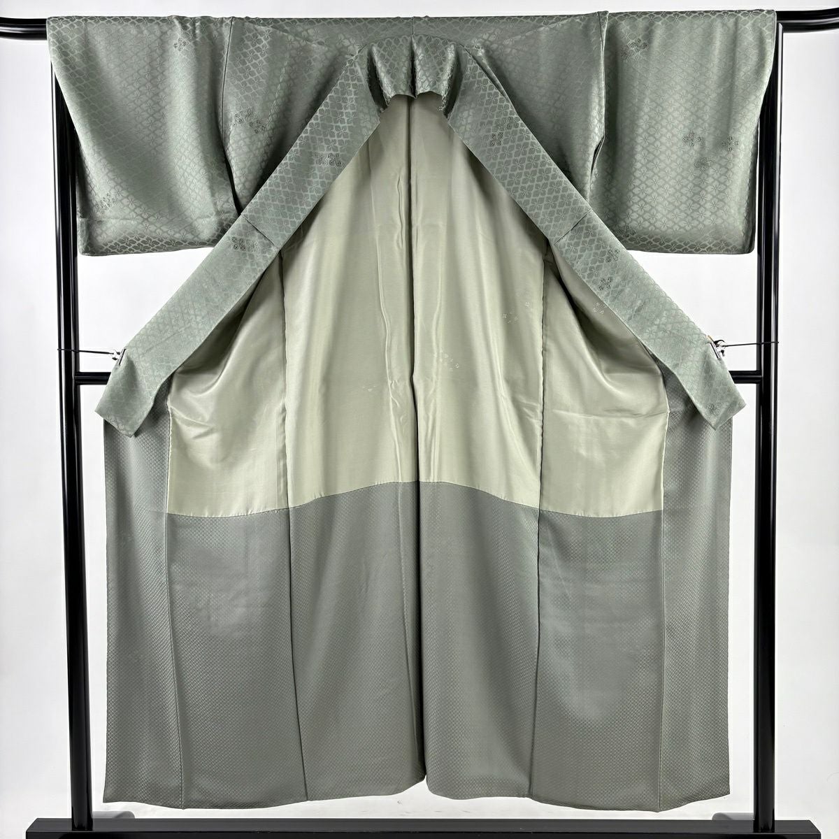 小紋 身丈152cm 裄丈67cm M 袷 やまと 花菱 地紋 刺繍 灰緑 正絹 秀品