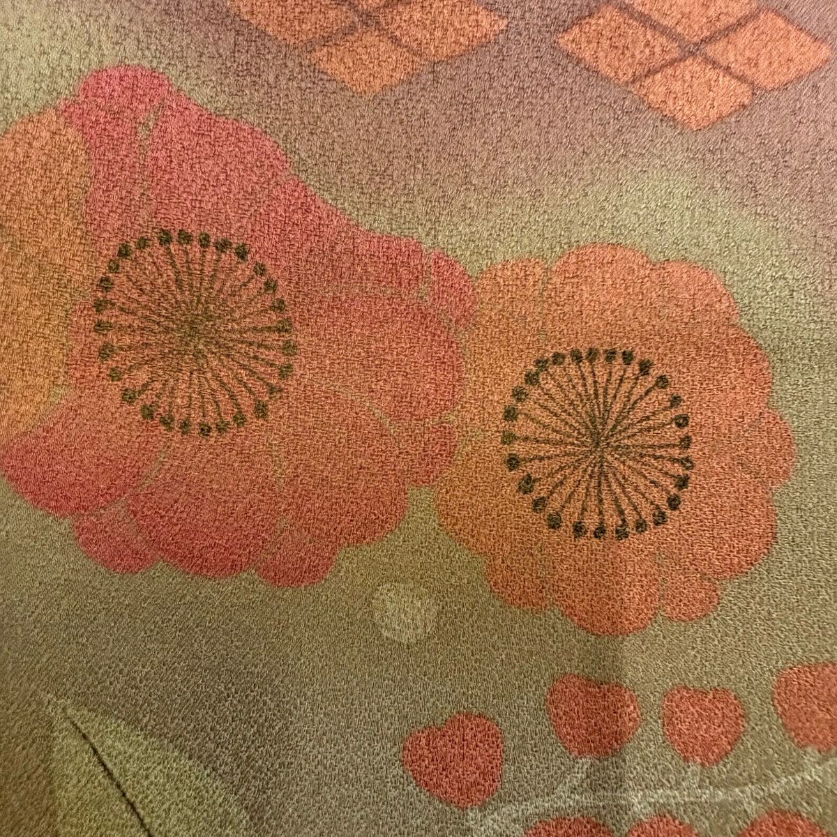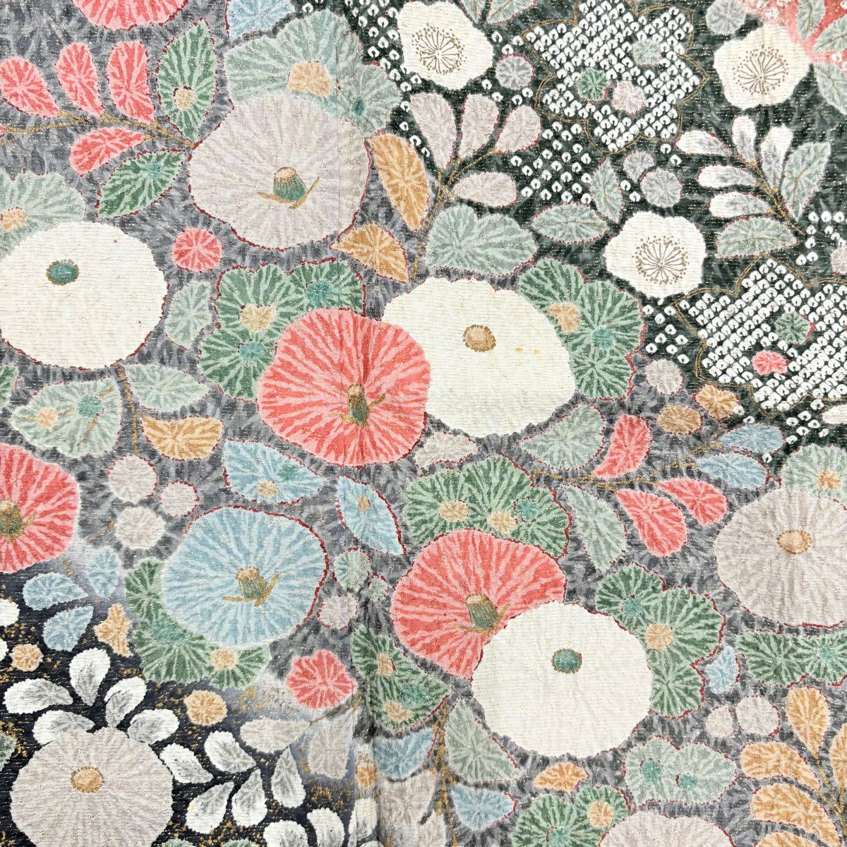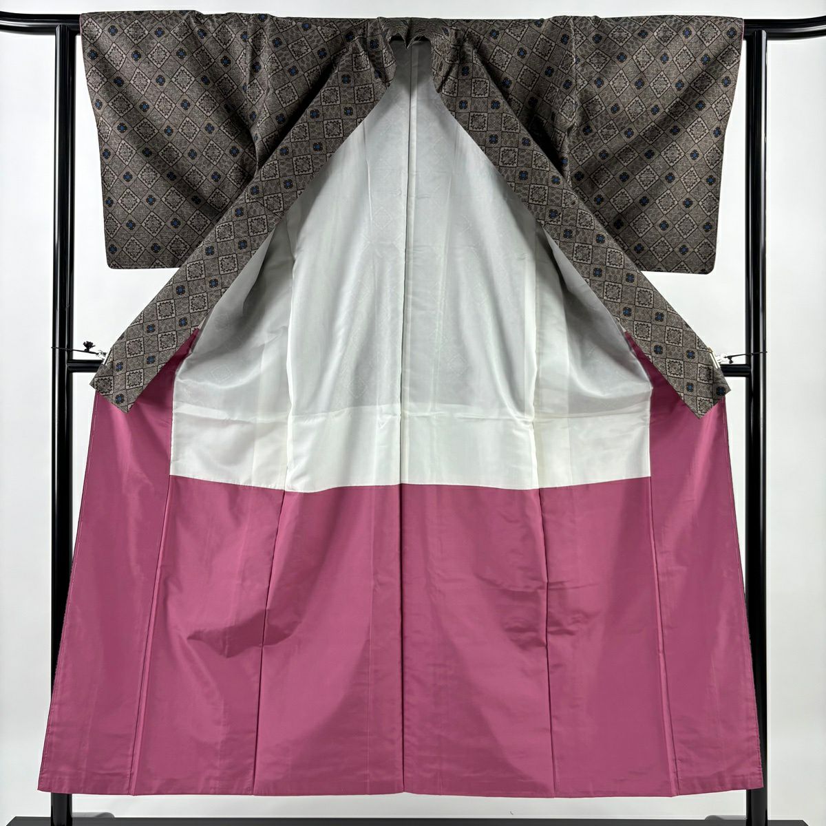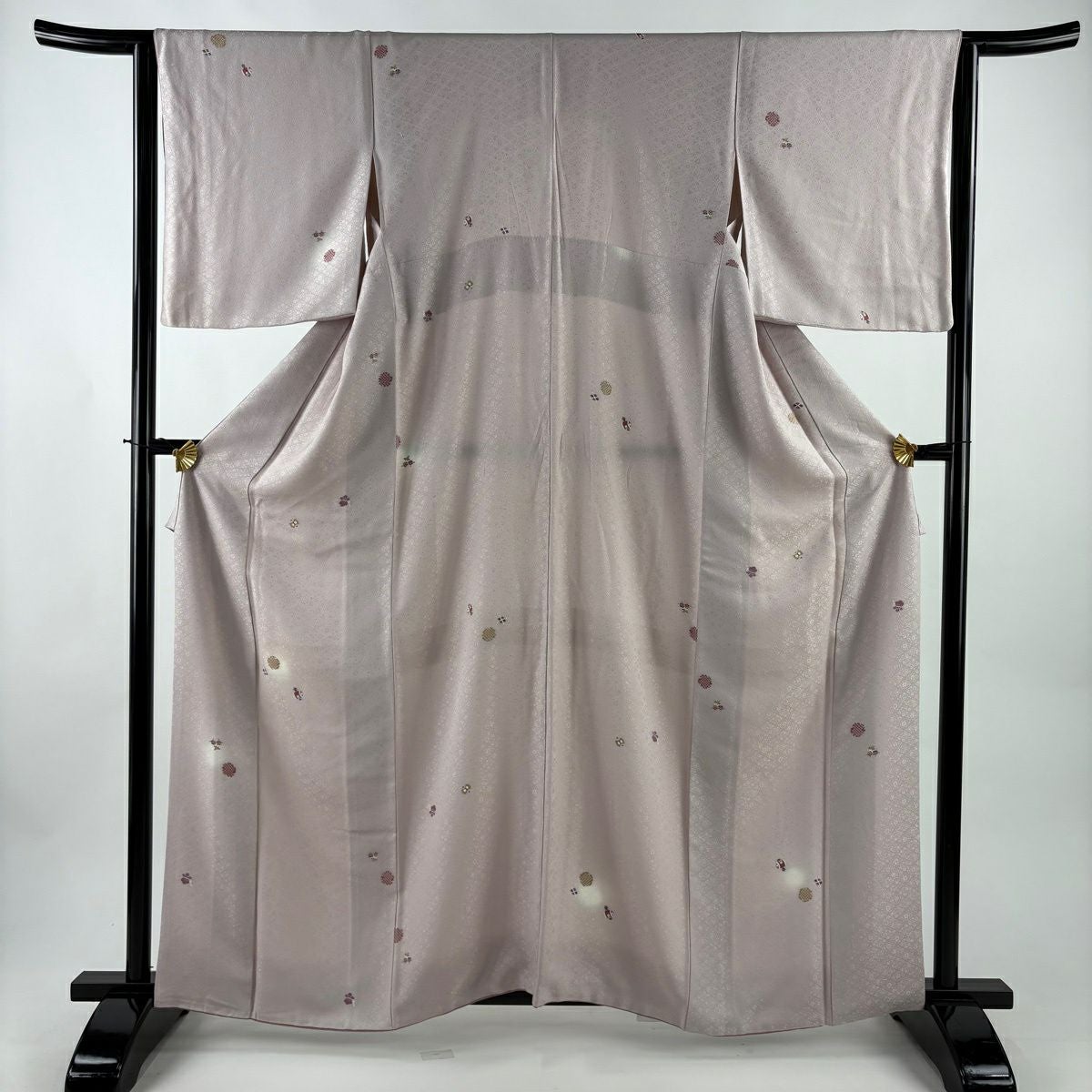 小紋 身丈152cm 裄丈67cm M 袷 やまと 花菱 地紋 刺繍 灰緑 正絹 秀品