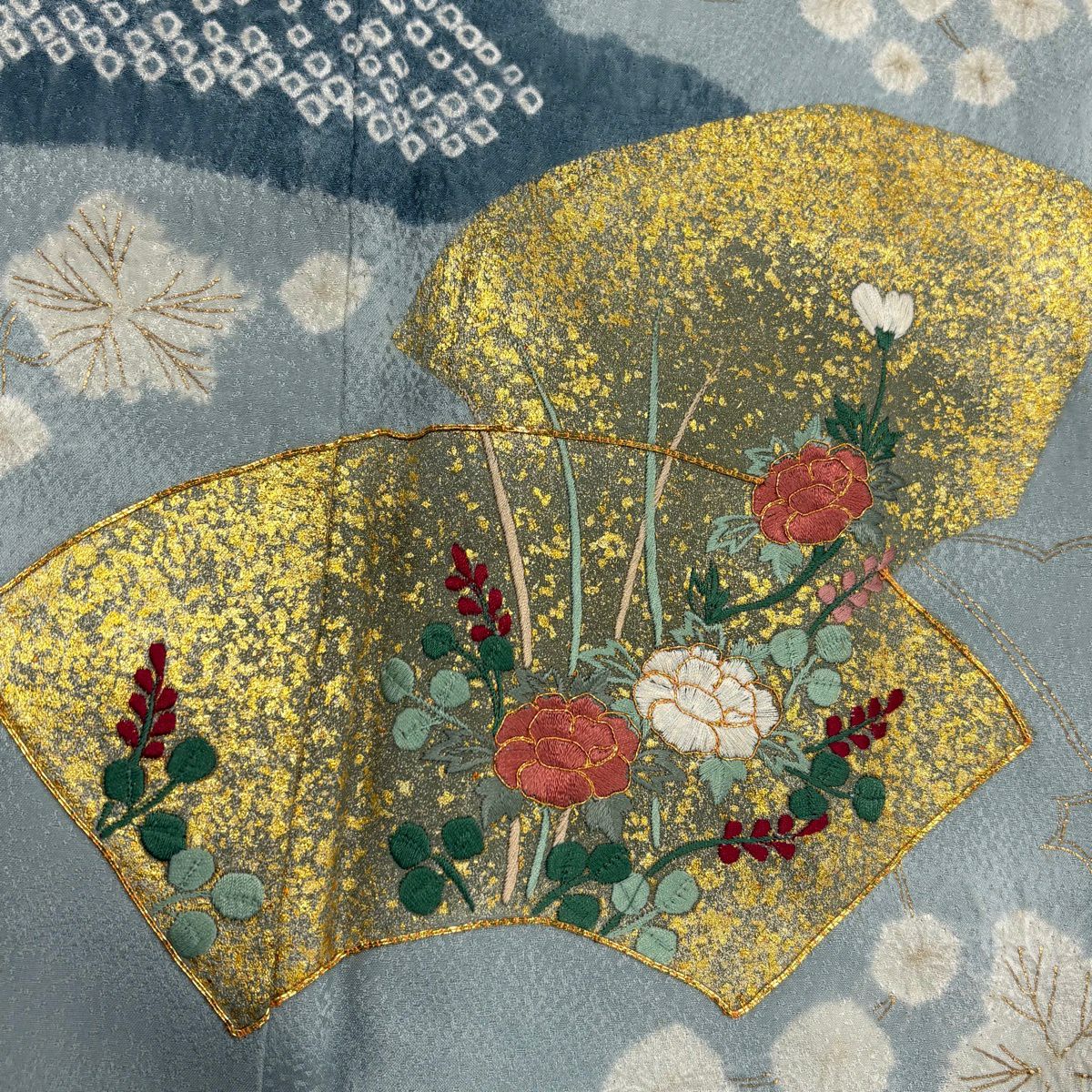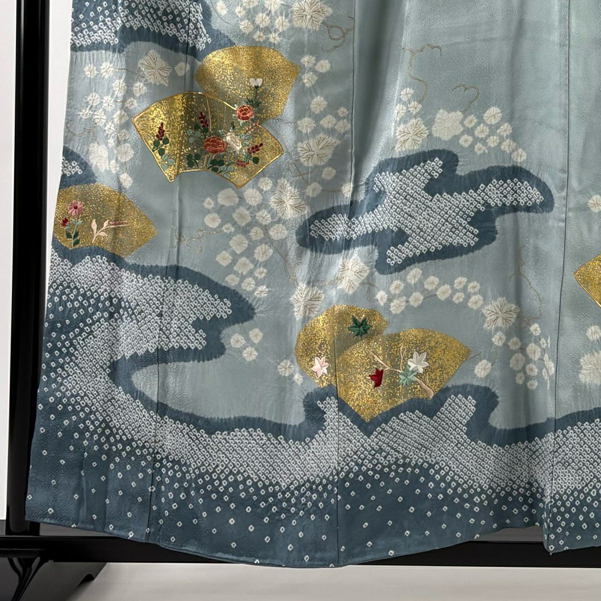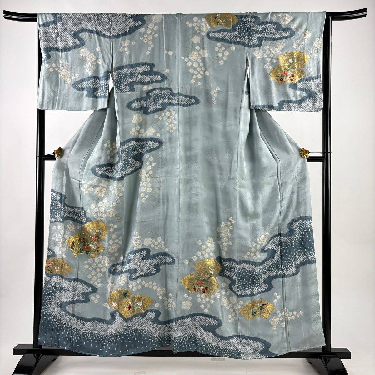 訪問着 身丈158cm 裄丈65cm M 袷 扇面 草花 刺繍 絞り 水色 正絹 秀品