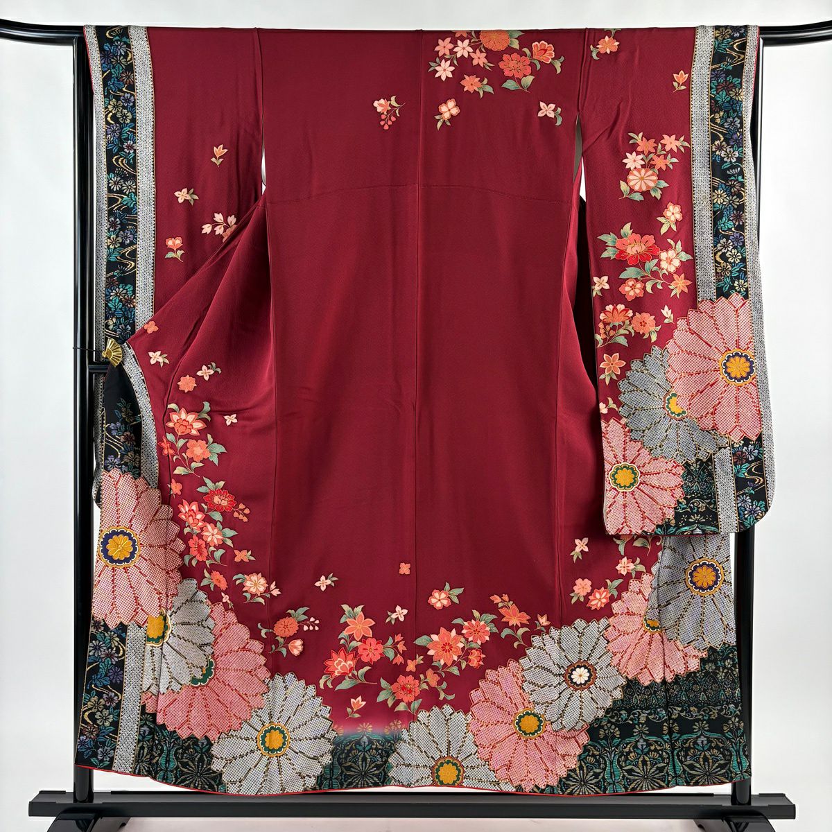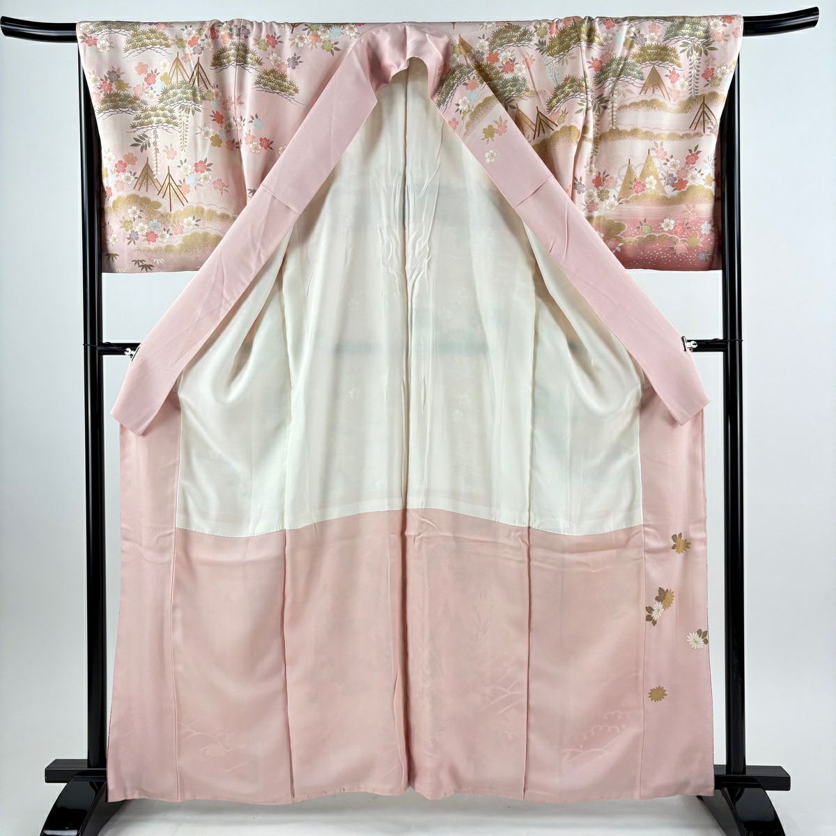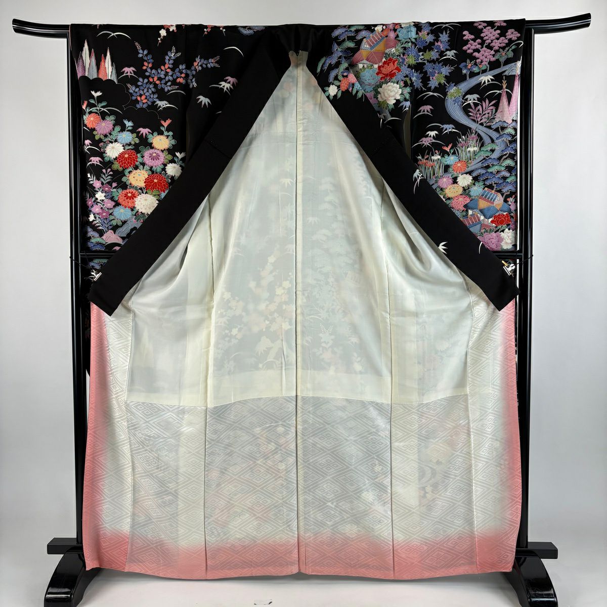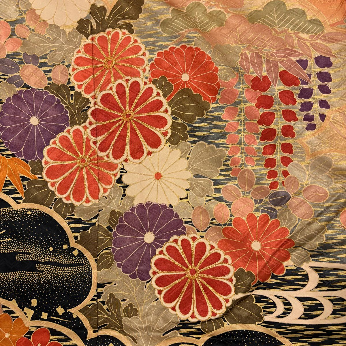 振袖 身丈167.5cm 裄丈66cm M 袷 落款あり 牡丹 松竹梅 黒 正絹 秀品