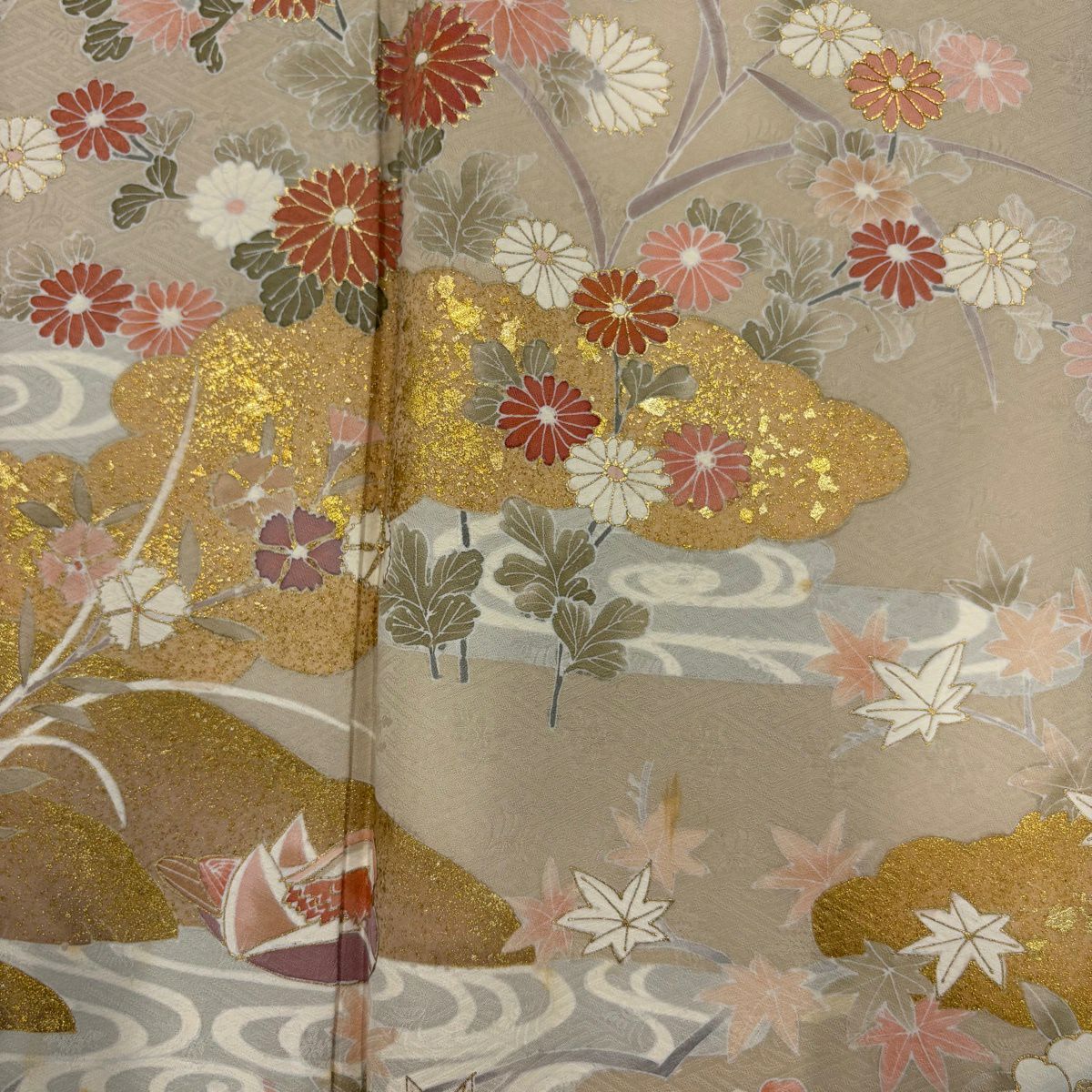 訪問着 身丈151.5cm 裄丈61.5cm S 袷 菊 雲文 金彩 金糸 薄茶色 正絹 秀品