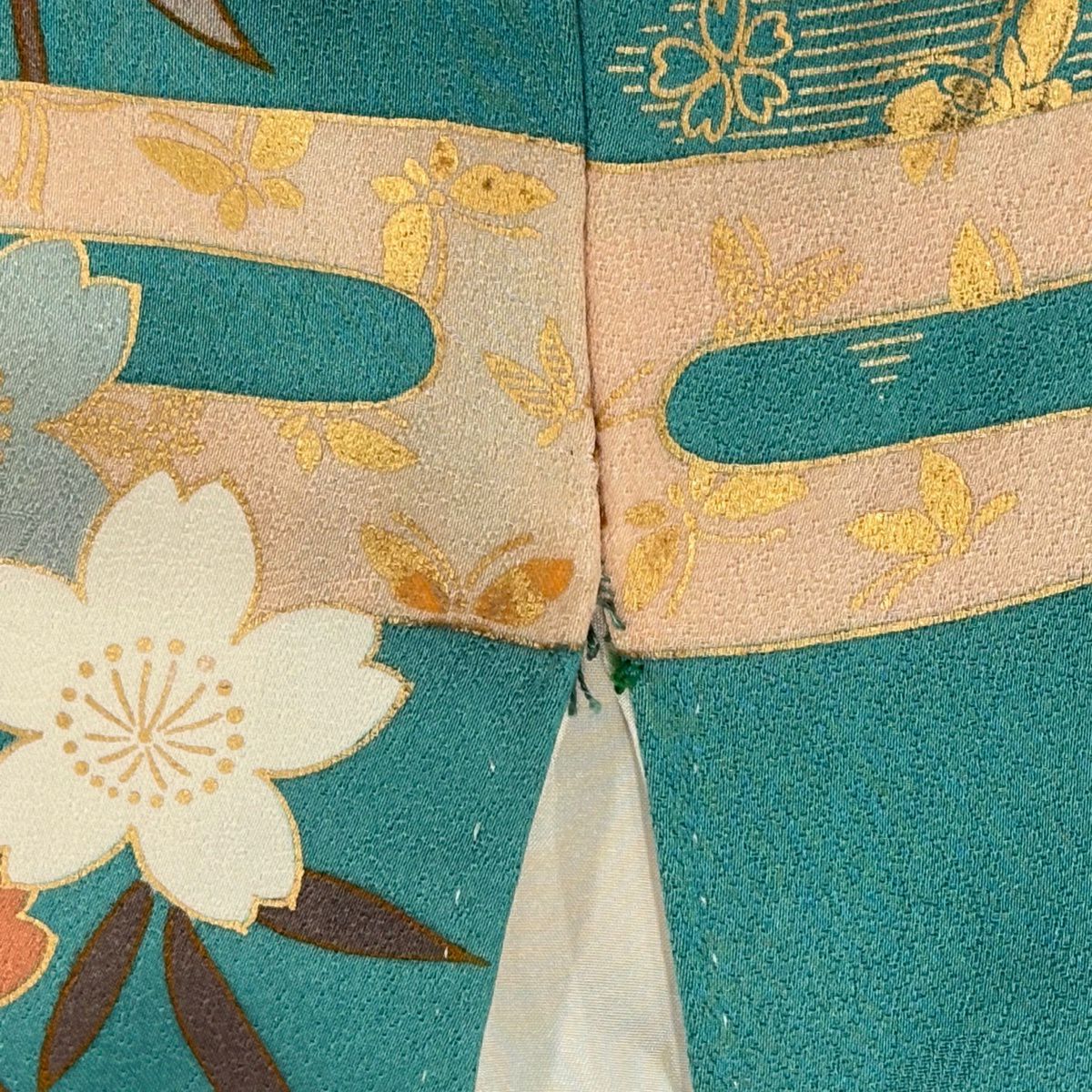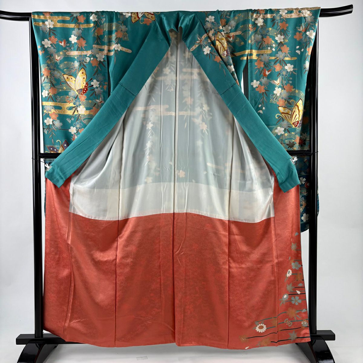 振袖 身丈162.5cm 裄丈67cm M 袷 蝶 草花 金糸 金銀彩 青緑 正絹 秀品