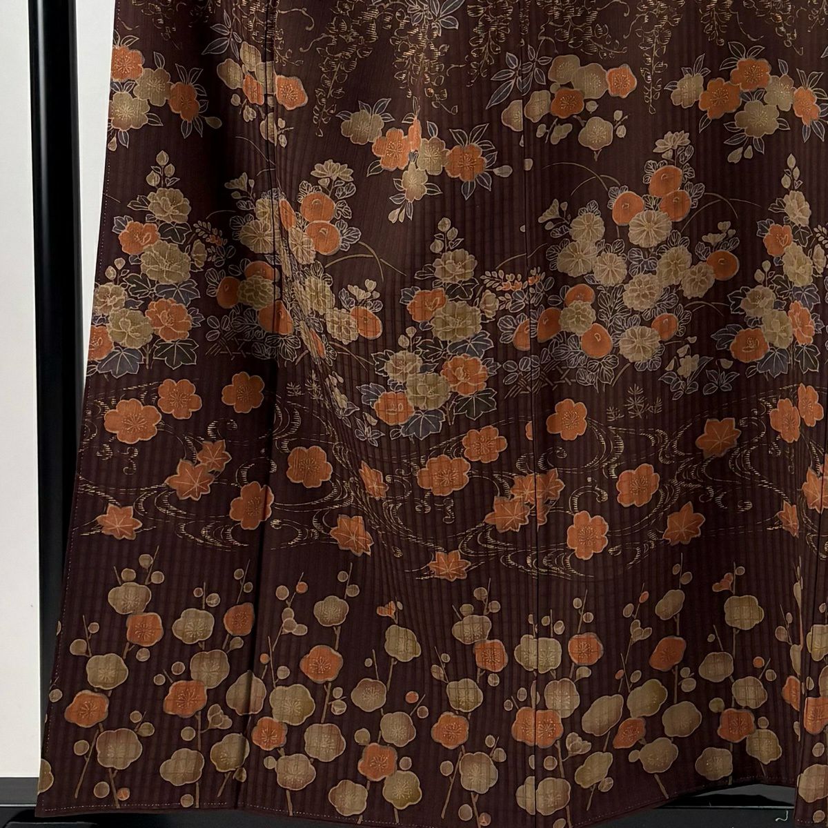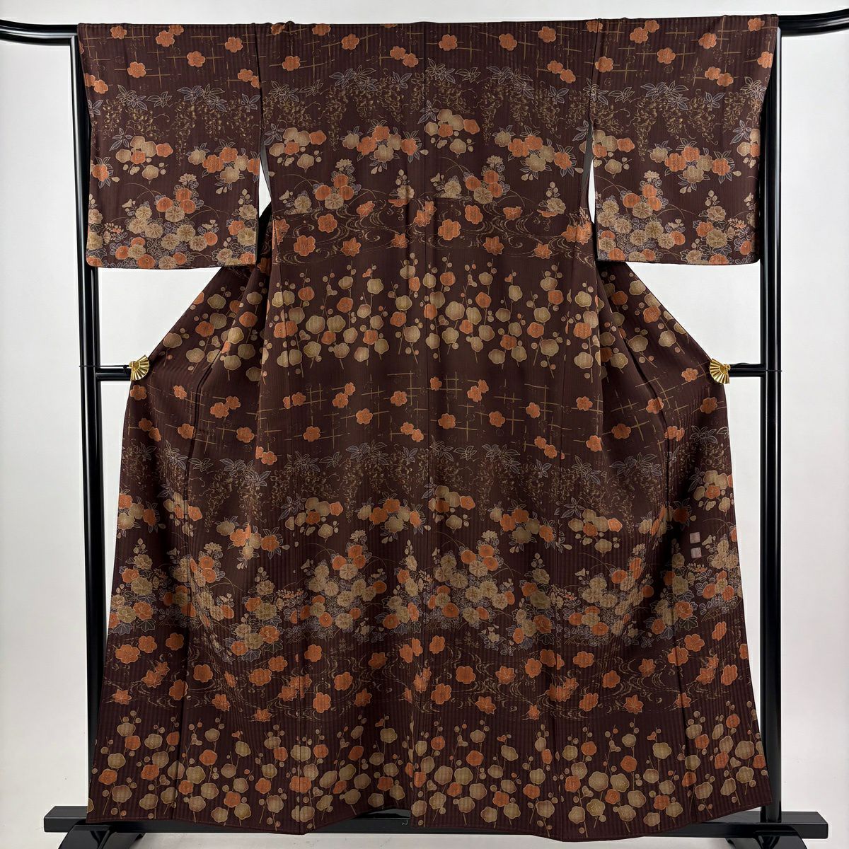 【美品】 紬 身丈155.5cm 裄丈62cm S 袷 草花 雲文 焦茶色 正絹 秀品