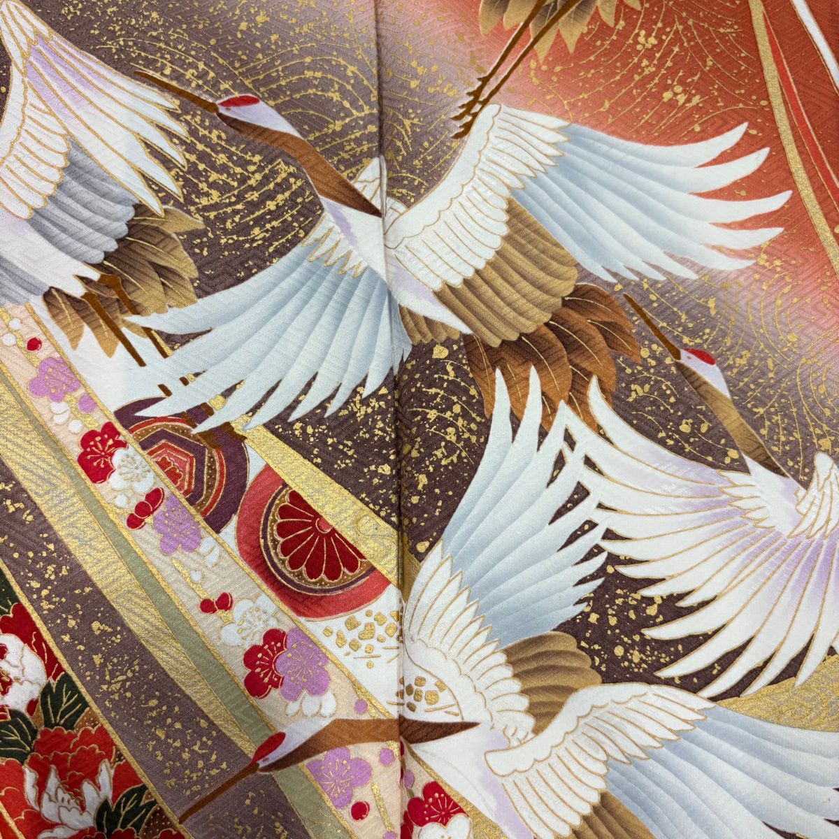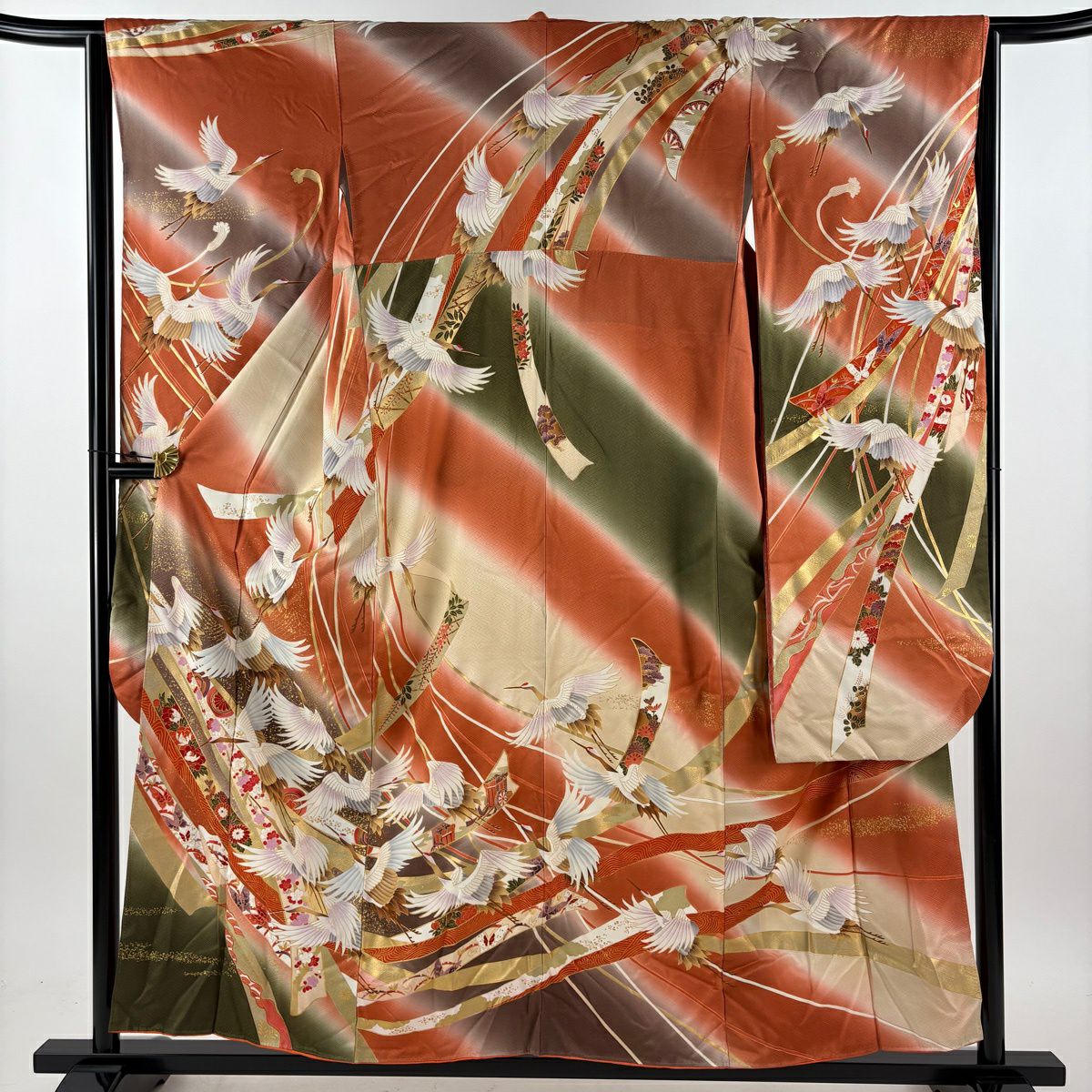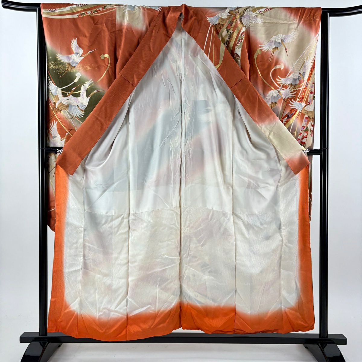 振袖 身丈156cm 裄丈63.5cm S 袷 鶴 熨斗 金彩 オレンジ 正絹 秀品