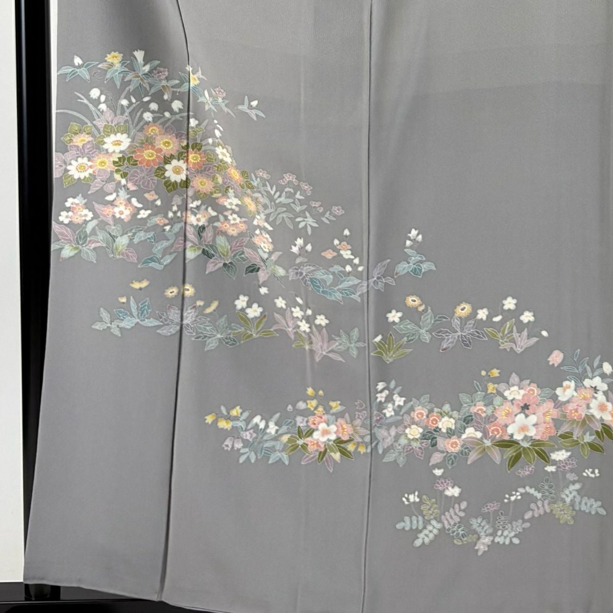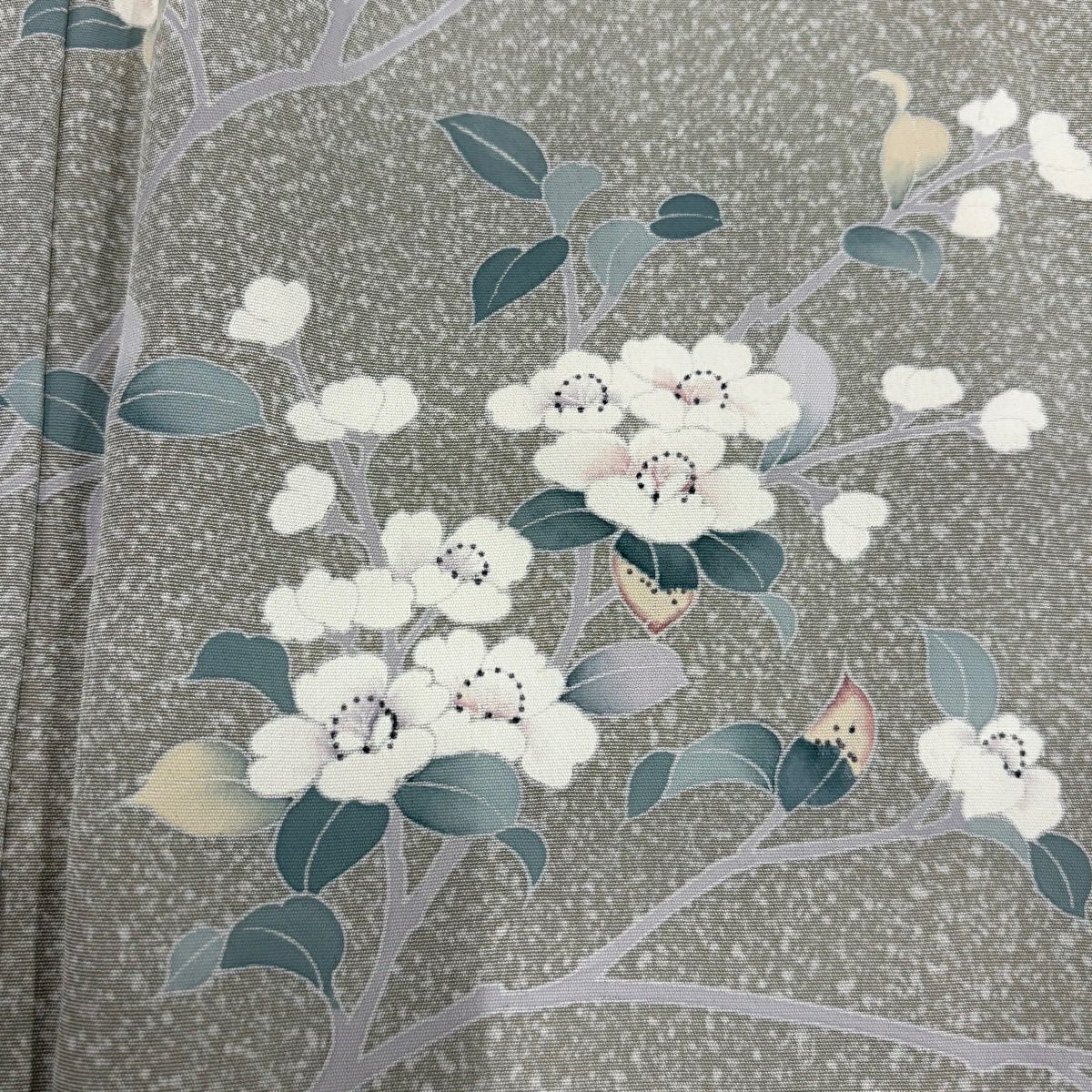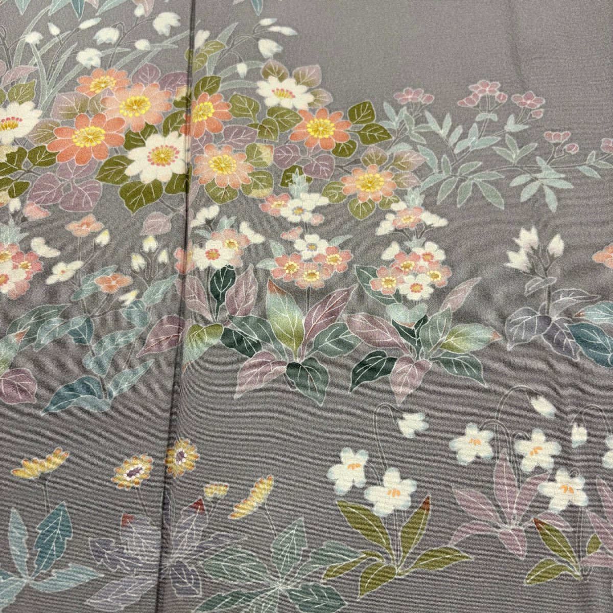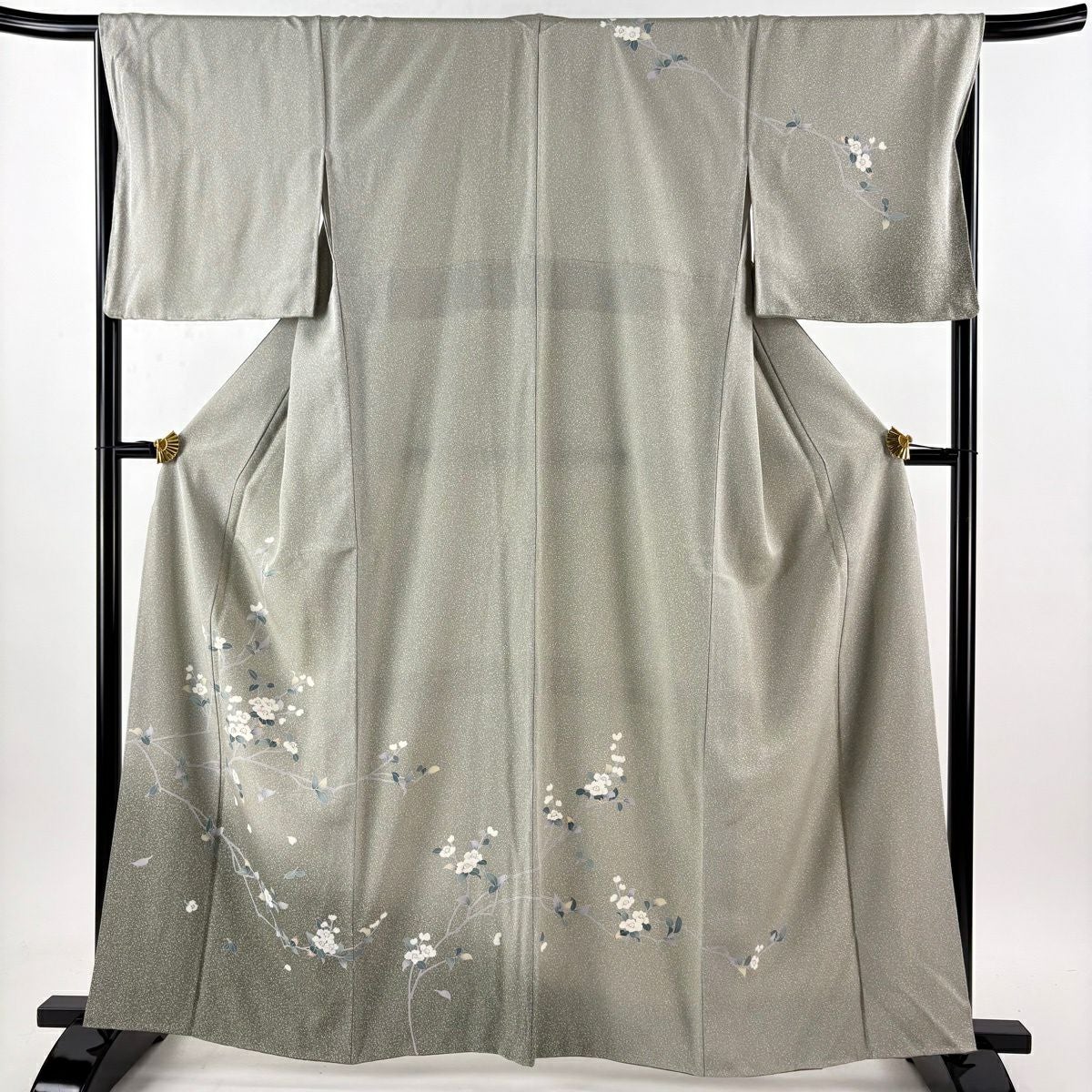 付下げ 身丈164cm 裄丈67cm M 袷 扇面 草花 刺繍 絞り 灰緑 正絹 秀品