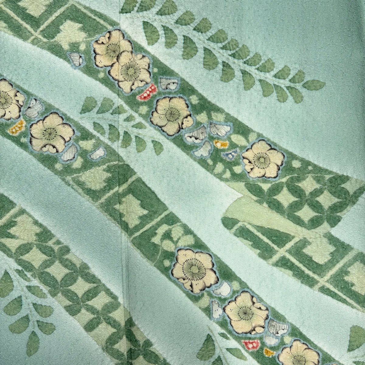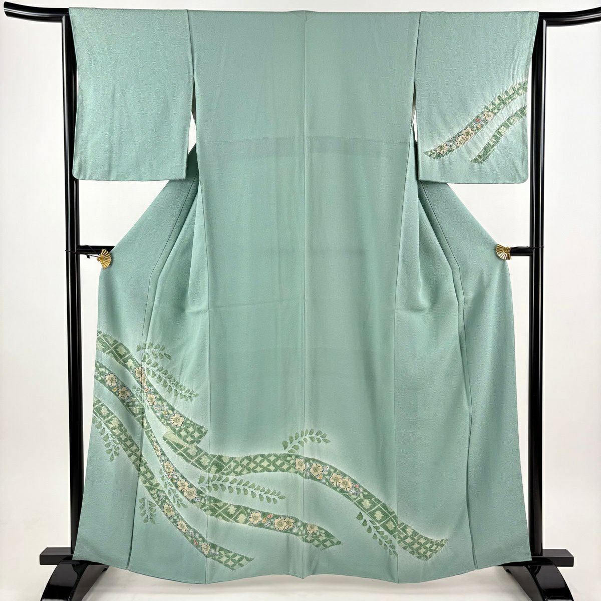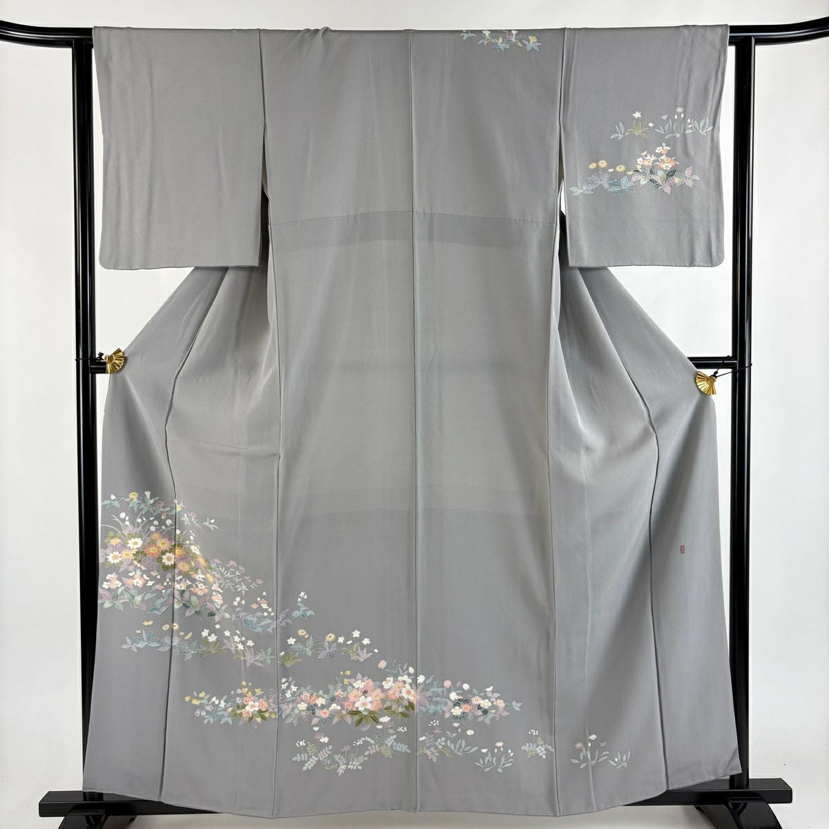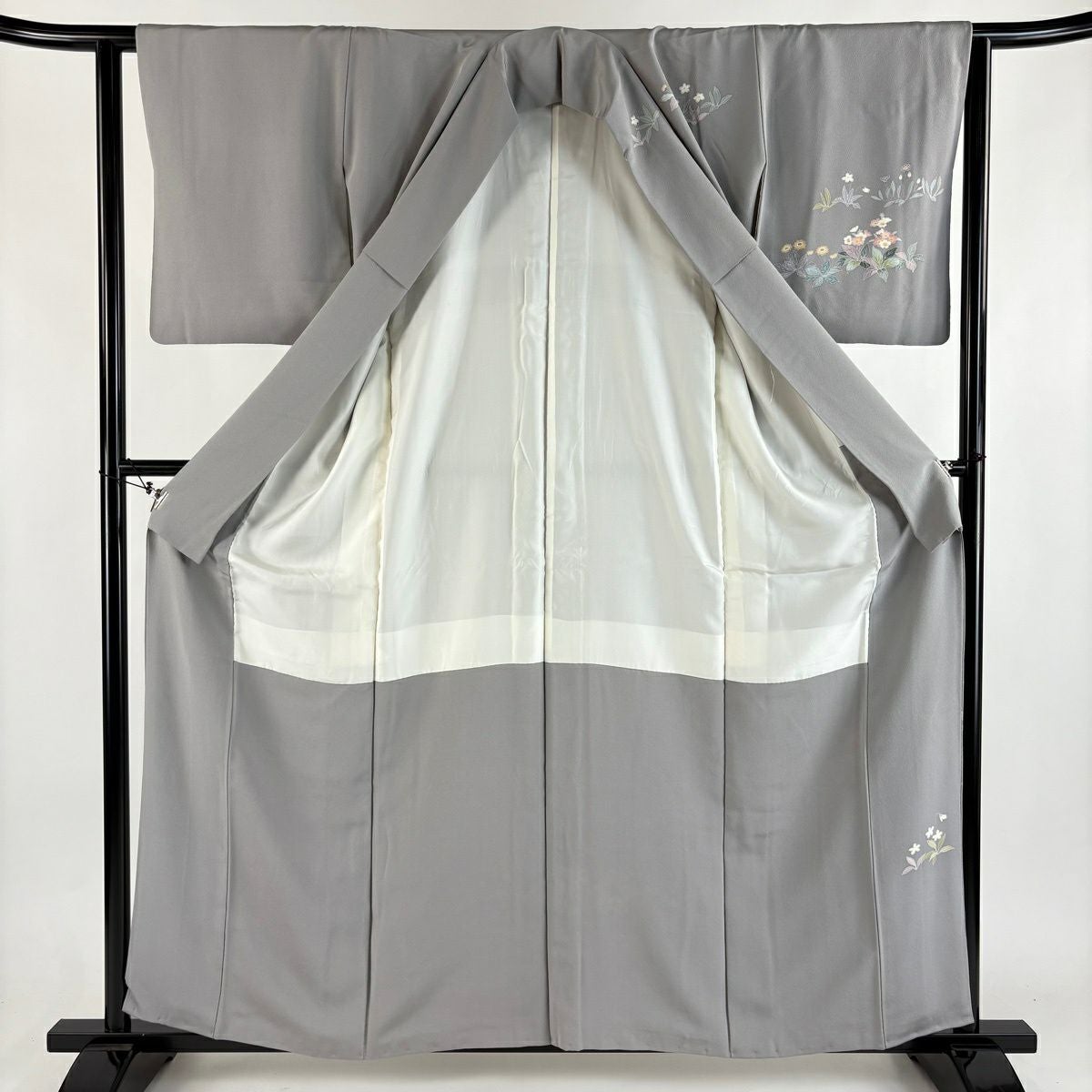 付下げ 身丈164cm 裄丈67cm M 袷 扇面 草花 刺繍 絞り 灰緑 正絹 秀品