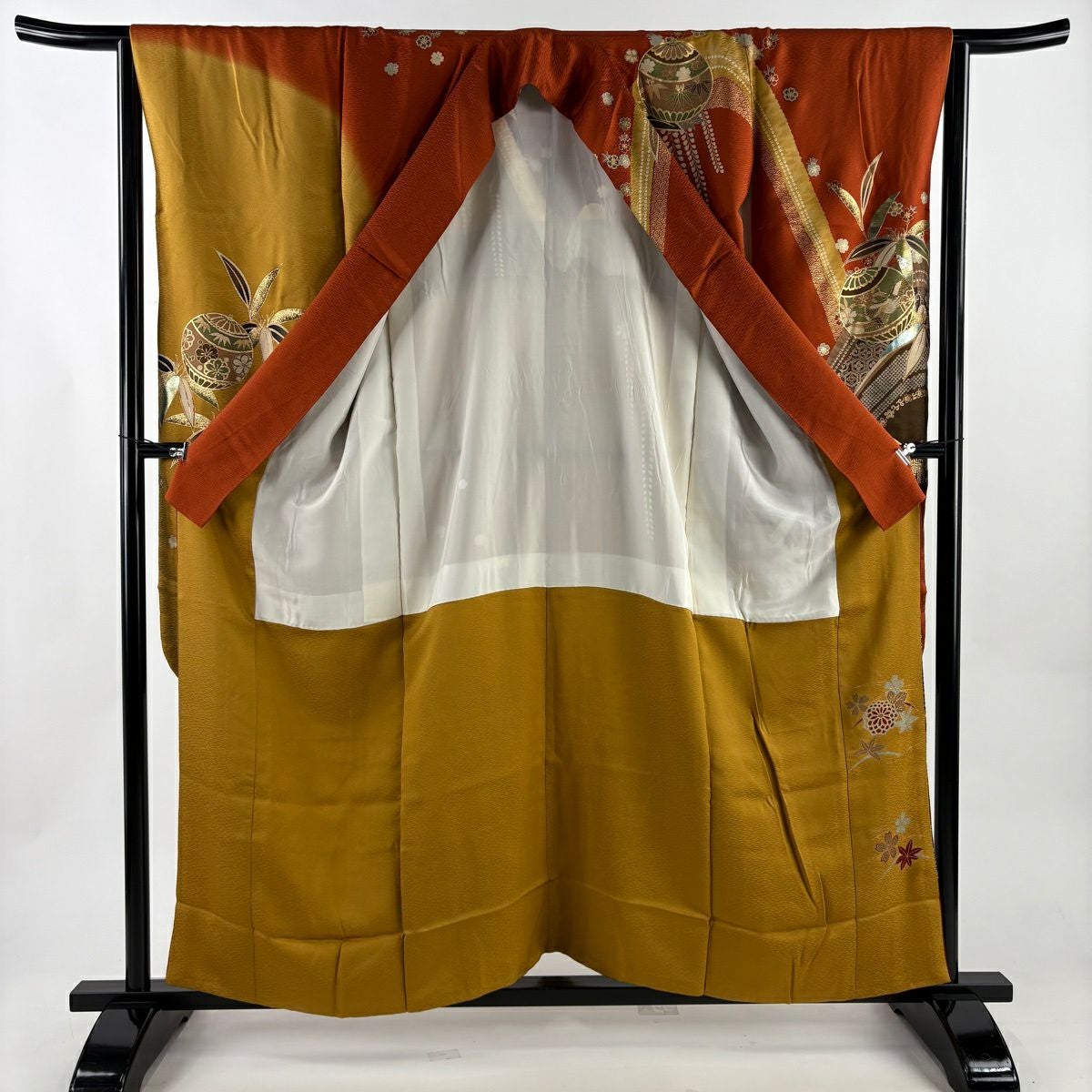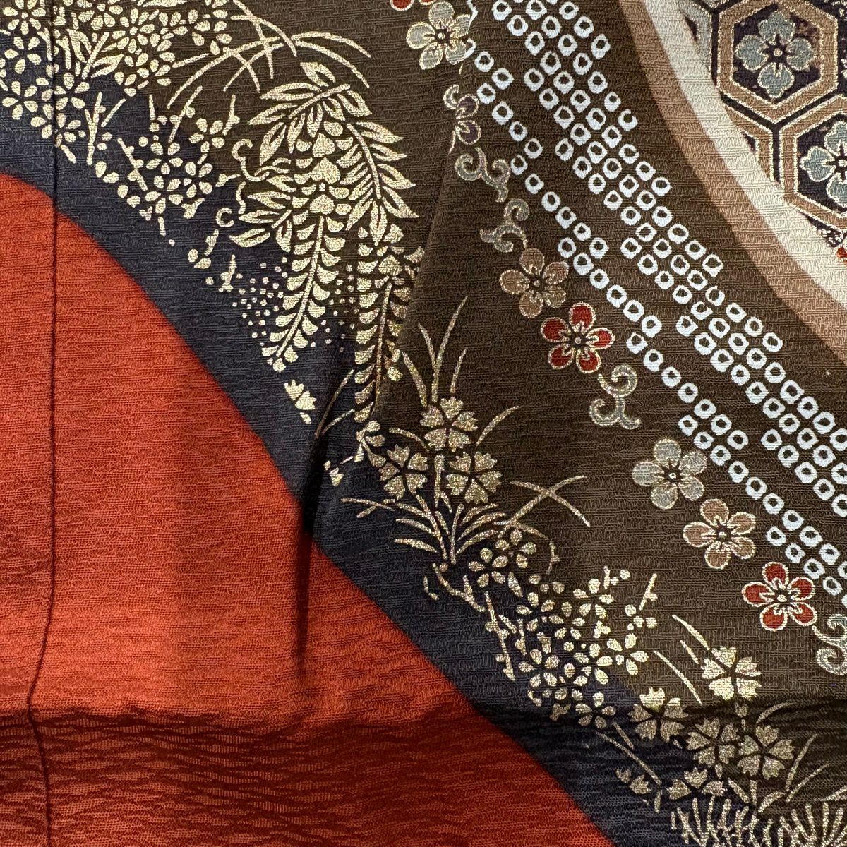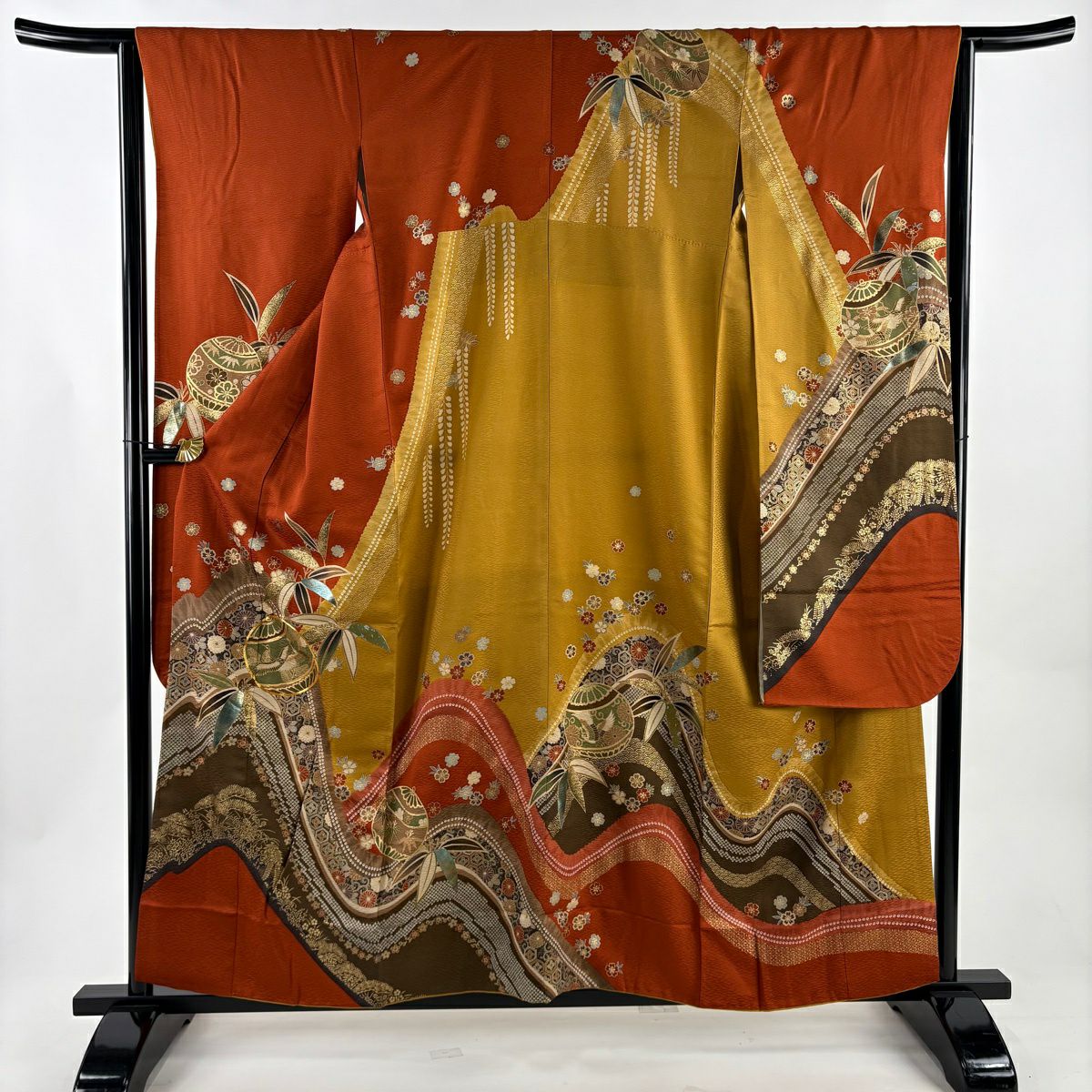 振袖 身丈157cm 裄丈64.5cm M 袷 松竹梅 鈴 金糸 金彩 赤茶 正絹 秀品