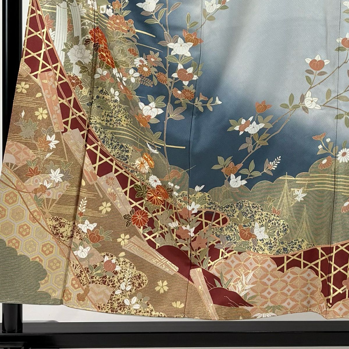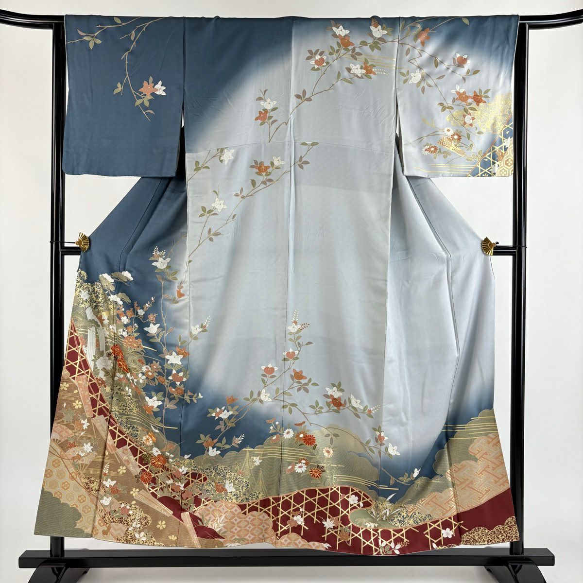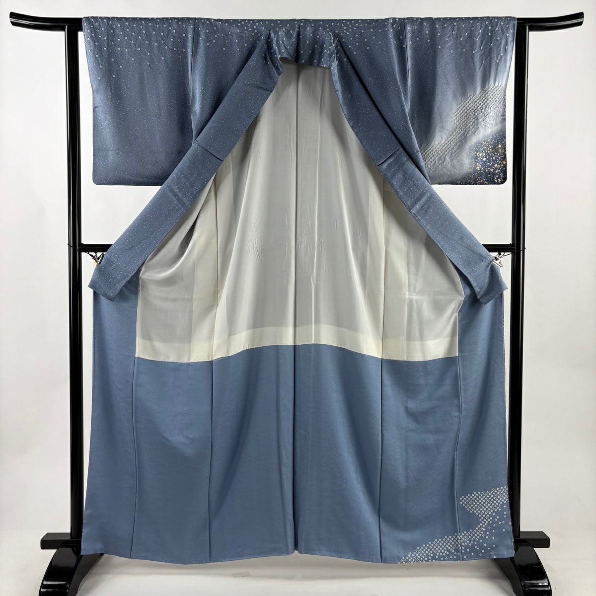 付下げ 身丈163cm 裄丈65.5cm M 袷 枝花 地紋 金彩 青灰色 正絹 秀品