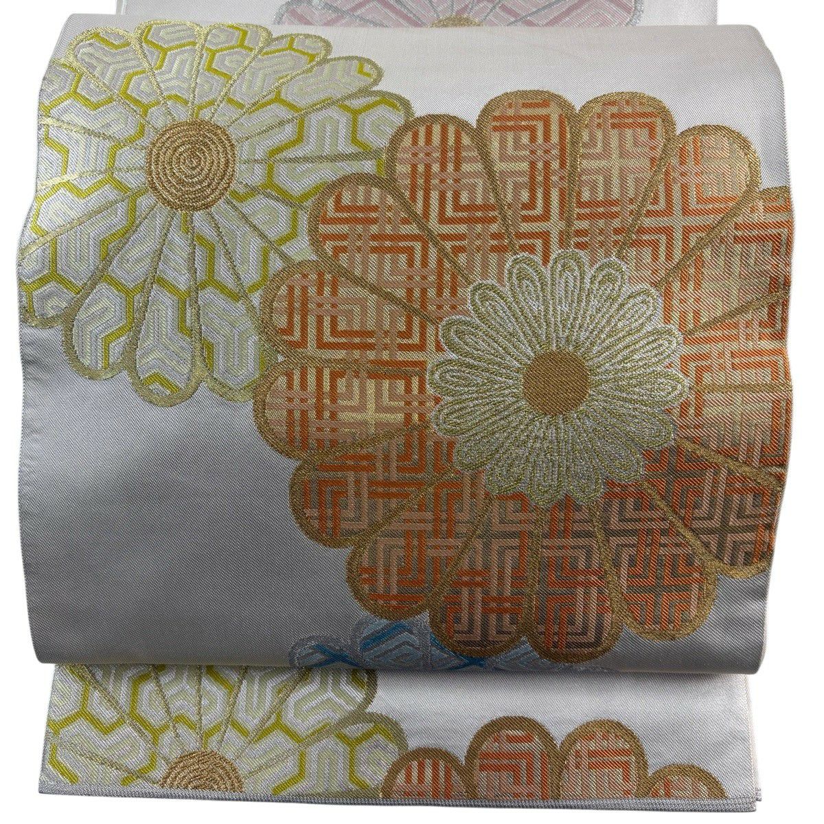 【美品】 袋帯 秀品 関西仕立て 変わり七宝 幾何学 金銀糸 箔 青灰色 六通 正絹