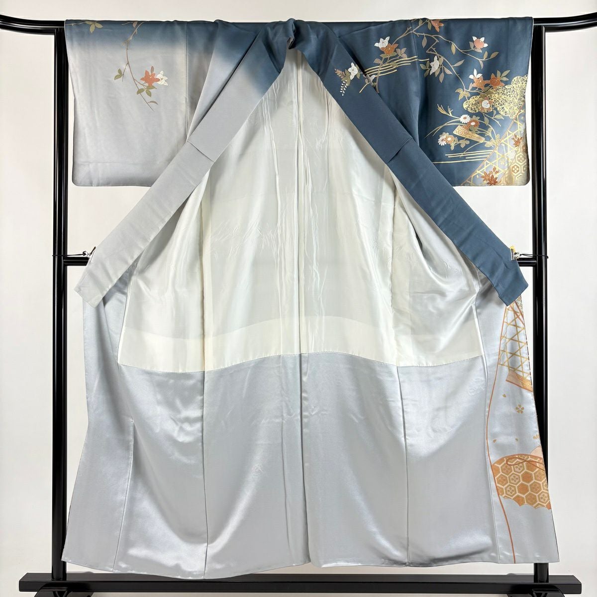 訪問着 身丈156cm 裄丈63.5cm S 袷 菊 流水 金彩 金糸 灰色 正絹 秀品
