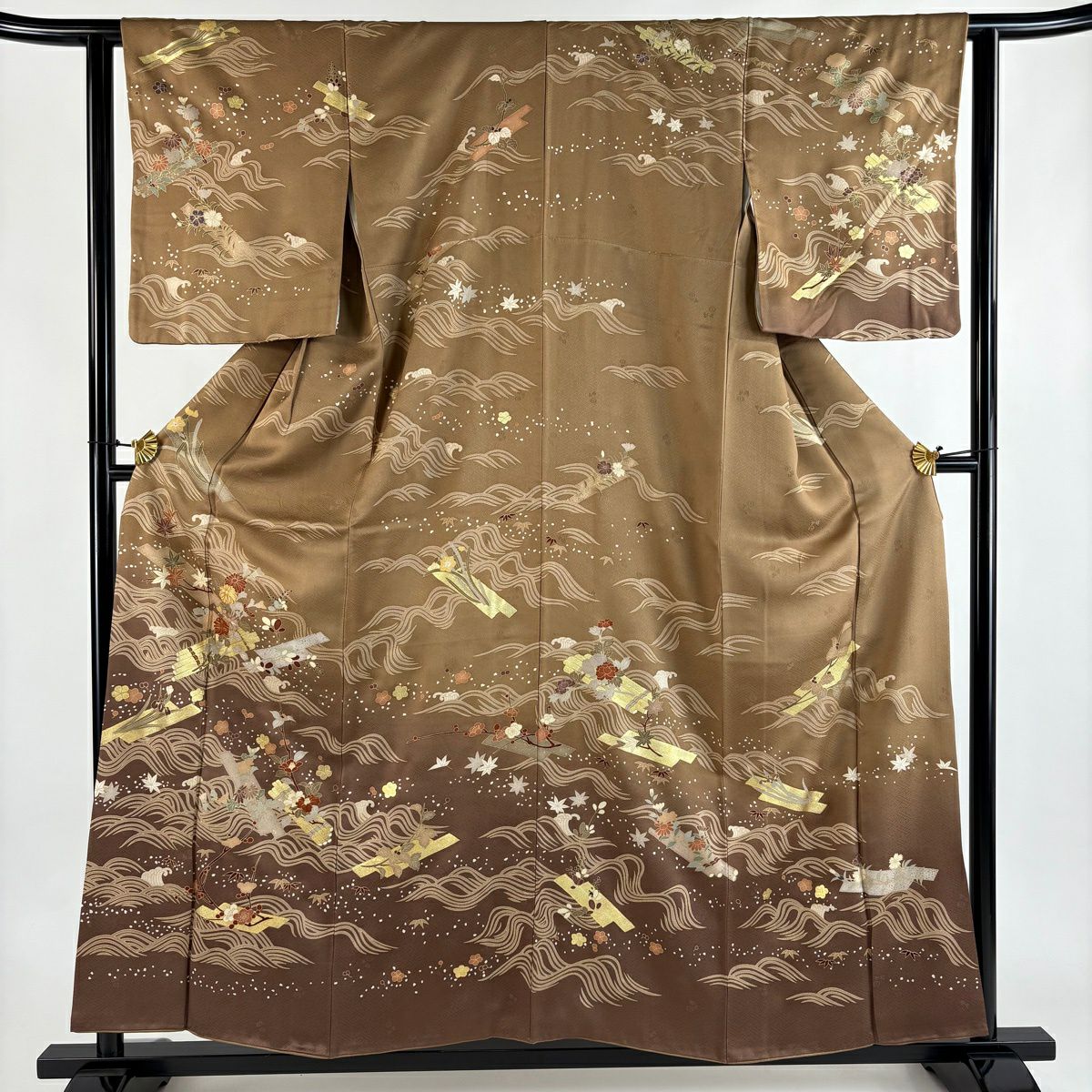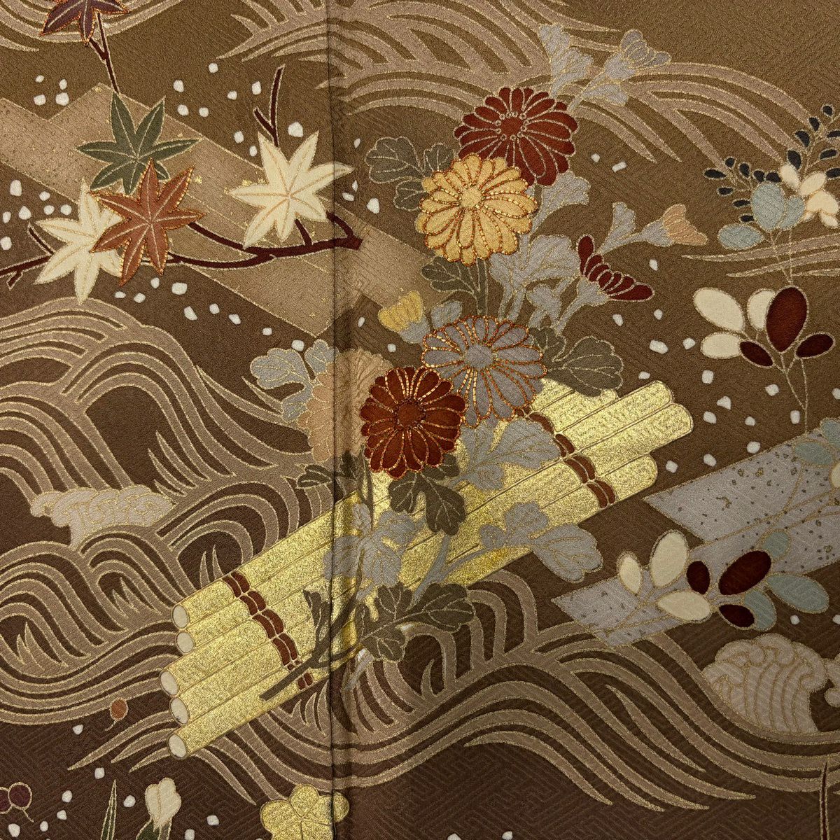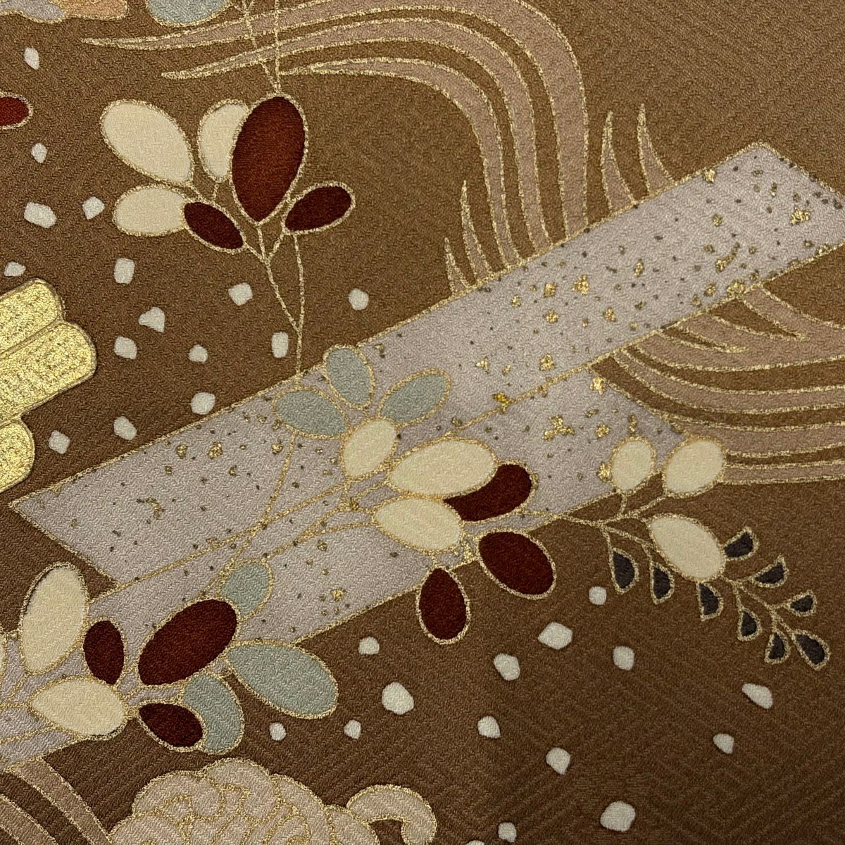訪問着 身丈160cm 裄丈65cm M 袷 草花 霞 箔 金銀彩 焦茶色 正絹 秀品