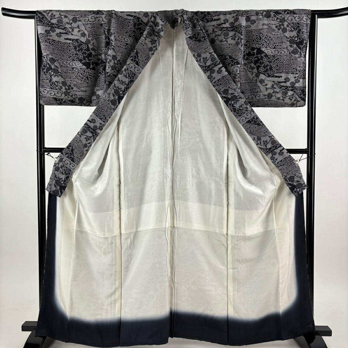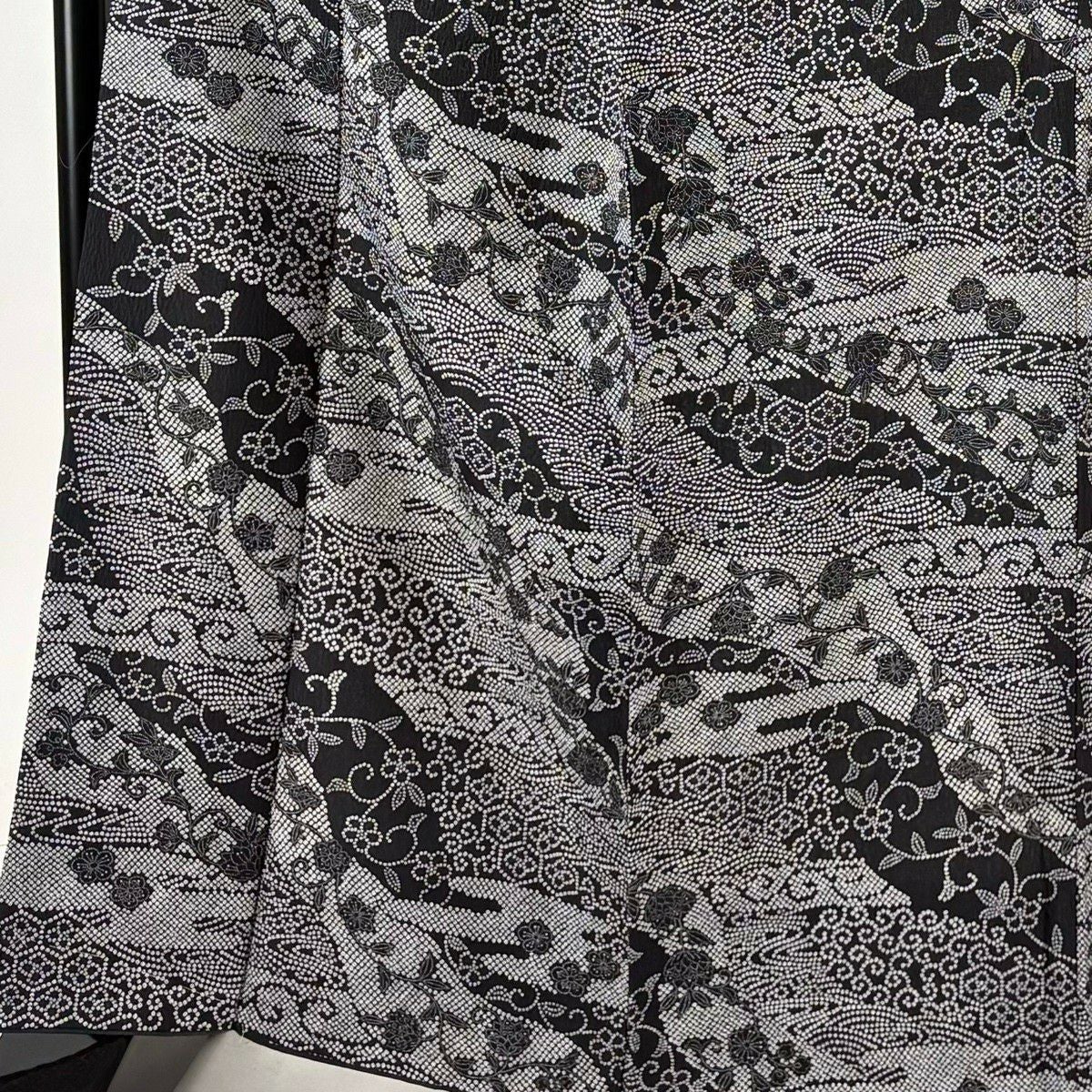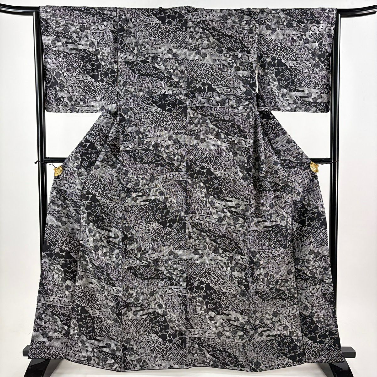 【美品】 紬 身丈154.5cm 裄丈63.5cm S 袷 草花 幾何学 黒灰 正絹 秀品