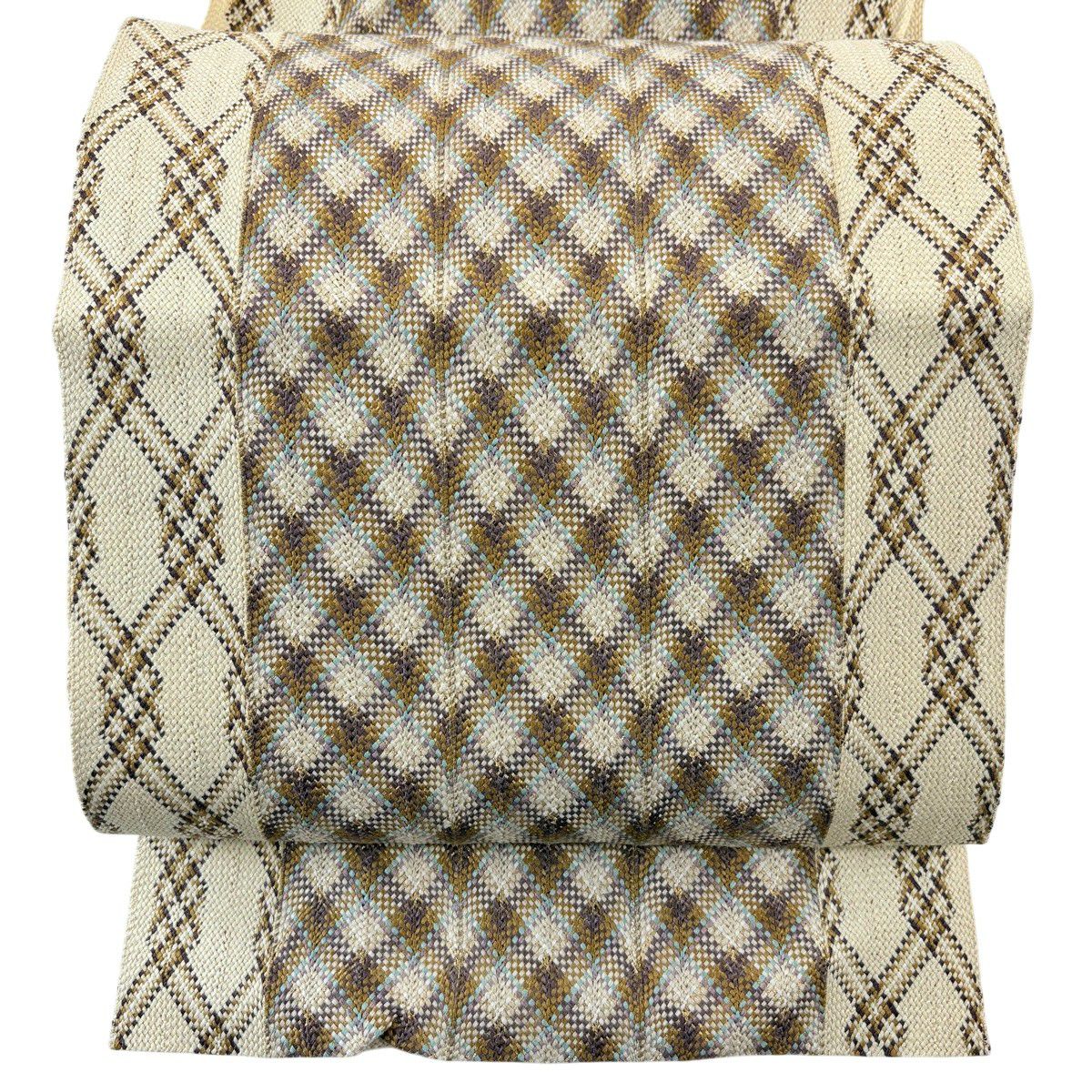 【美品】 名古屋帯 秀品 八寸名古屋帯 トンネル仕立て 縞 幾何学模様 ベージュ 正絹