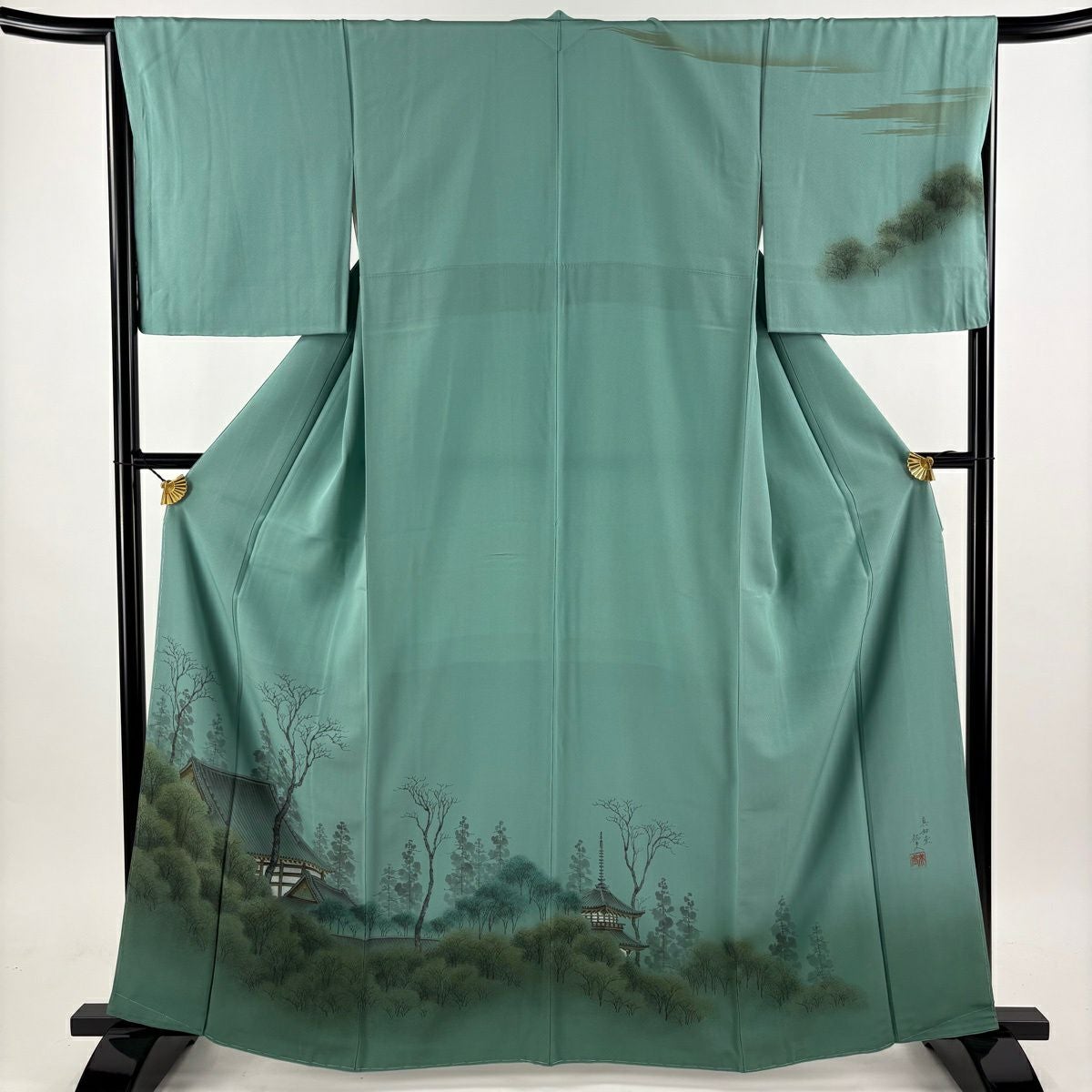 訪問着 身丈163cm 裄丈66cm M 袷 落款あり 家屋 草花 茶緑色 正絹 秀品