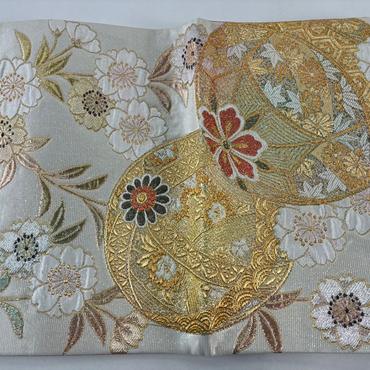 【美品】 名古屋帯 秀品 八寸名古屋帯 松葉仕立て 扇面 牡丹 金銀糸 ベージュ 正絹