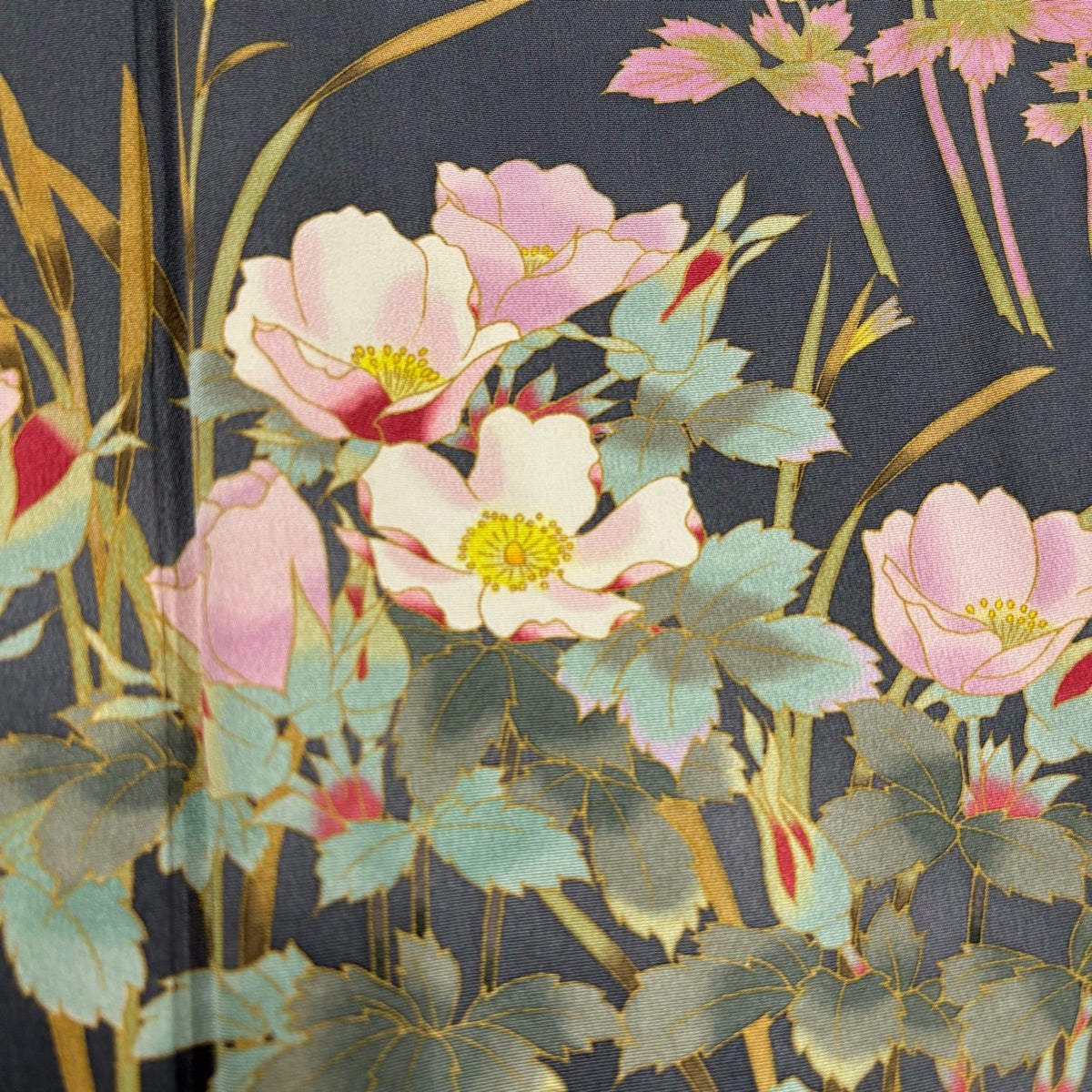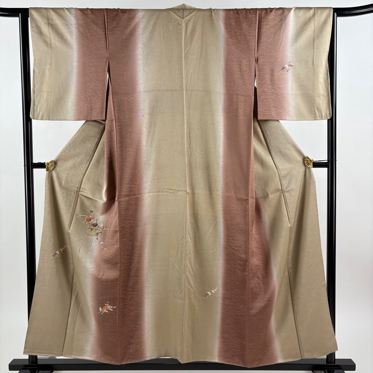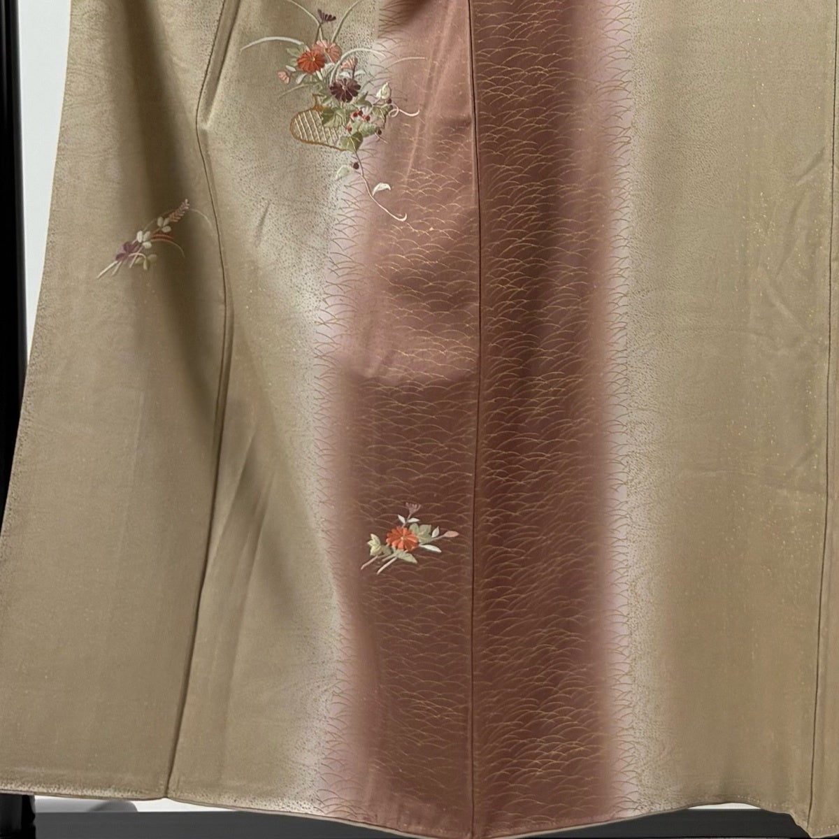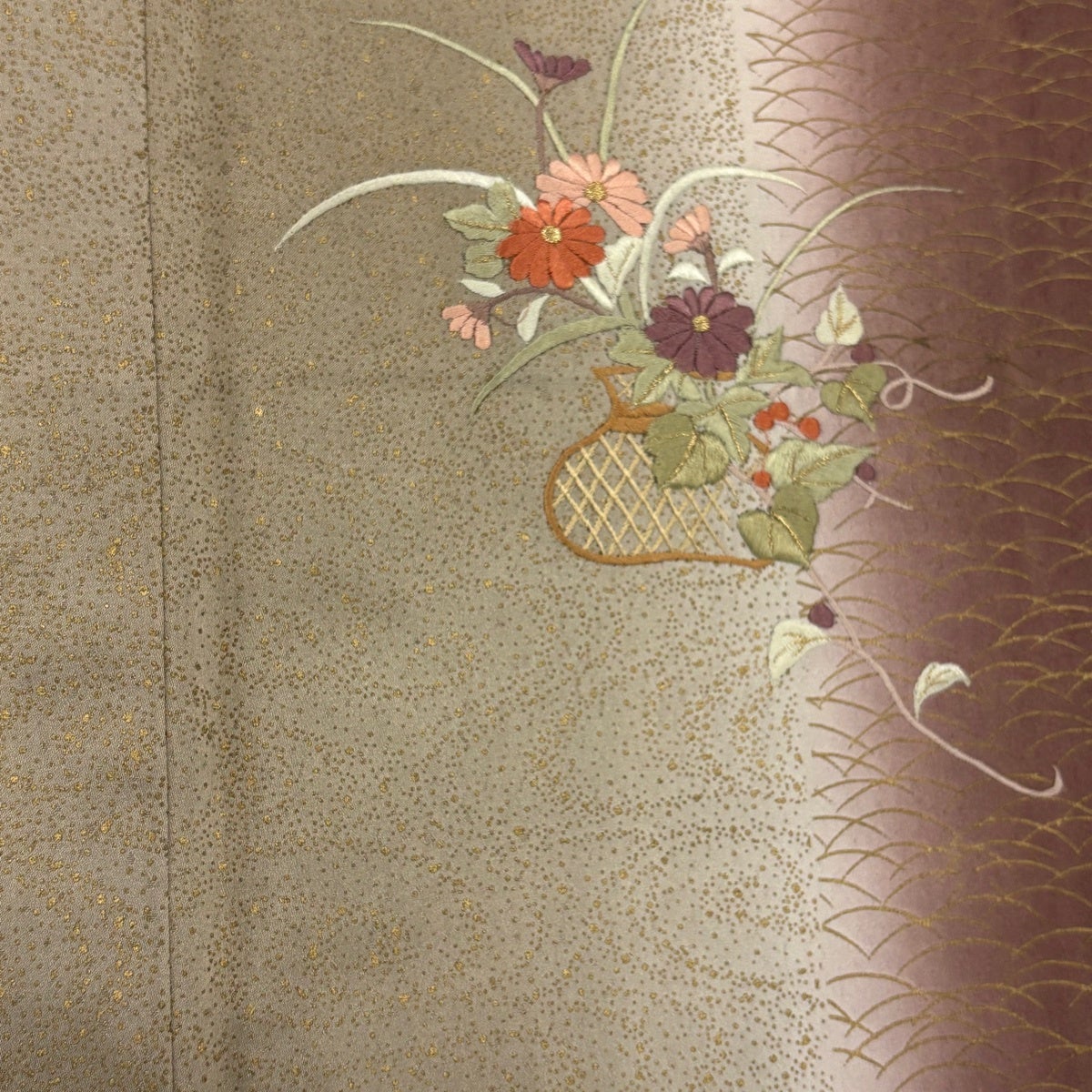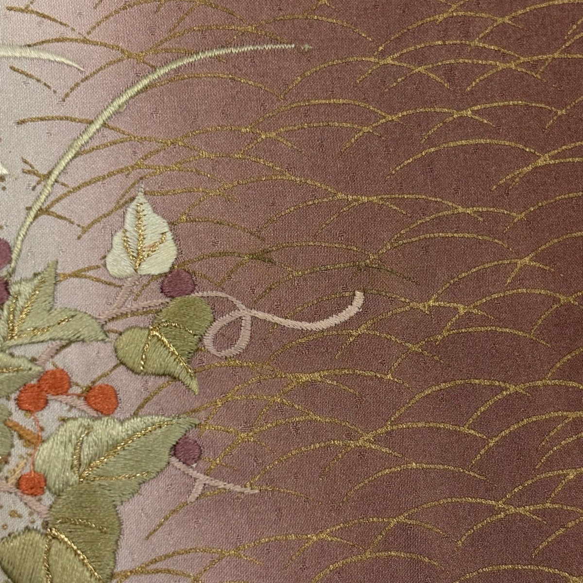 訪問着 身丈161cm 裄丈63cm S 袷 秋草 芝 刺繍 金彩 ピンク 正絹 秀品