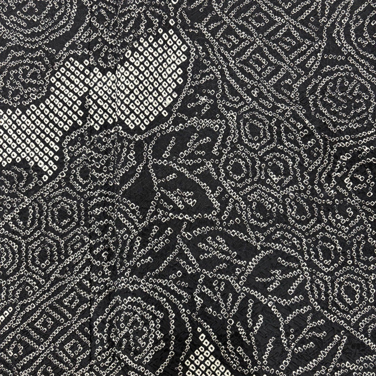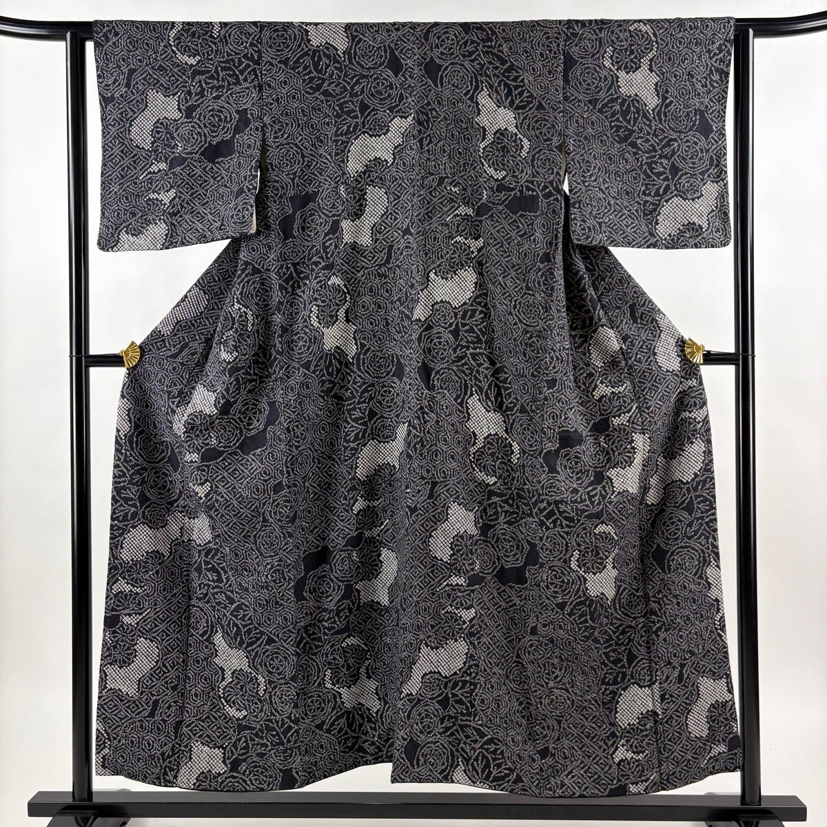 【美品】 小紋 身丈153cm 裄丈63cm S 袷 葉柄 亀甲 総絞り 黒灰 正絹 秀品