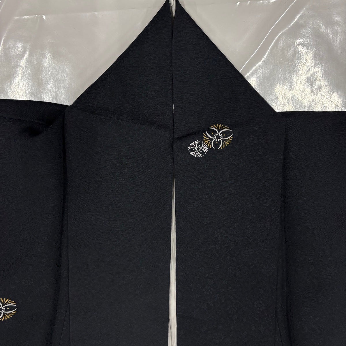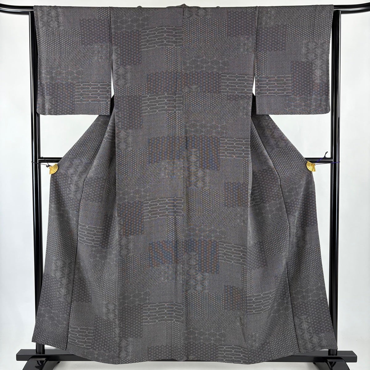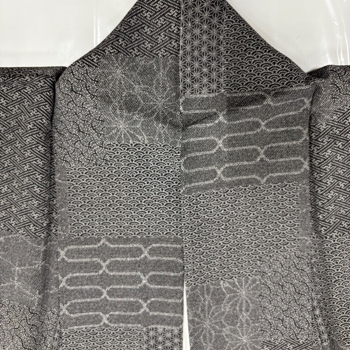 【美品】 小紋 身丈158cm 裄丈64cm M 袷 有職文様 寄せ柄 黒灰 正絹 秀品