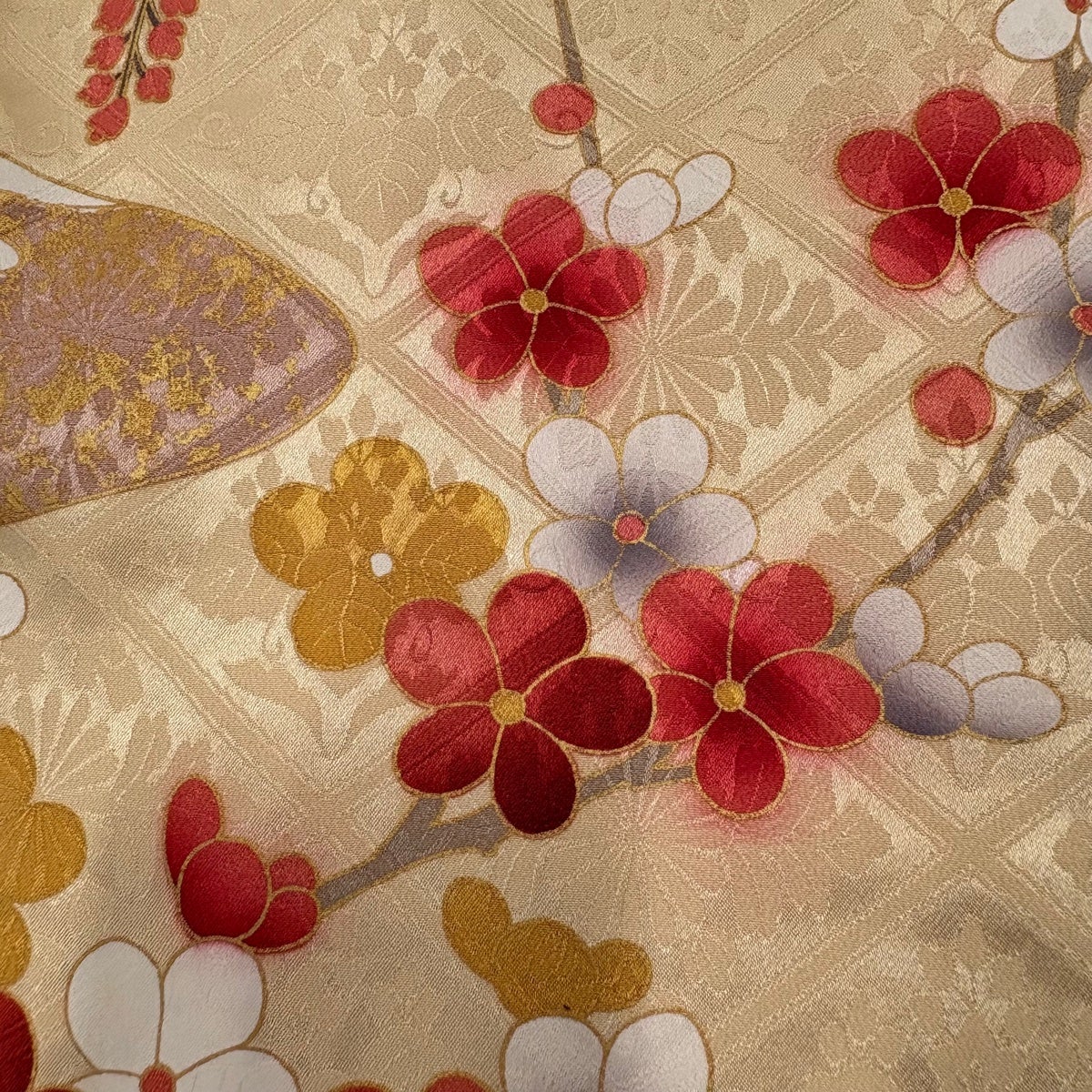 【美品】 小紋 身丈157cm 裄丈65cm M 袷 梅 ヱ霞 ベージュ 正絹 秀品