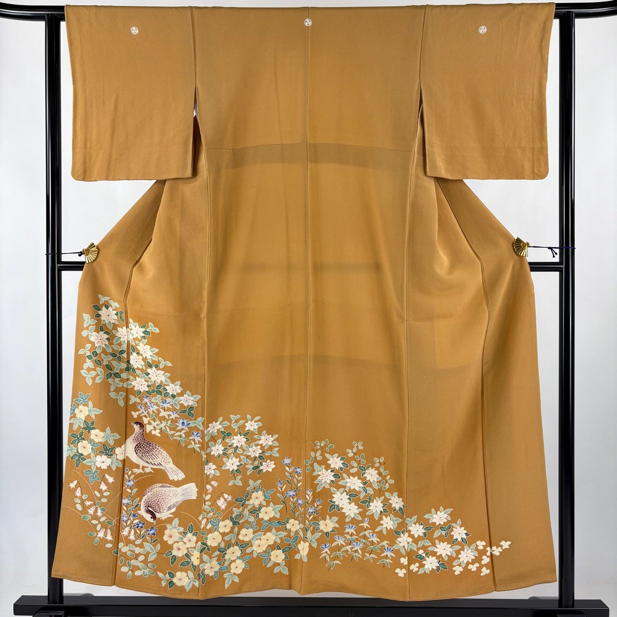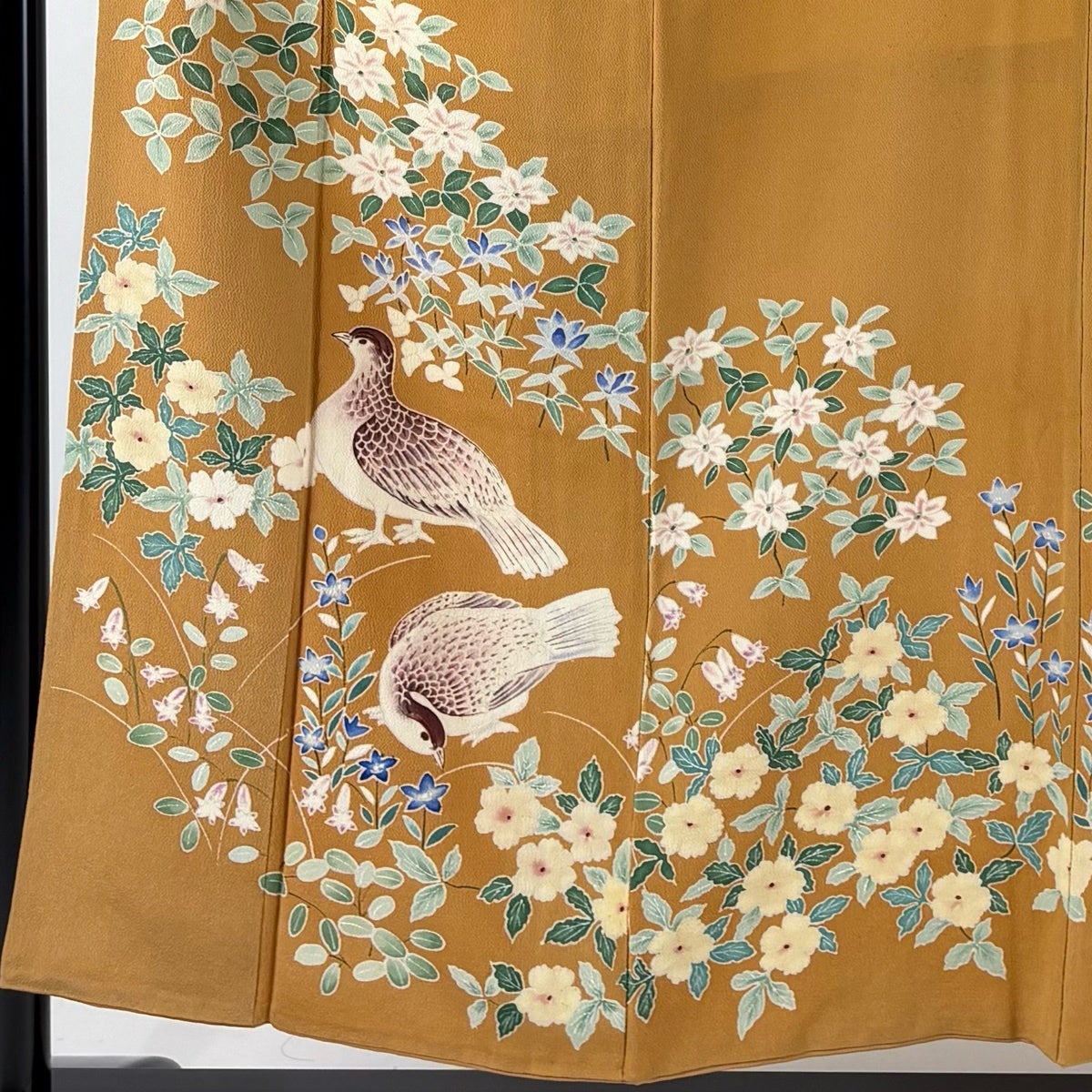 色留袖 身丈155cm 裄丈61cm S 袷 鳥 草花 縮緬 山吹色 正絹 秀品 三つ紋