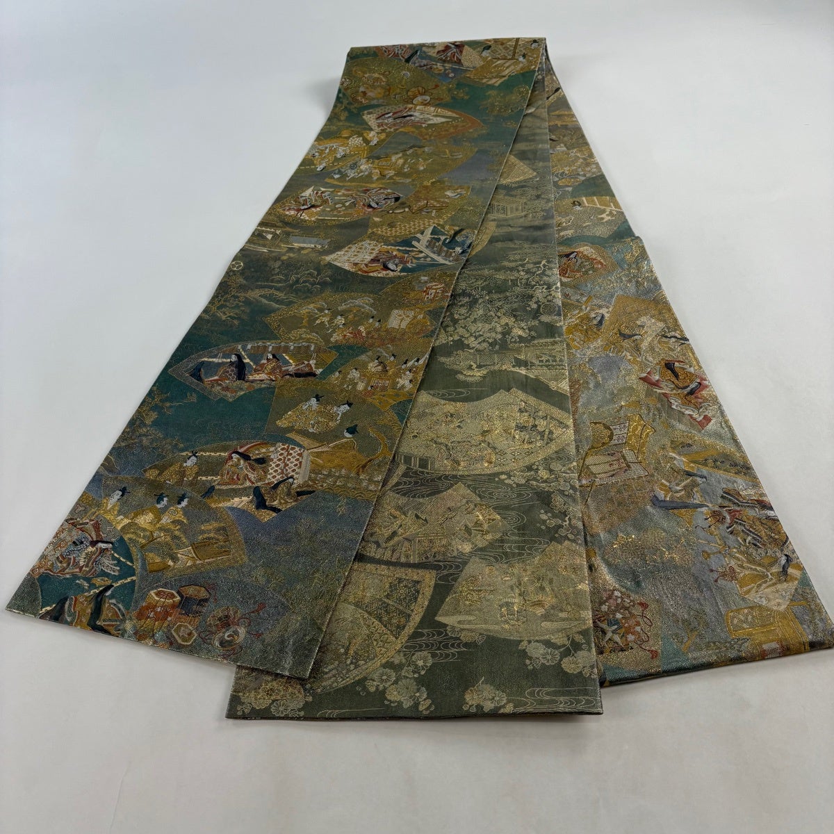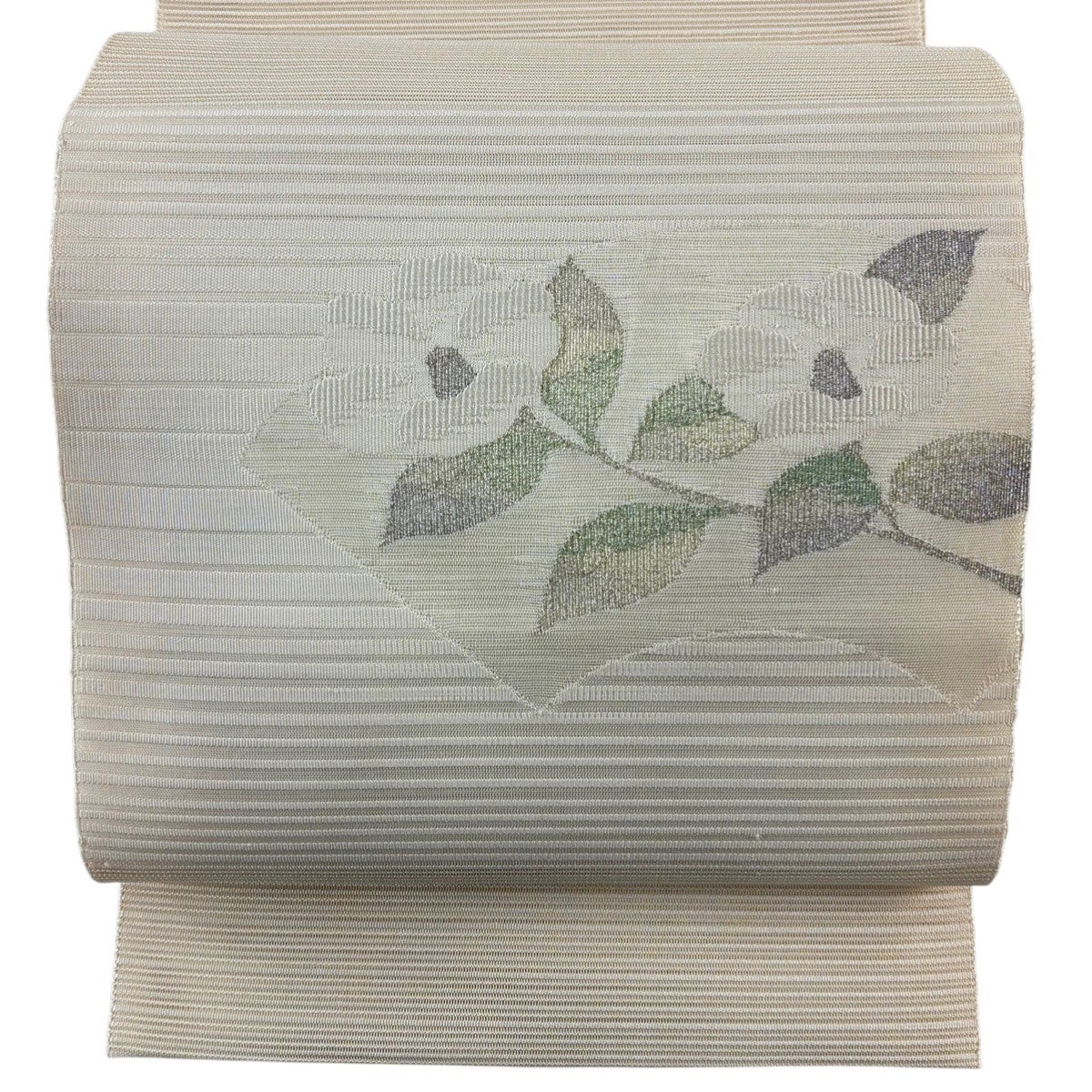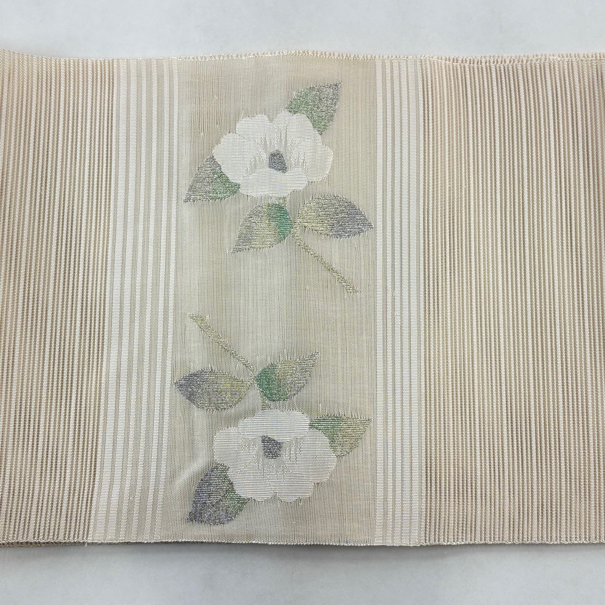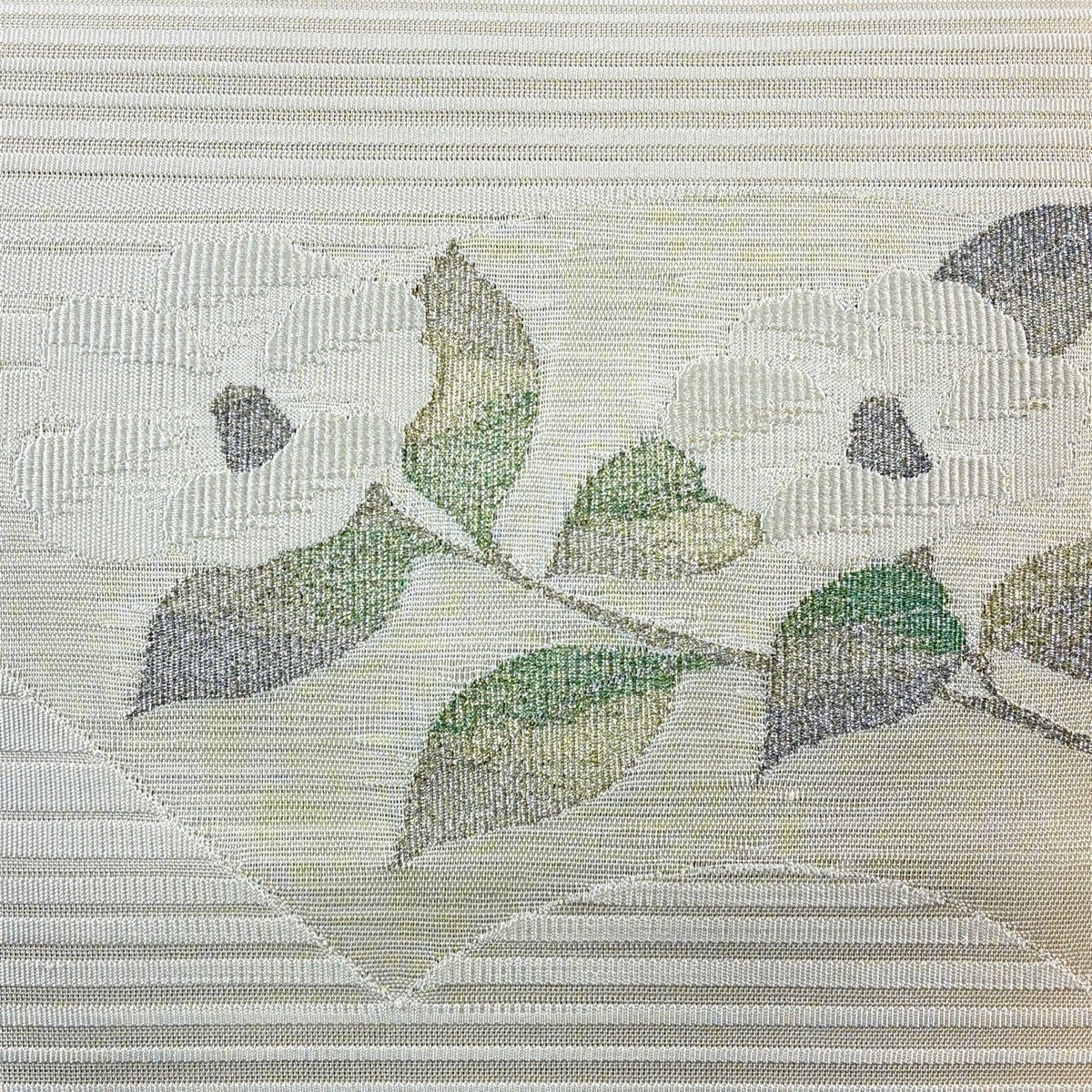 名古屋帯 秀品 夏帯 絽 八寸名古屋帯 松葉仕立て トンネル仕立て 椿 扇面 箔 クリーム 正絹